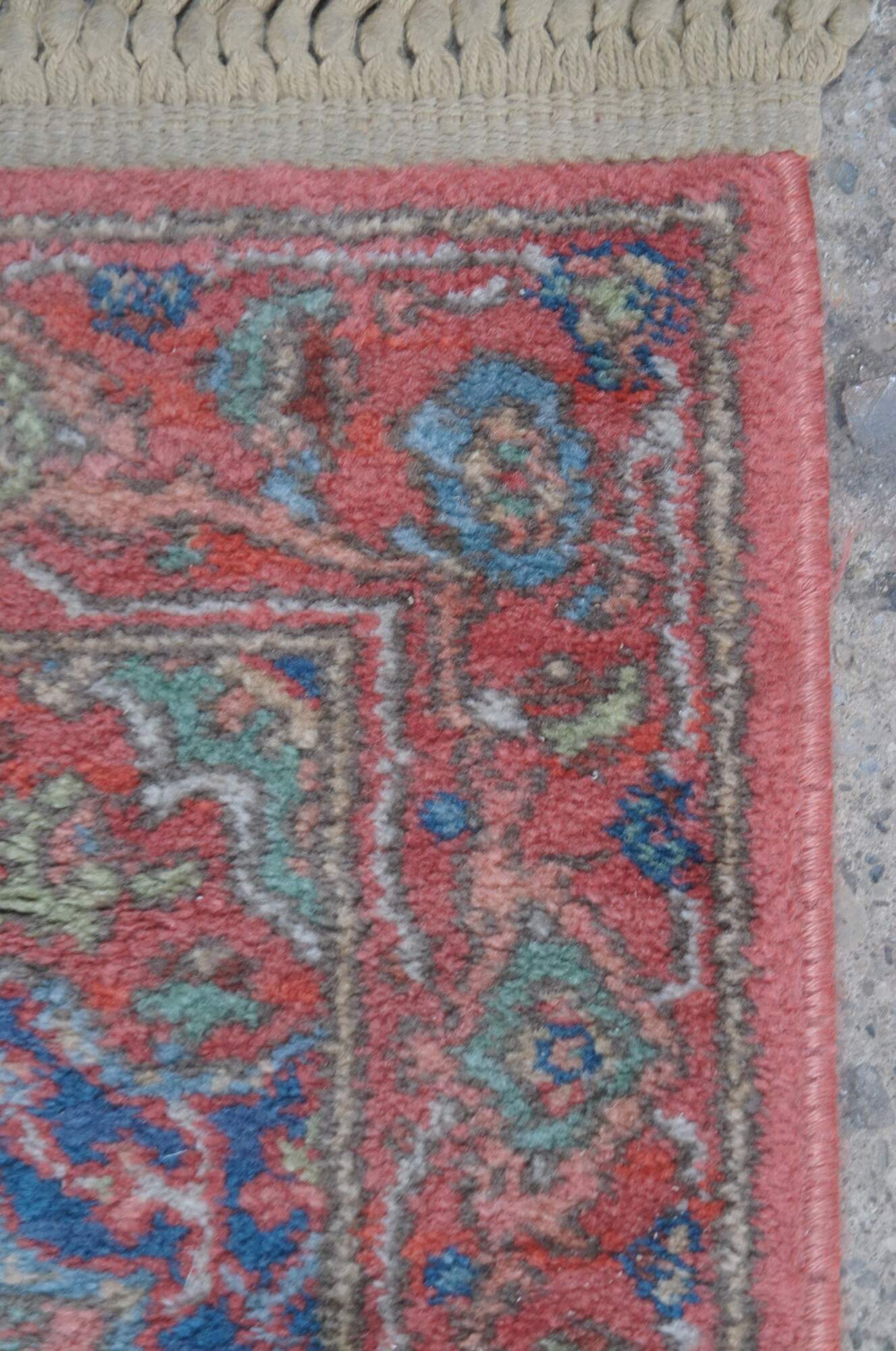 Karastan Design No. 736, Medallion Serapi. Made of 100% Wool with a pink background covered in sahdes of blue and pink.