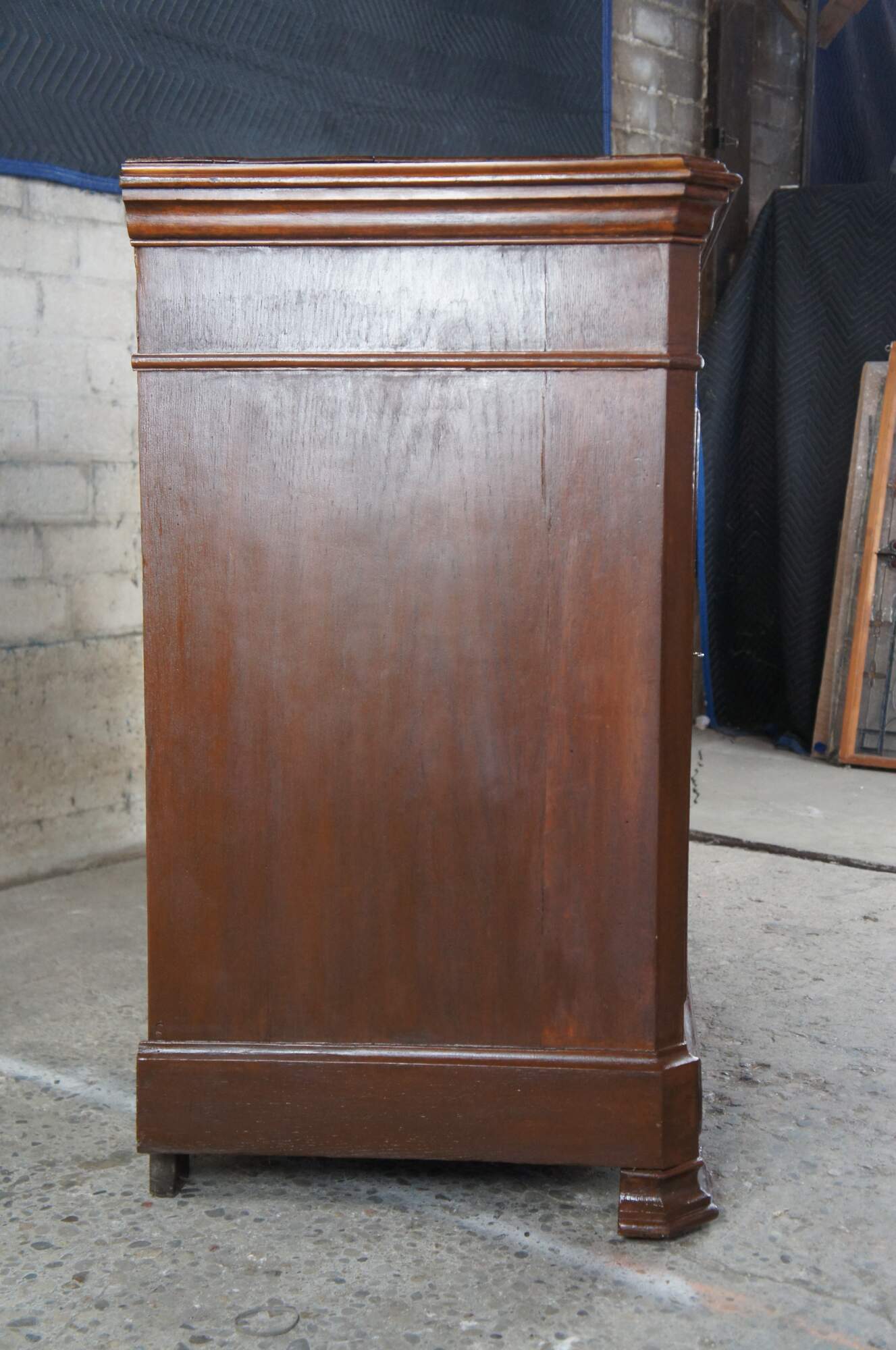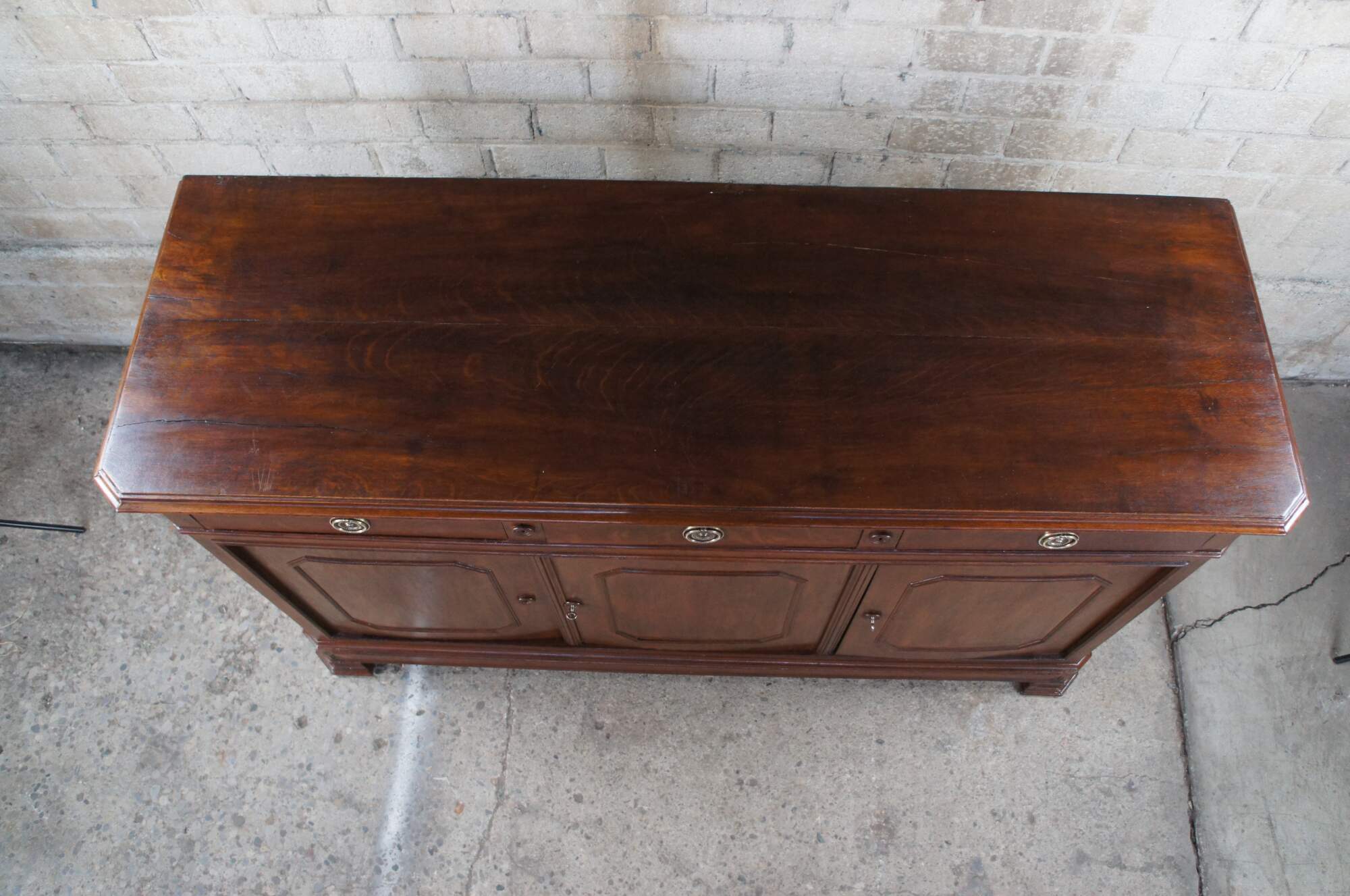 A lovely antique Louis Philipe style sideboard from Belgium. Made from quartersawn oak with three upper hand dovetailed drawers and lower cabinets with shelf. Cabinet moldings and lower apron feature a unique Octagonal design. Drawers are accented with brass ring pulls. Lower cabinets are lockable.