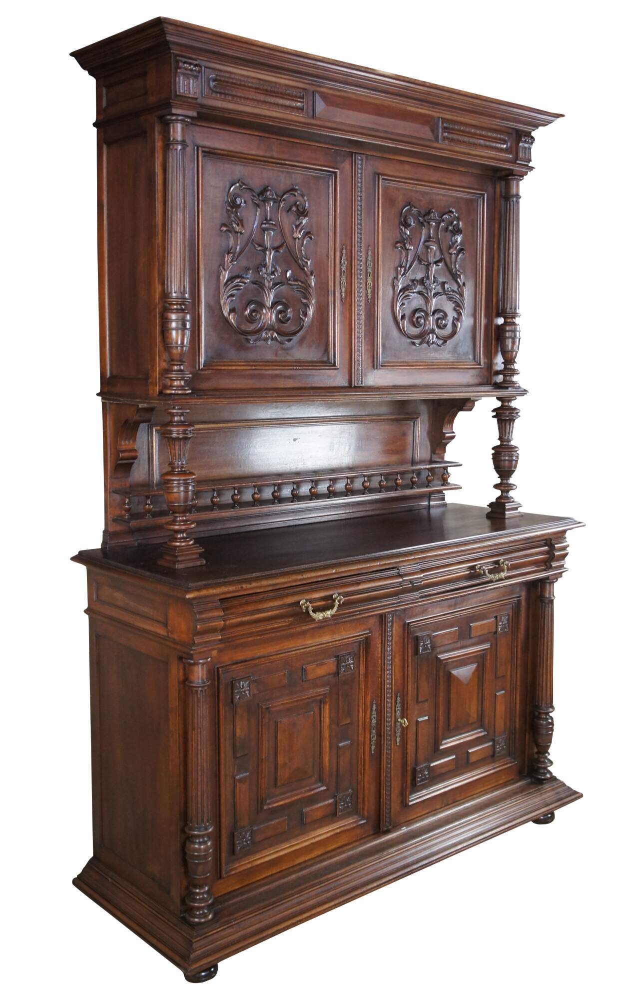 An impressive Renaissance Revival / Henry II style Buffet, bar back or server with hutch. A rectangular form made from walnut with two cabinets for storage, hand dovetailed drawers and a central serving area. Features hand turned fluted columns, geometric acanthus foliate carvings, a spindled gallery along the back, raised lower door moldings with French medallions and bun feet. Each cabinet includes one adjustable shelf.