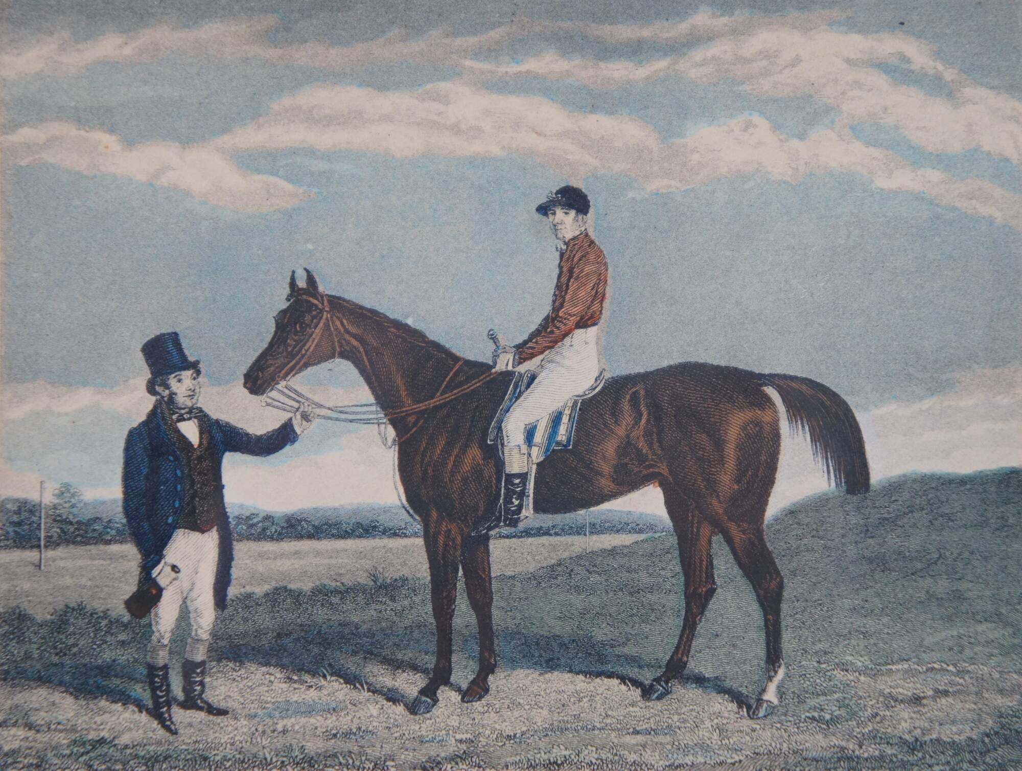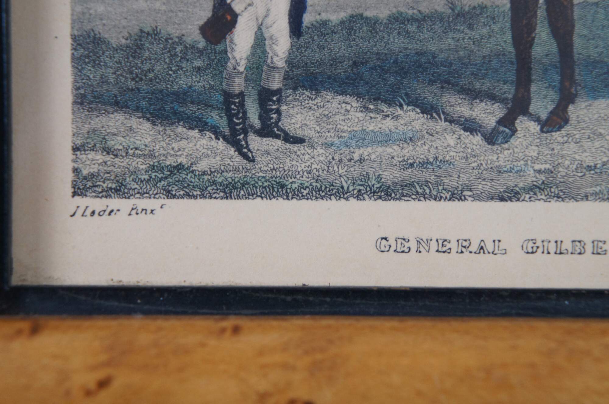 Antique 19th century hand colored equestrian engraving titled “General Gilbert on Vision,” showing General Gilbert in jockey or fox hunting attire mounted on a brown horse, held by a man servant holding a bottle of liquor. Original painted by James Loder; engraving by J.R. Scott. Published by Pittman, Warwick Square, London. Antique walnut frame.
