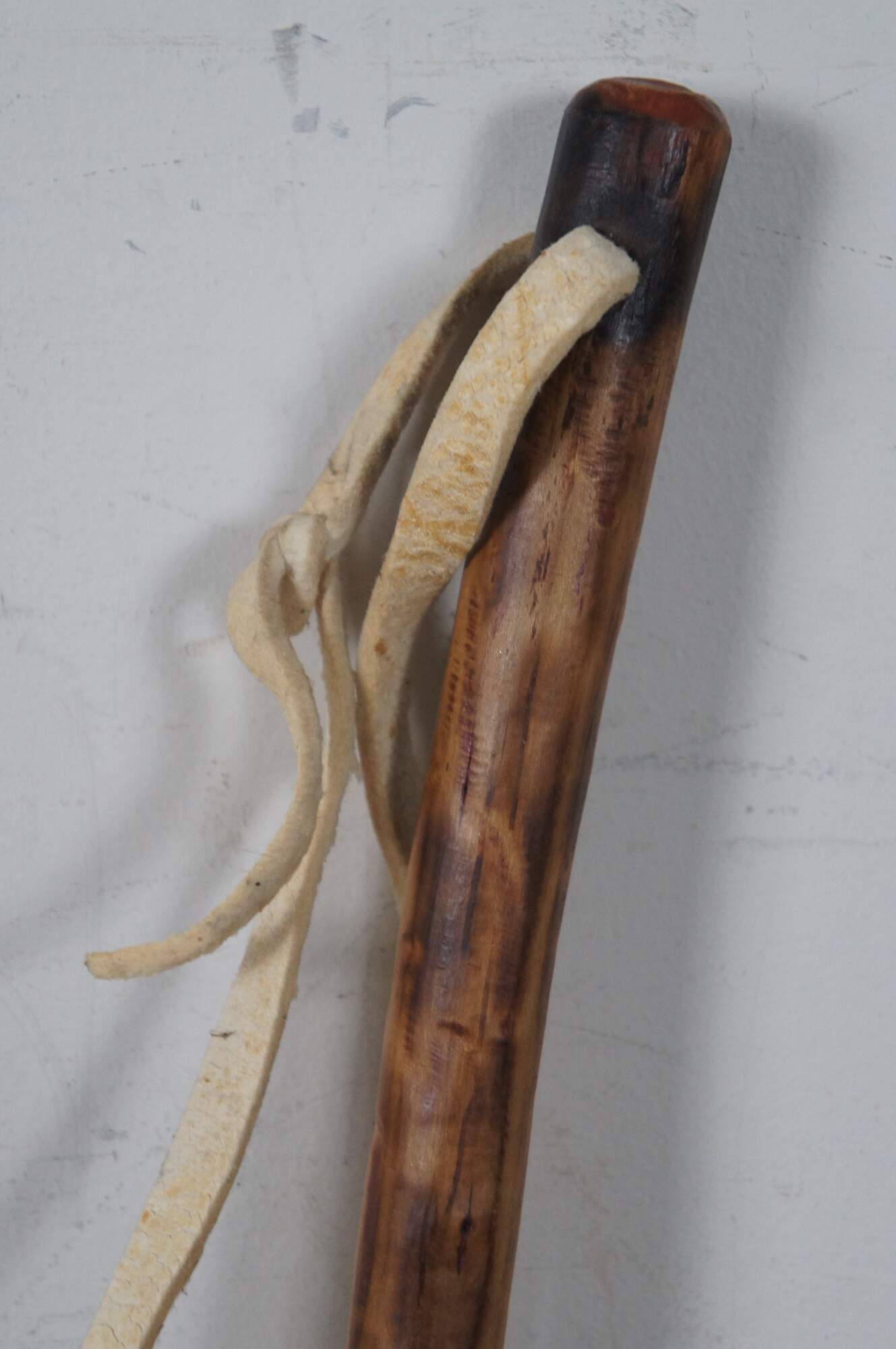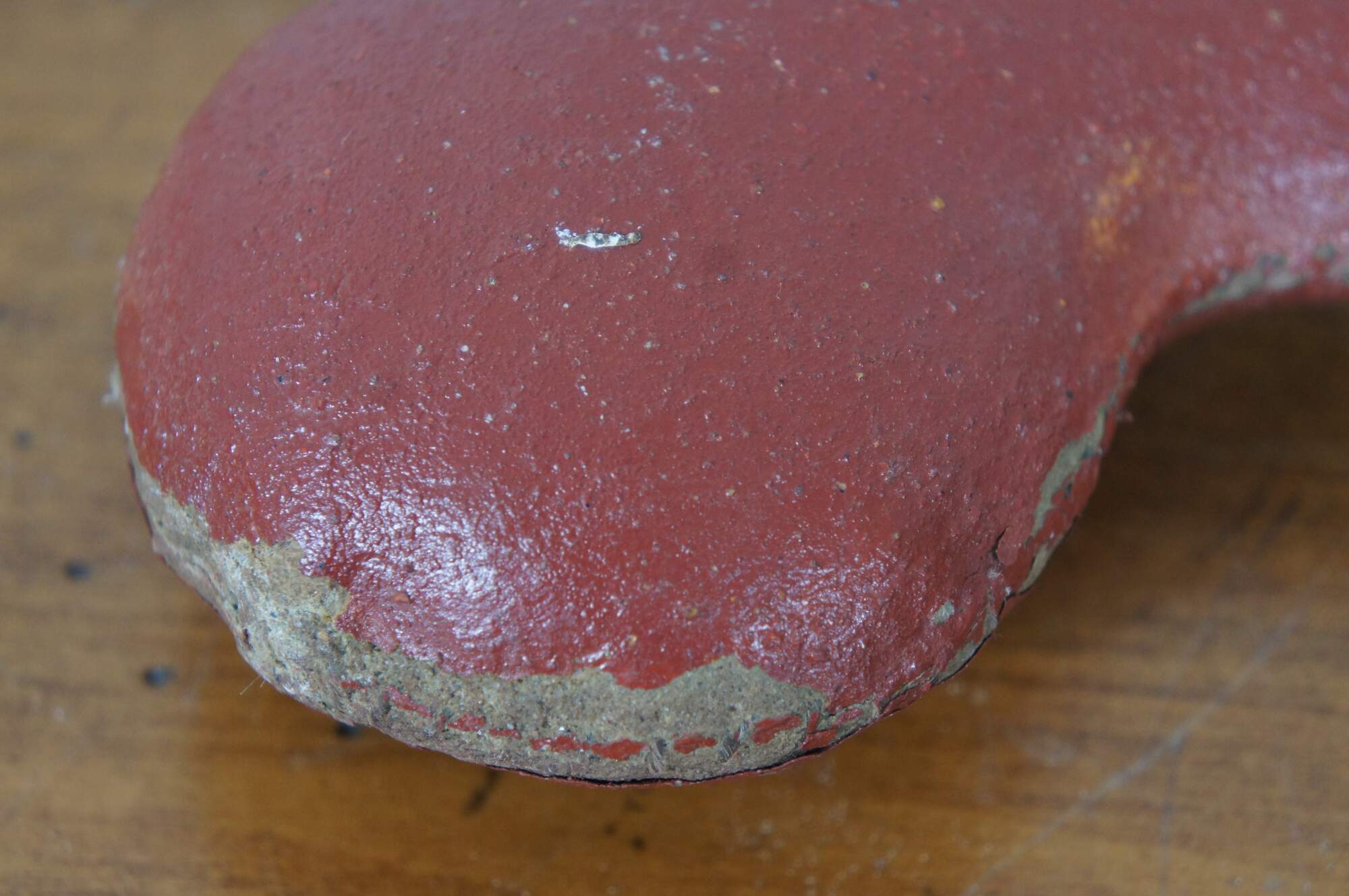 Vintage Native American ceremonial dance / war club tomahawk with heavy studded concrete / stone head painted in red with wood branch handle and decorated with wrapped horse hair.
