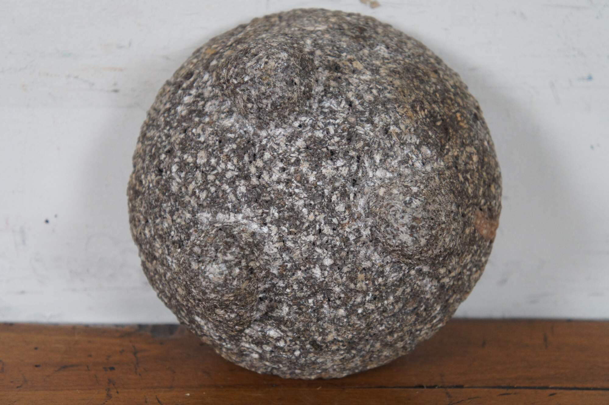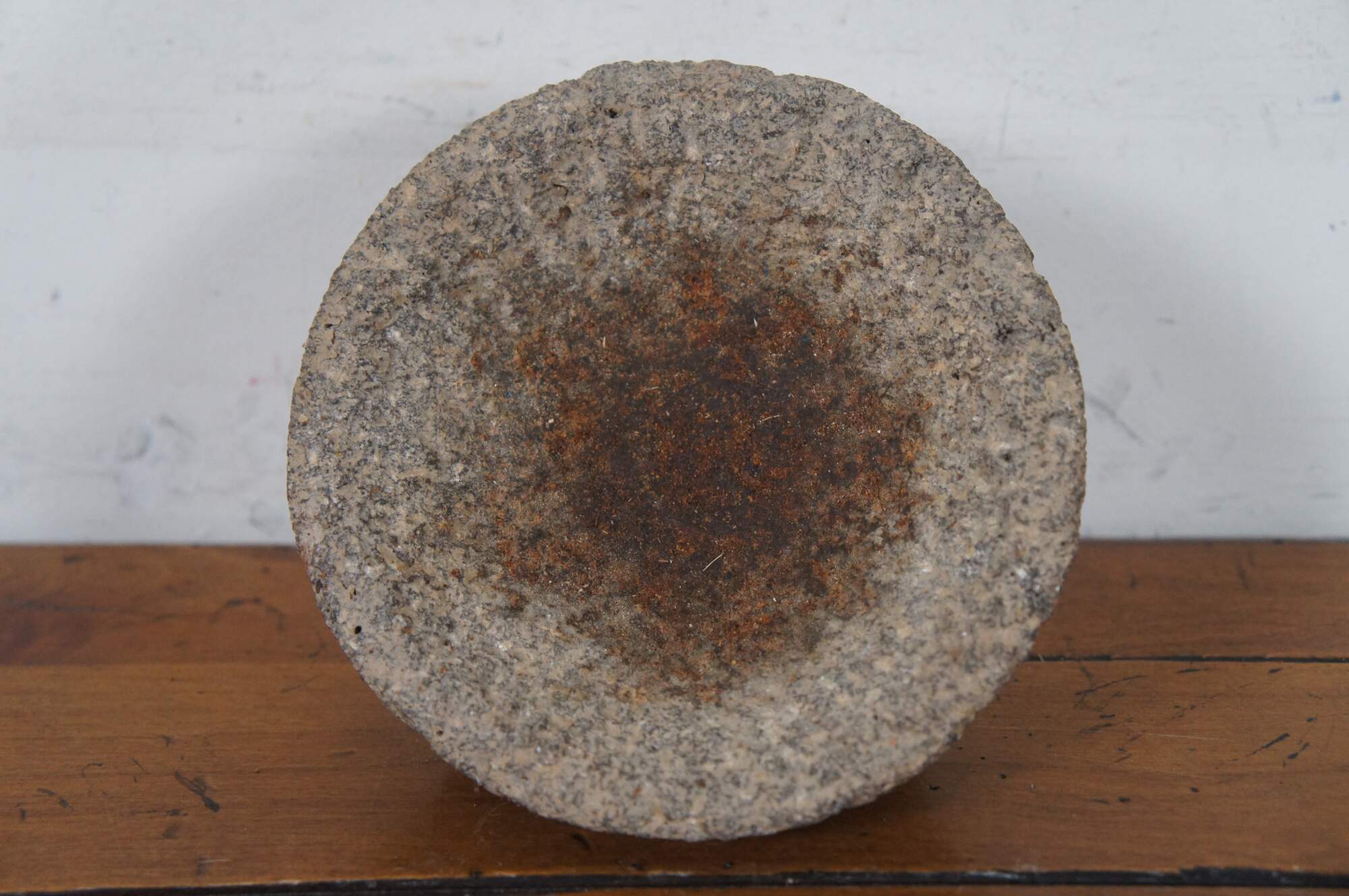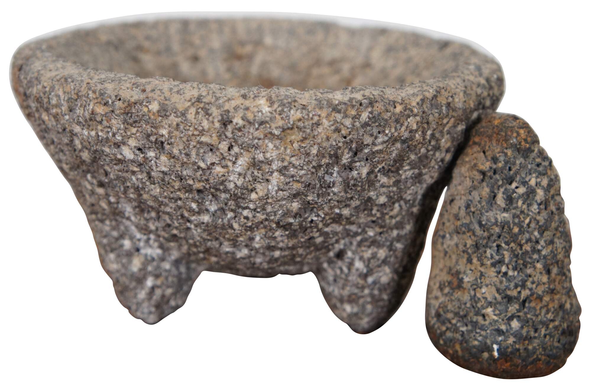 Vintage hand made Mexican molcajete lava stone round, three footed mortar and oblong pestle.