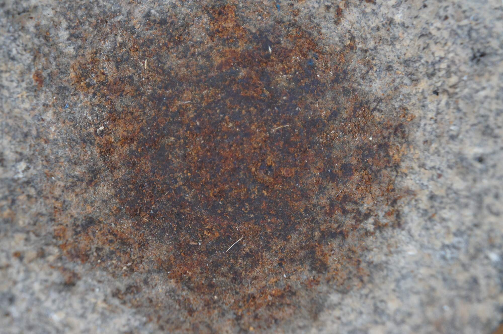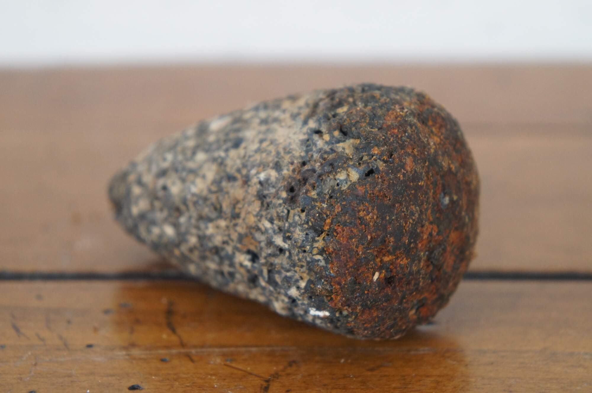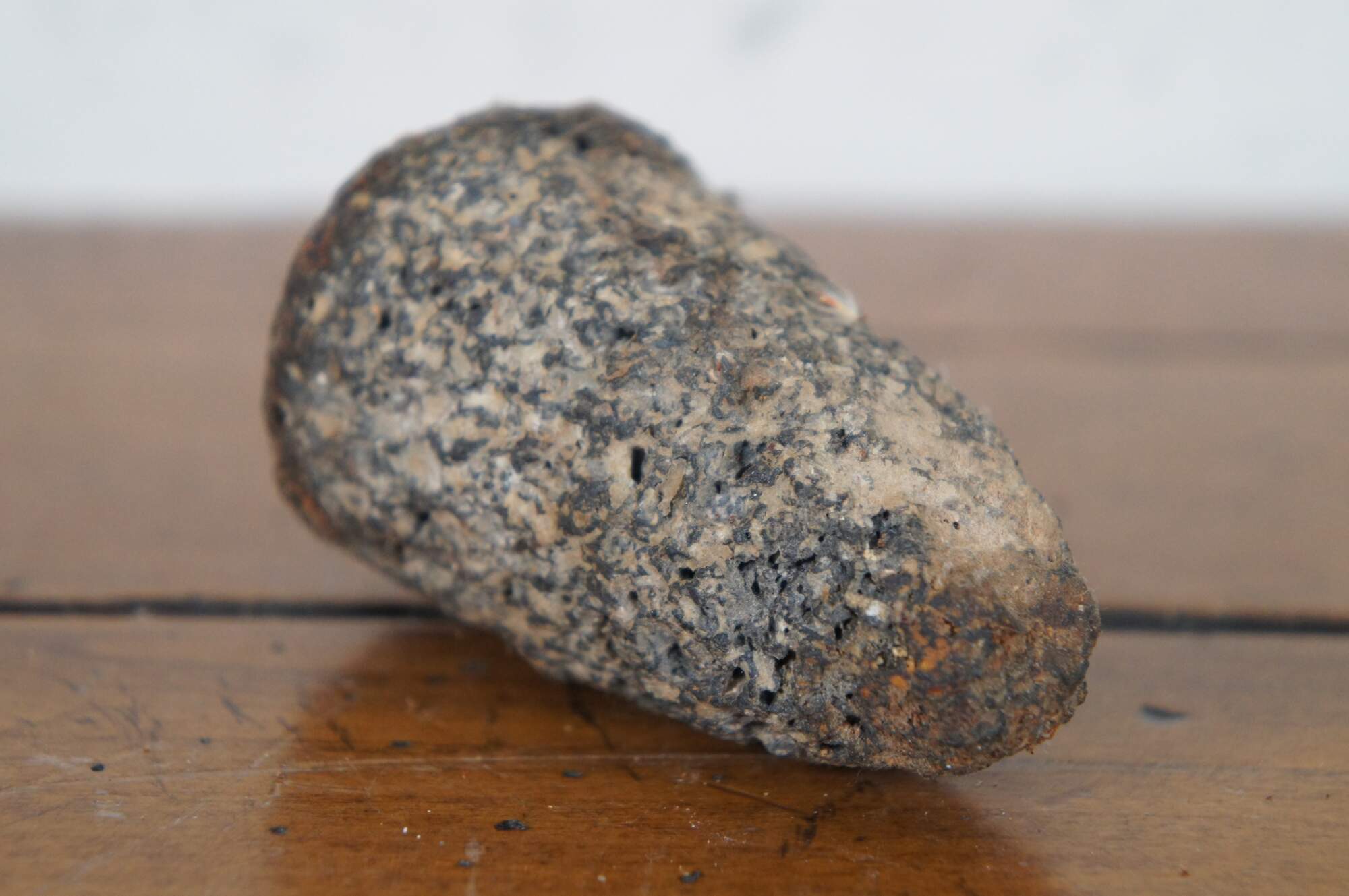Vintage hand made Mexican molcajete lava stone round, three footed mortar and oblong pestle.