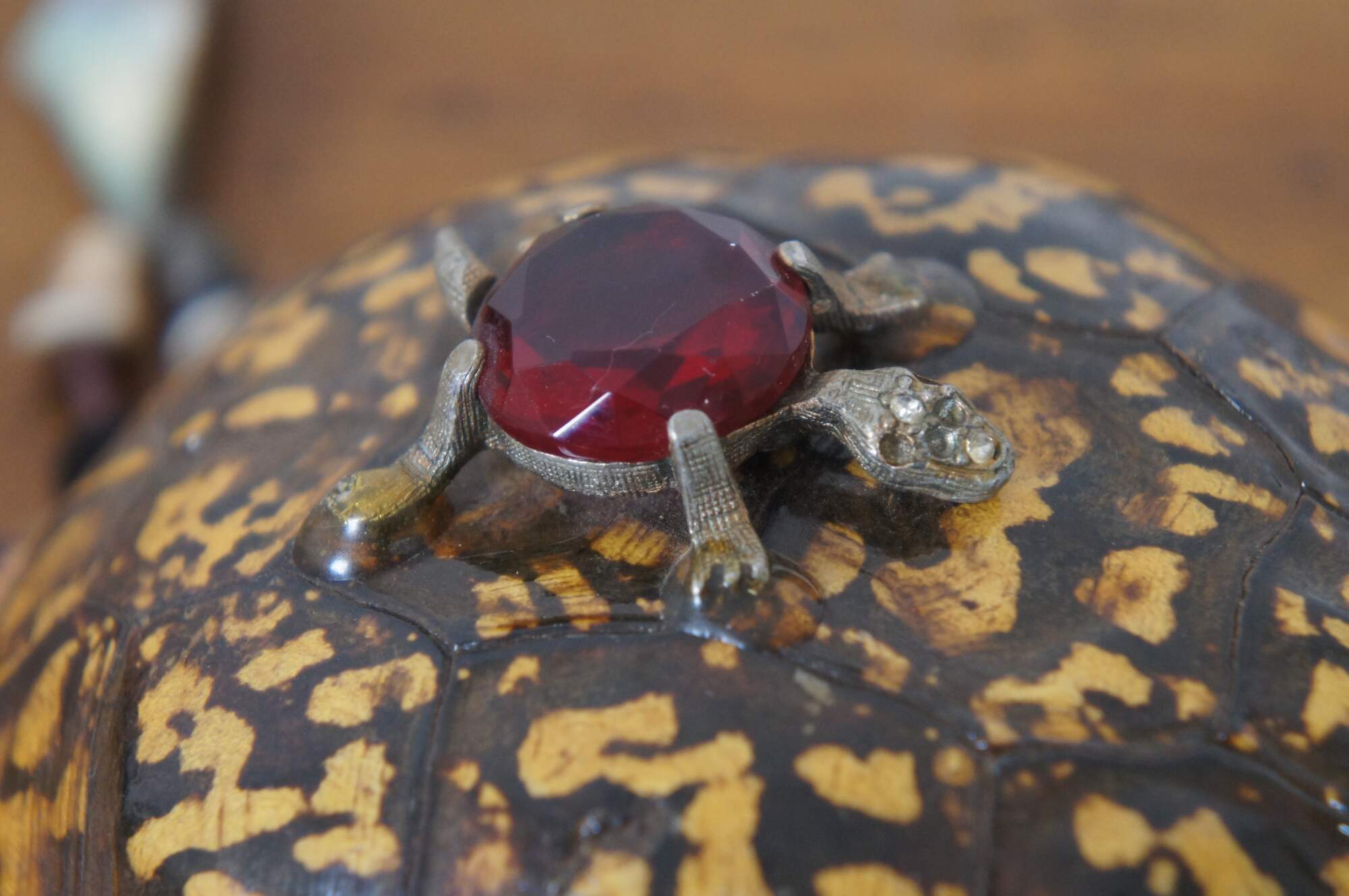 Vintage Native American ceremonial rattle / shaker fashioned out of the shell of a box turtle on a wooden dowel, accented with a silver tone and red rhinestone turtle and abalone shell dangle.