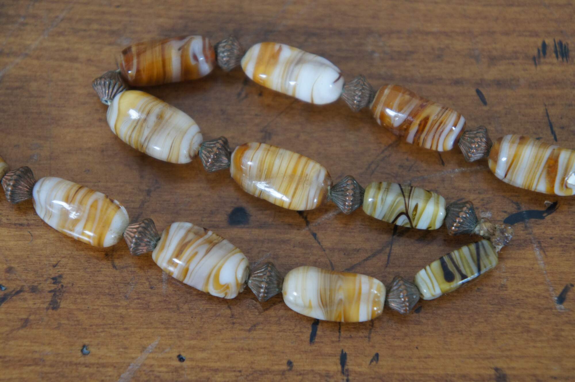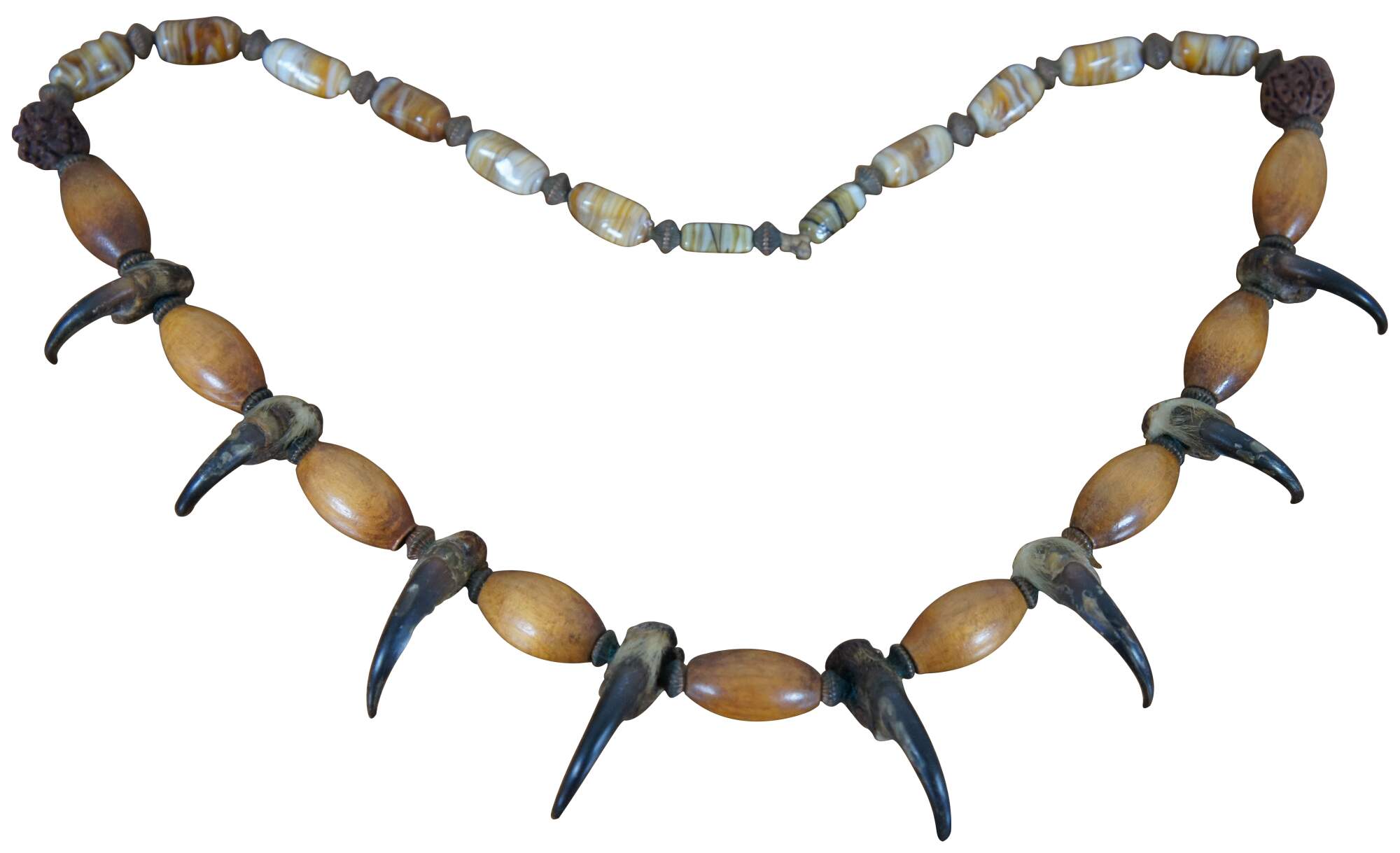 Antique Native American beaded necklace crafted with polished stones, carved wood beads, Muki Rudraksha beads and natural bird claws or talons.