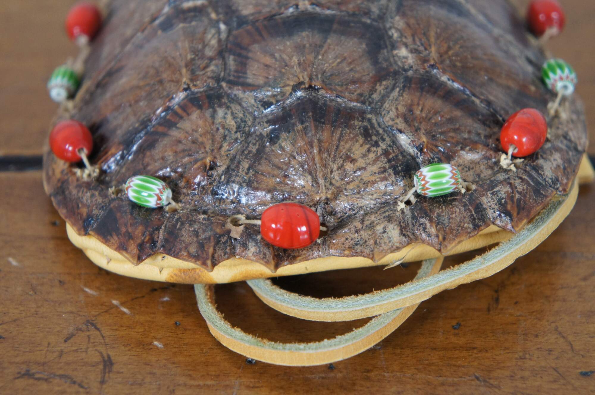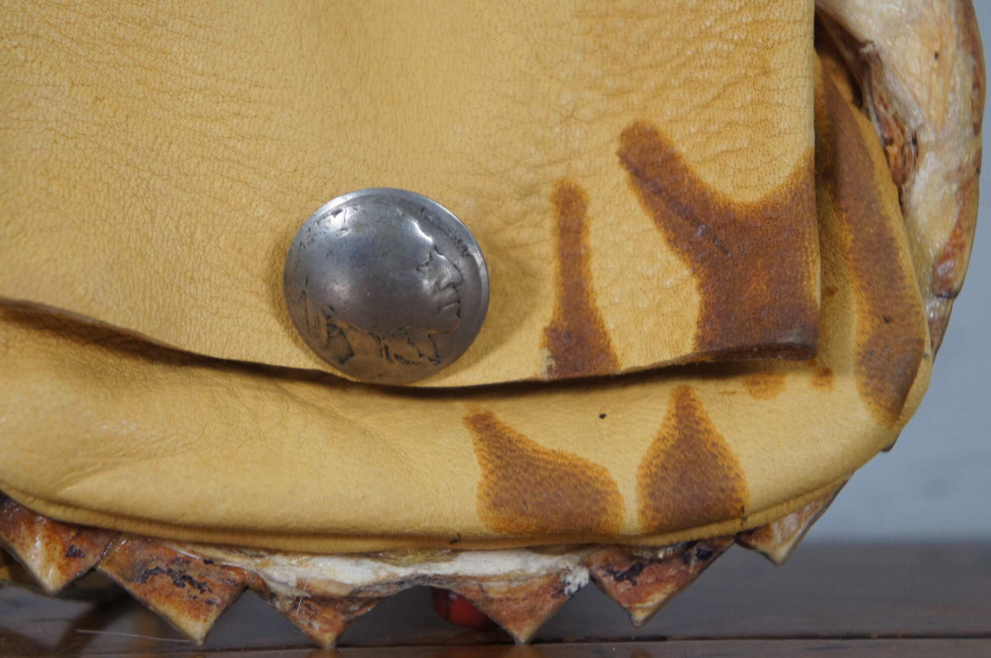 Vintage Native American style medicine bag or pouch fashioned out of the shell of a box turtle and buckskin leather, decorated around the edge with red and green beads and buttons made out of “Indian Head” / Buffalo nickels. Inside flap of pouch marked “Bill Rita 11-29-95” and a turtle.