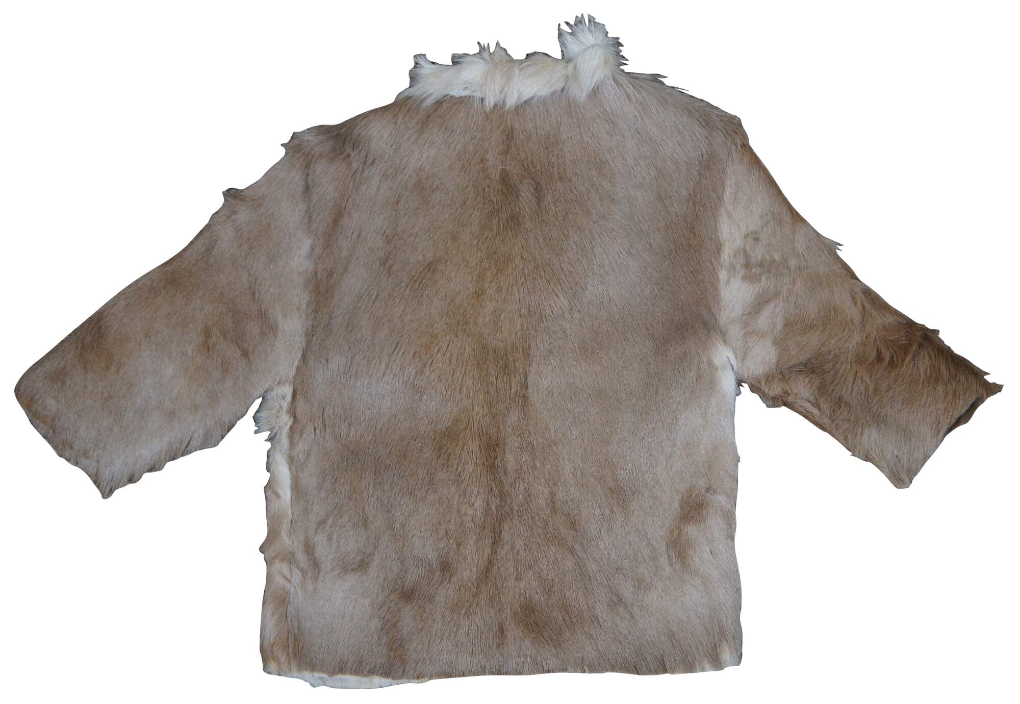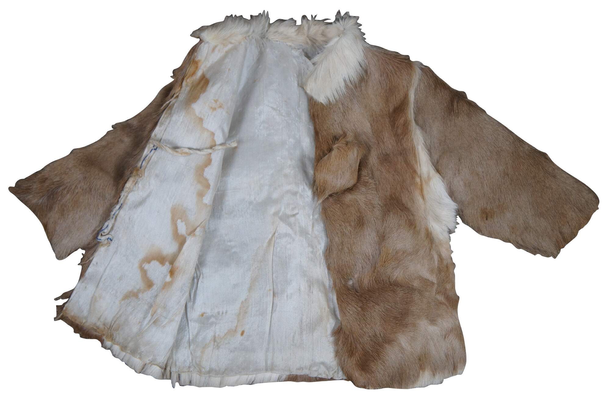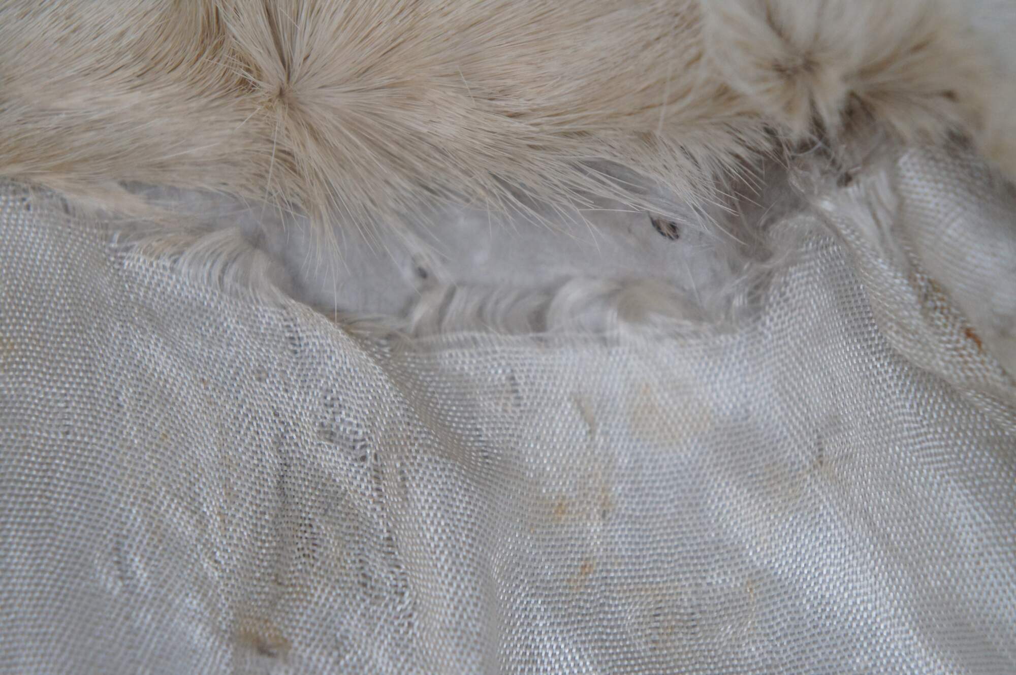Mid century baby or child sized brown rabbit fur coat or jacket with white collar and white fabric lining.