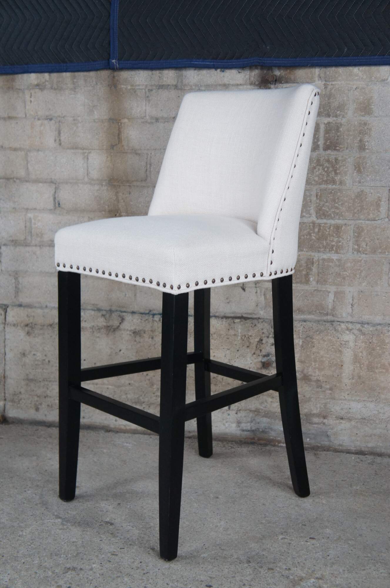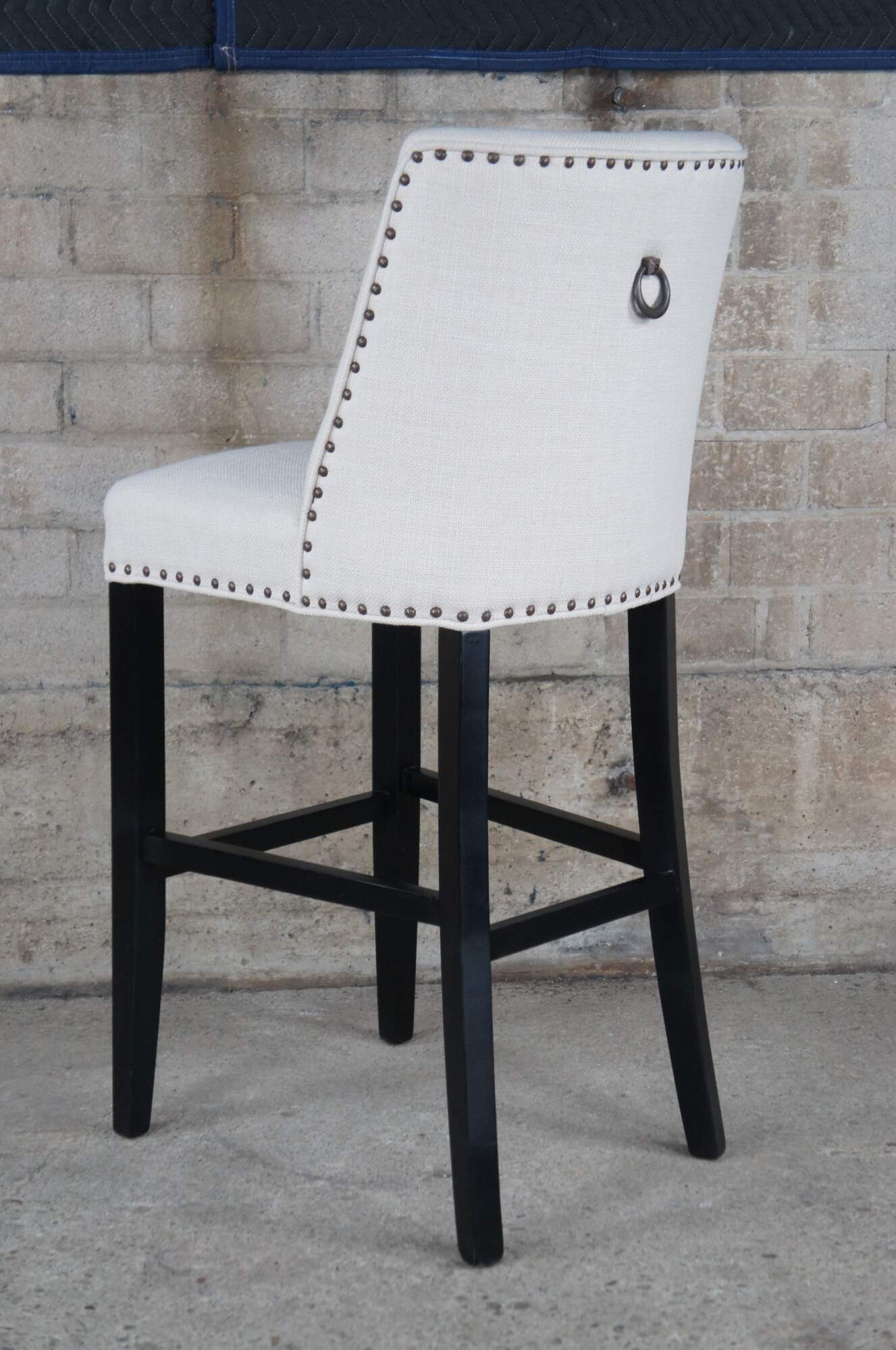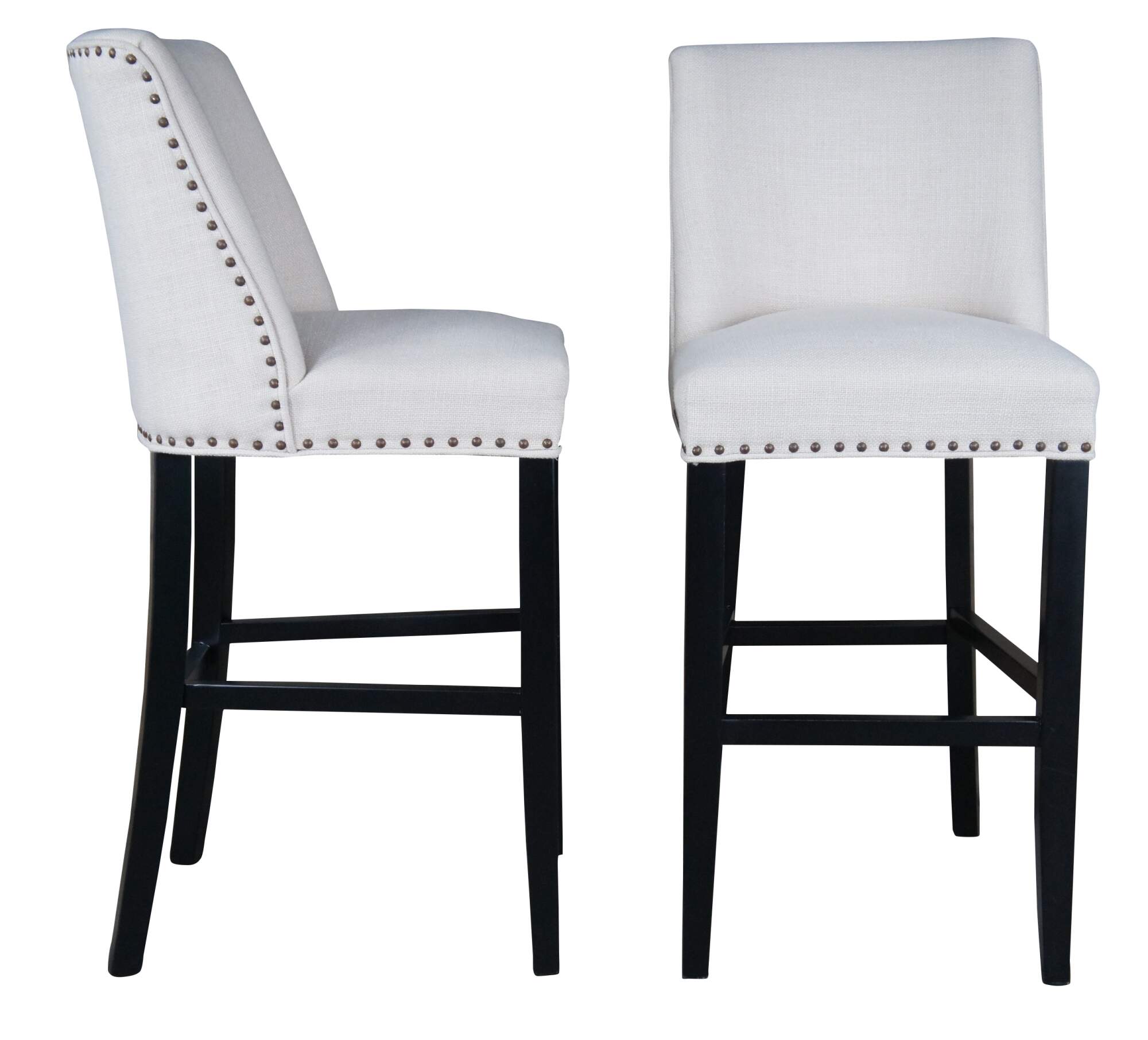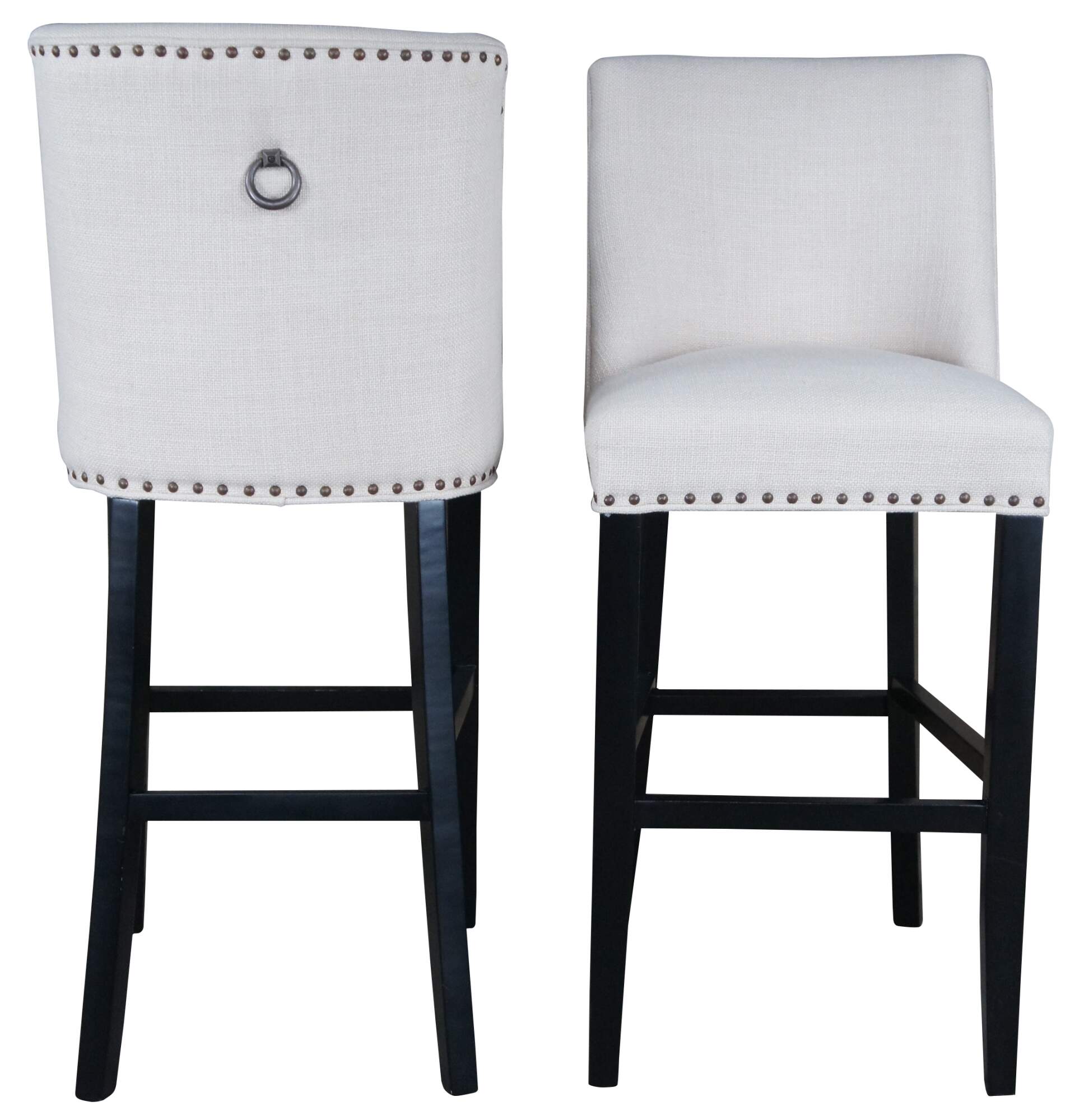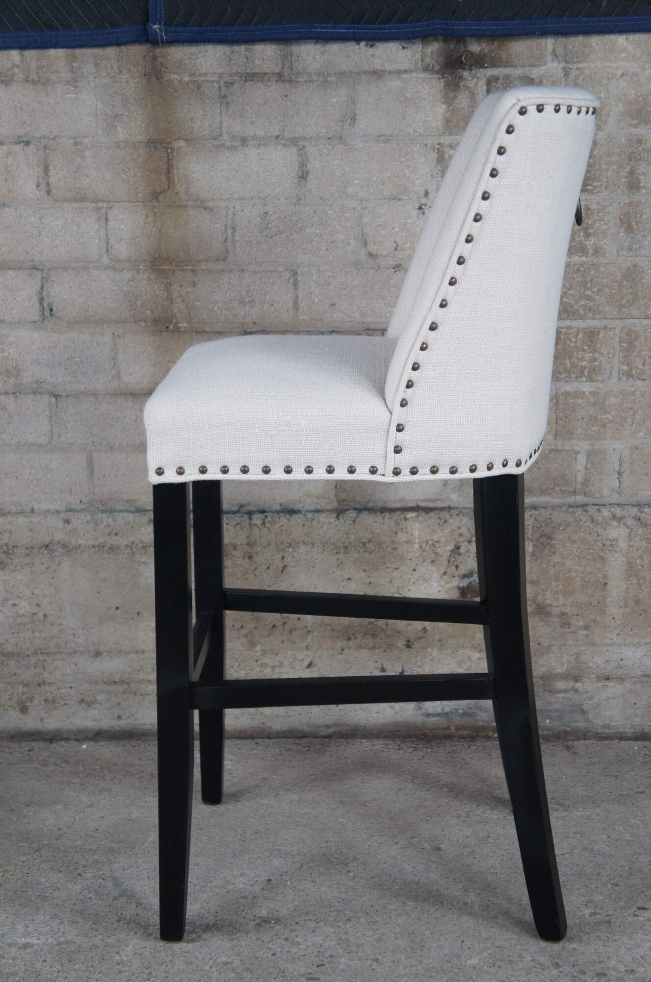 3 Pier 1 Corrine Linen Studded Bar Stools. Features a large seat and scoop back wing along the backside.