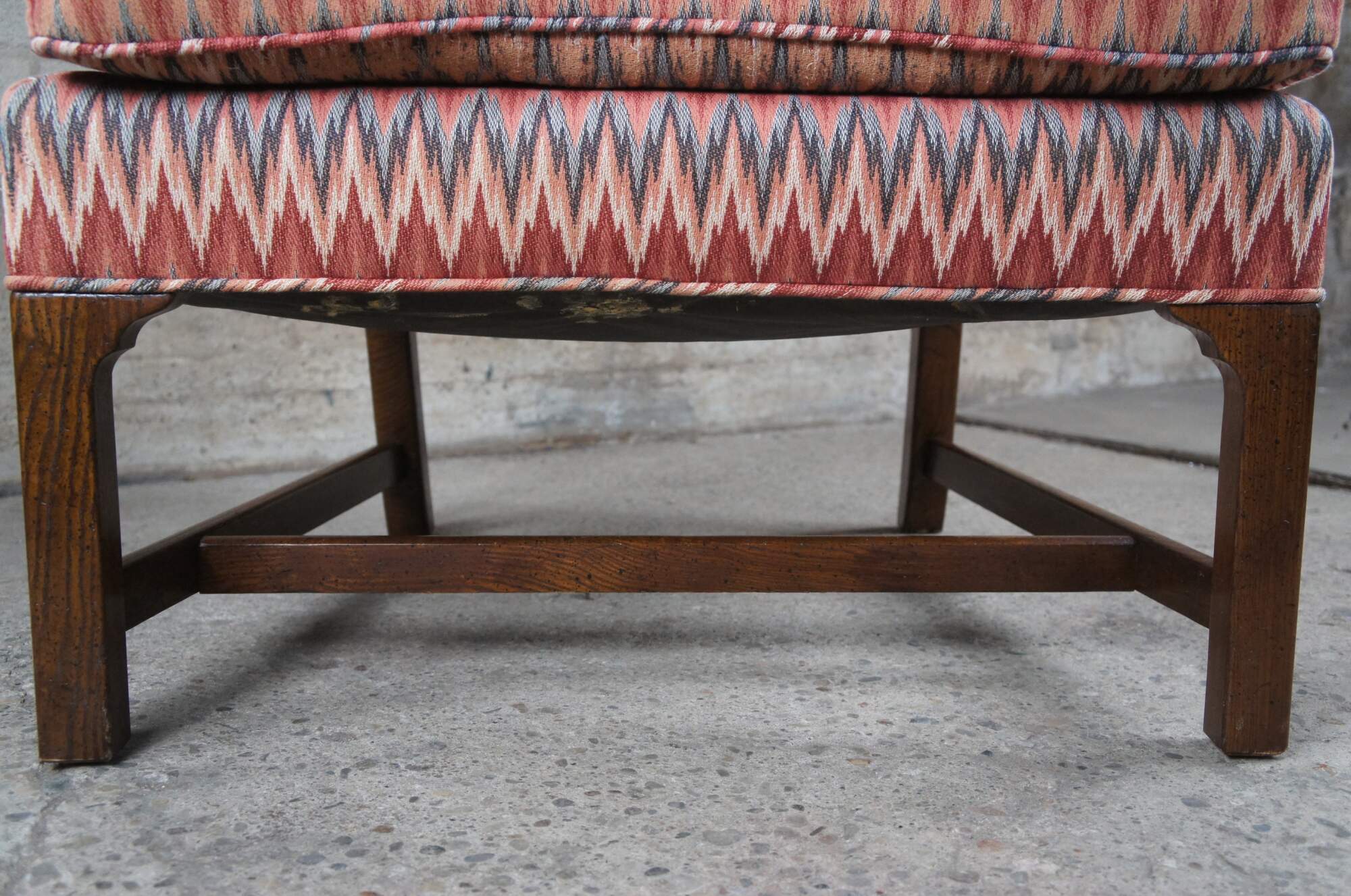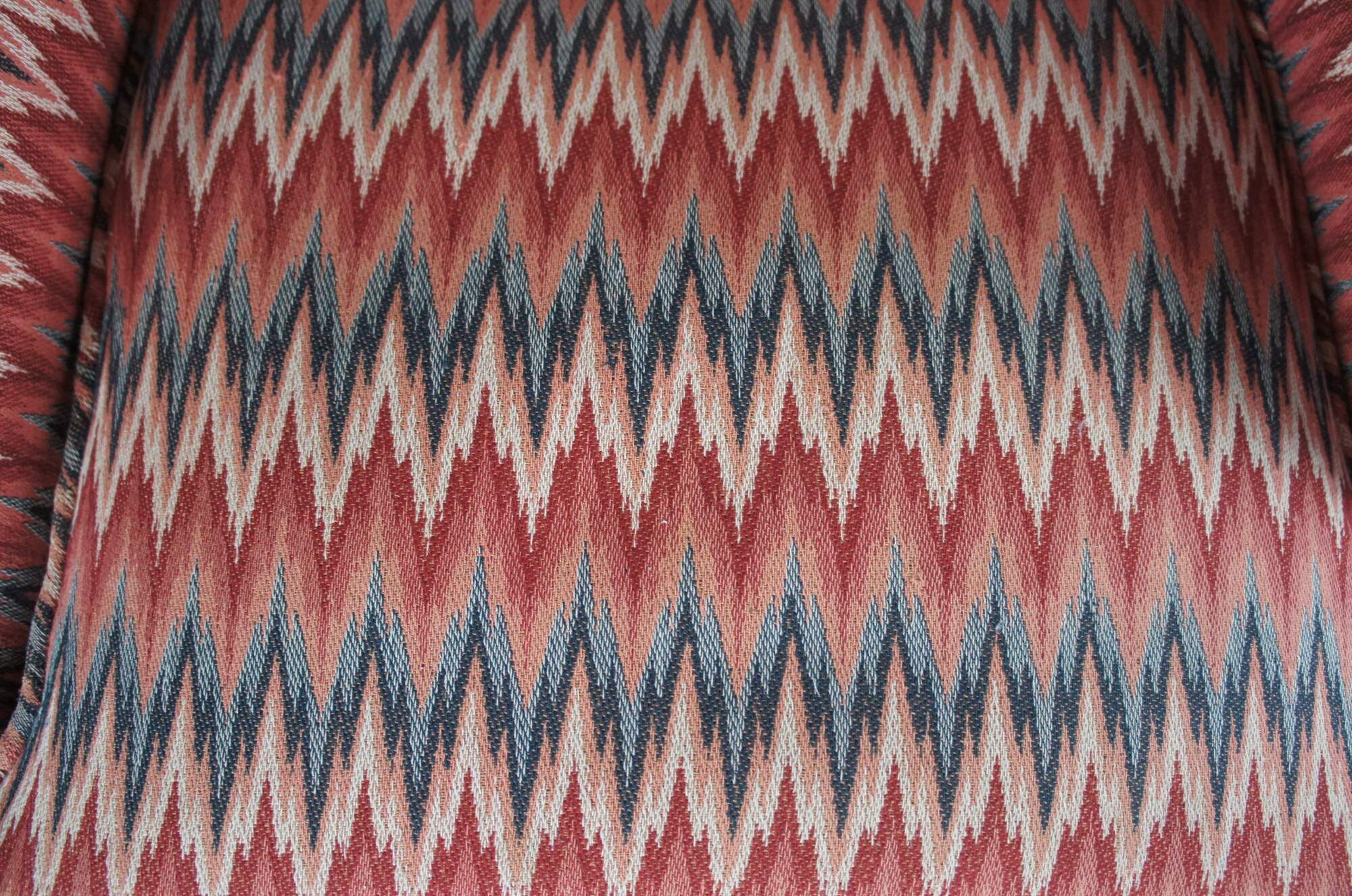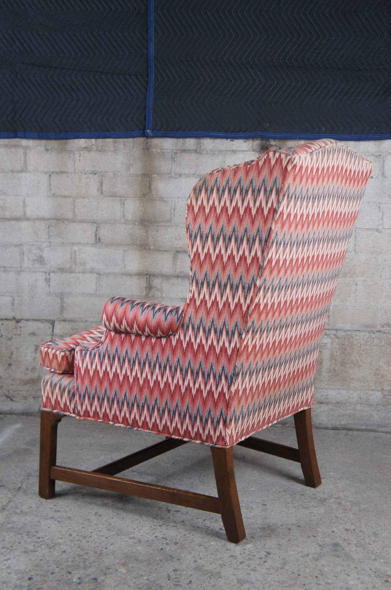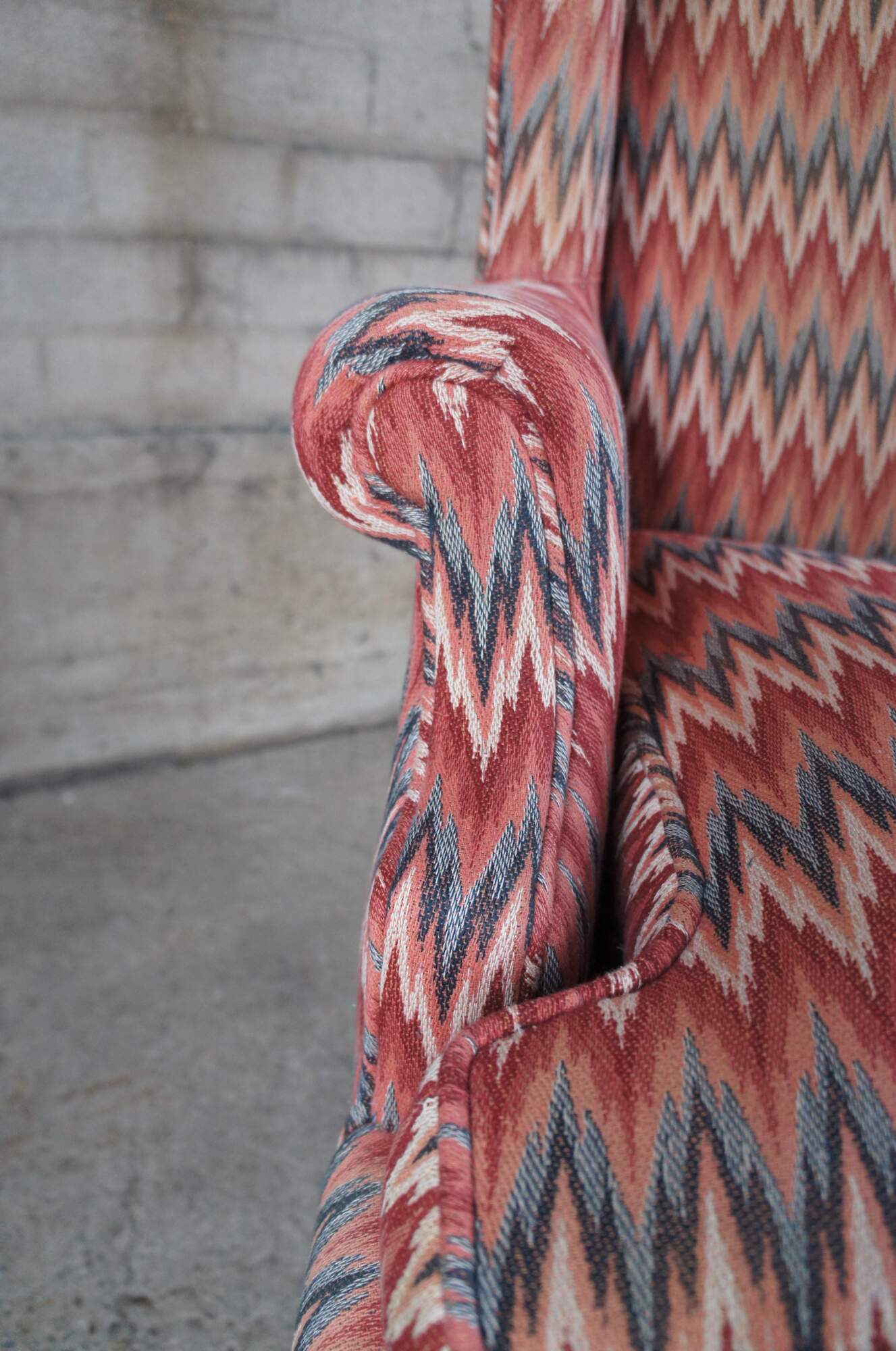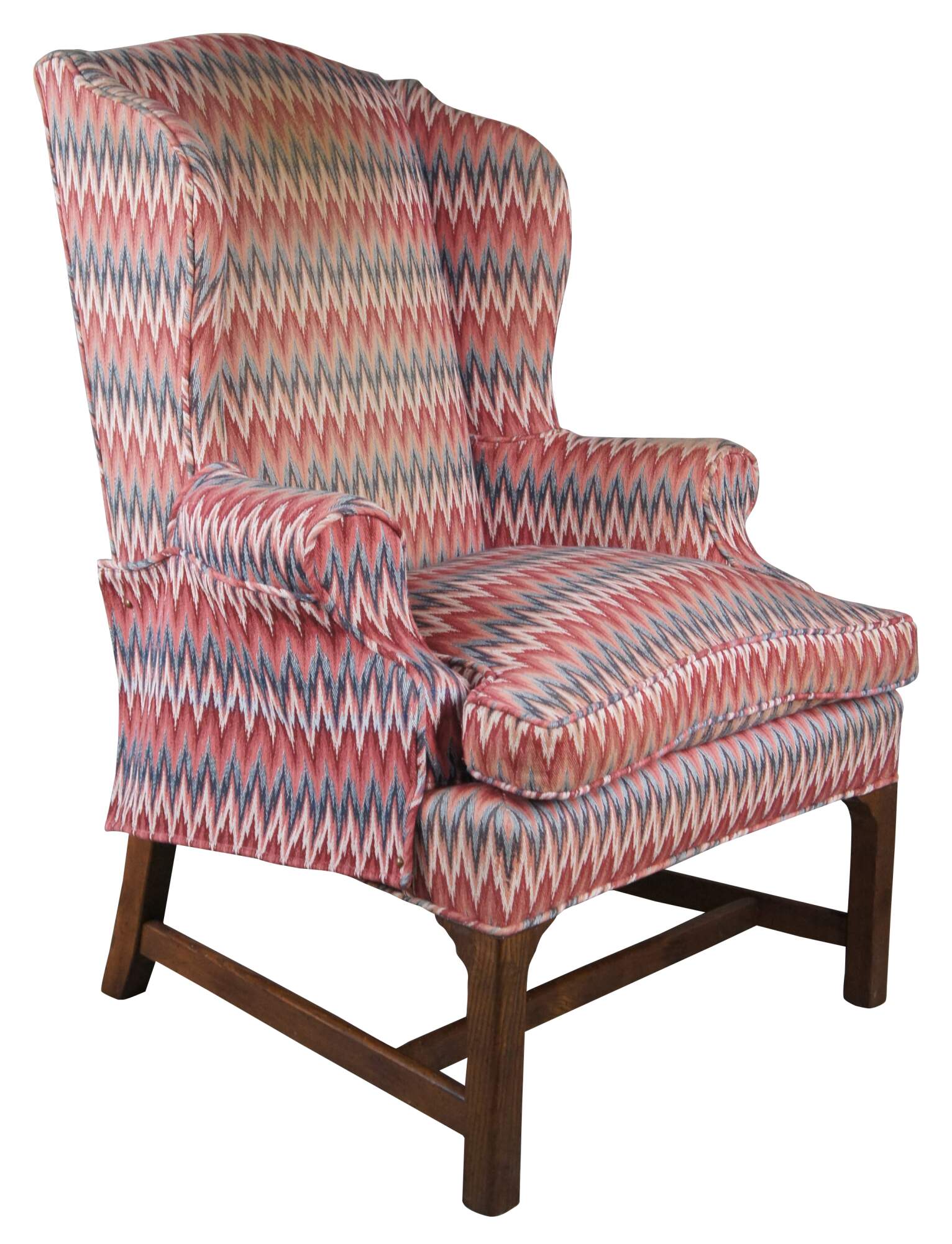 A beautiful traditional chippendale style wingback arm chair. Made from oak with a colorful chevron upholsterry and removable downfilled cushion. The chair features rolled arms and is supported by straight legs along the front connected to saber legs at the rear.