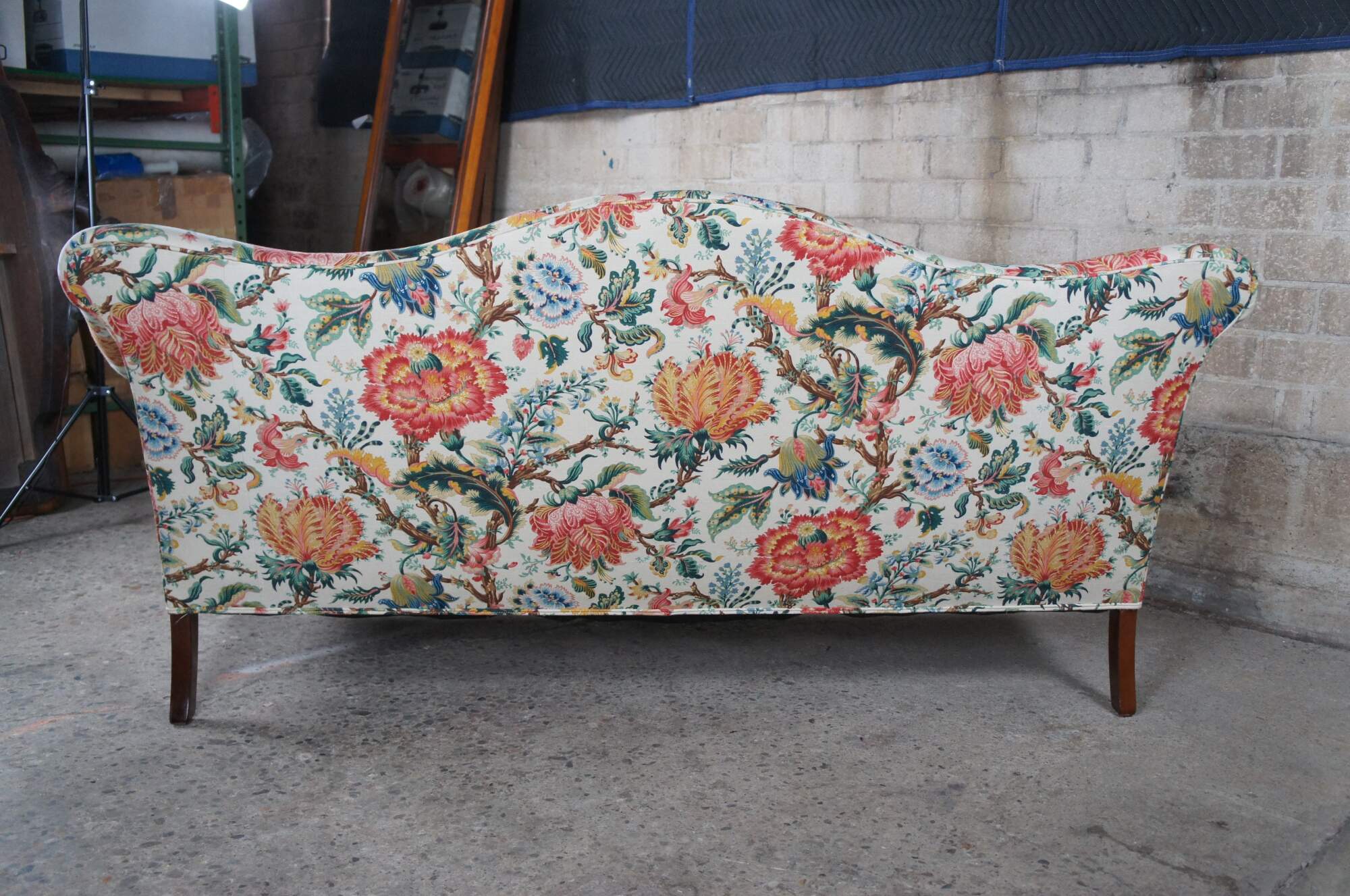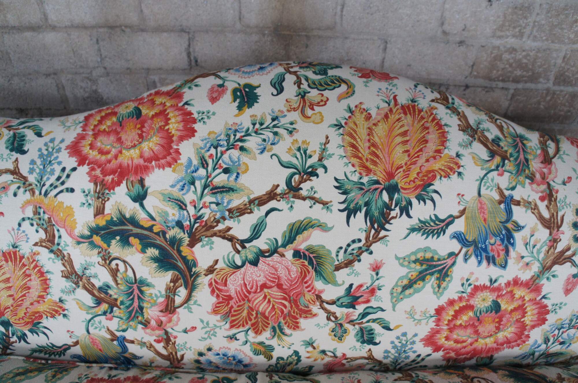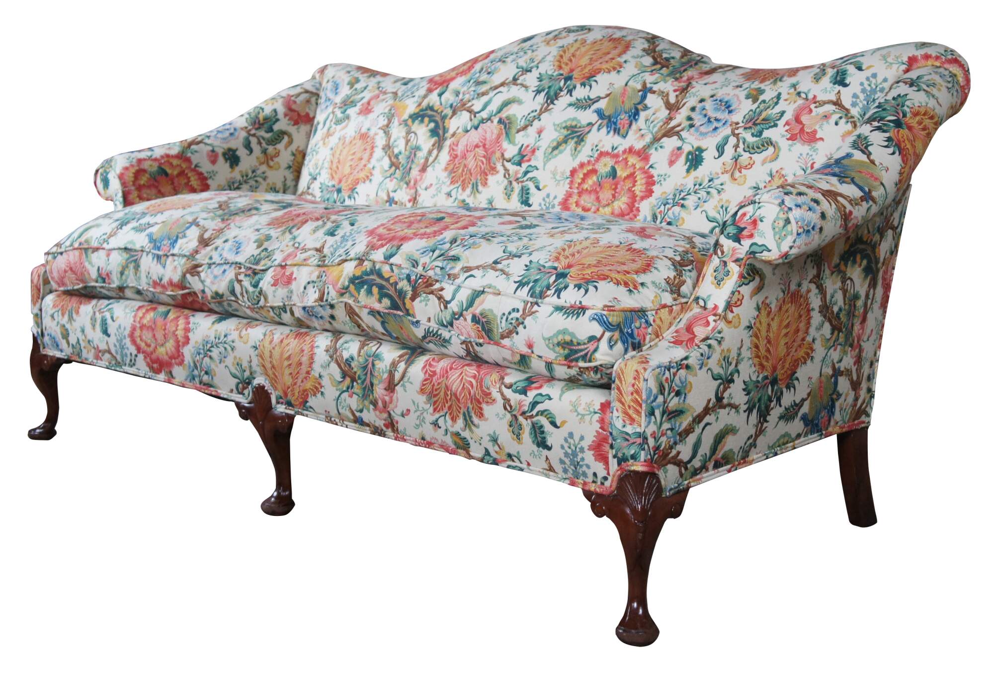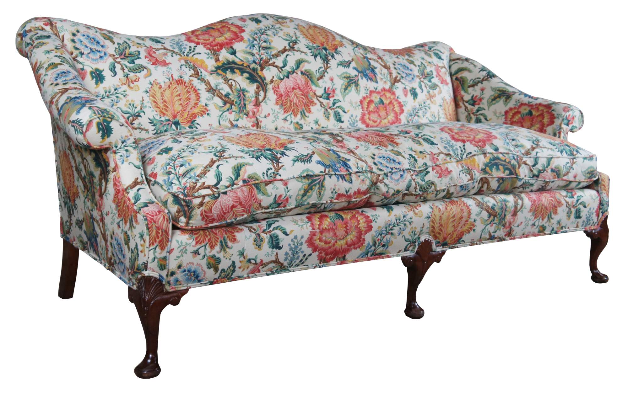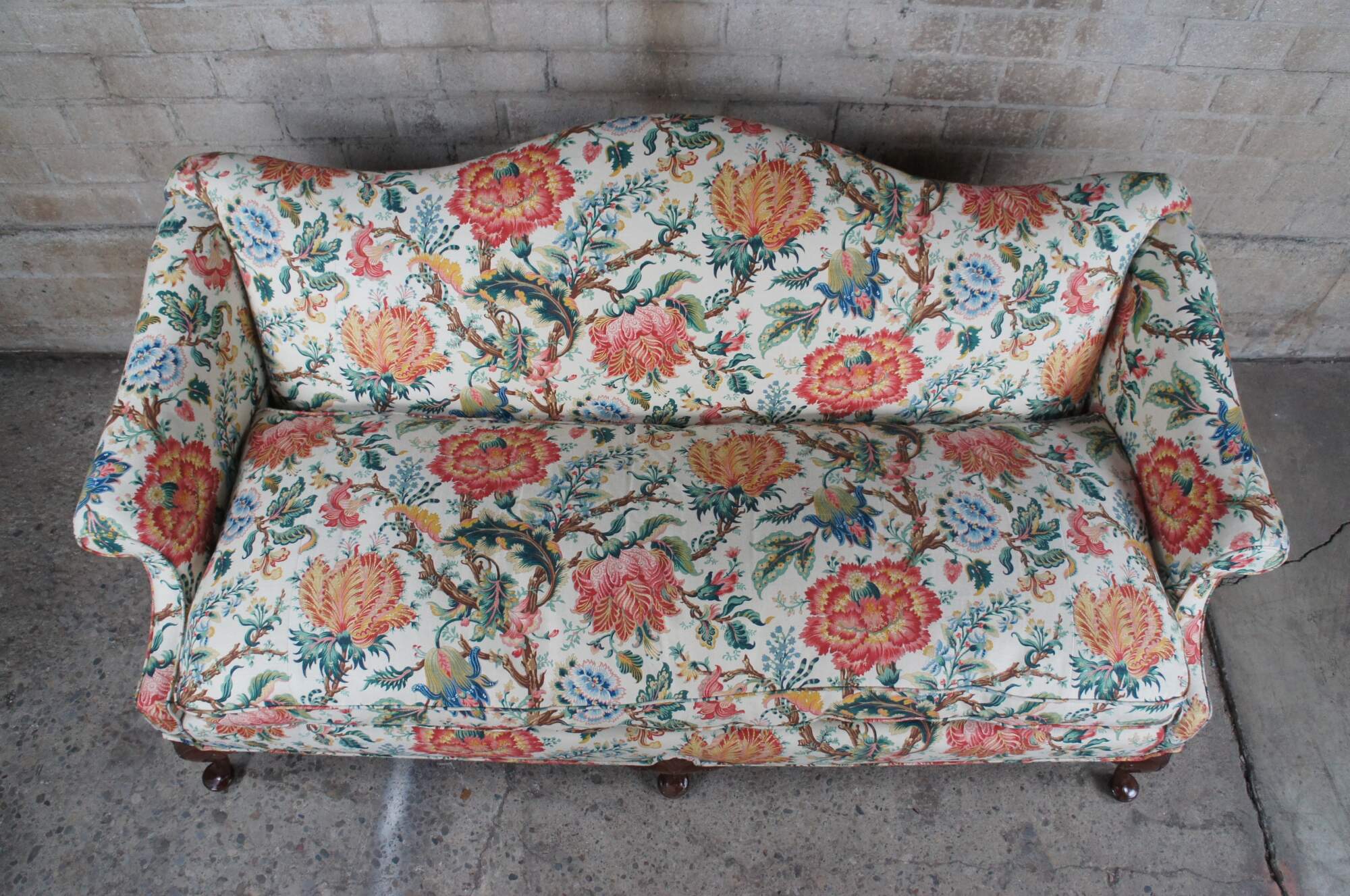 An exquisite Queen Anne style camelback settee or sofa, circa mid 20th century. Features a beautiful swooping back, rolled arms and large removable down filled seat. The settee is supported by cabriole legs with scallop carved knees, scrolling accents and large slipper feet. The crewel style fabric bolsters vivid eye catching floral sprays. A magnificent addition to any library, study or living space.