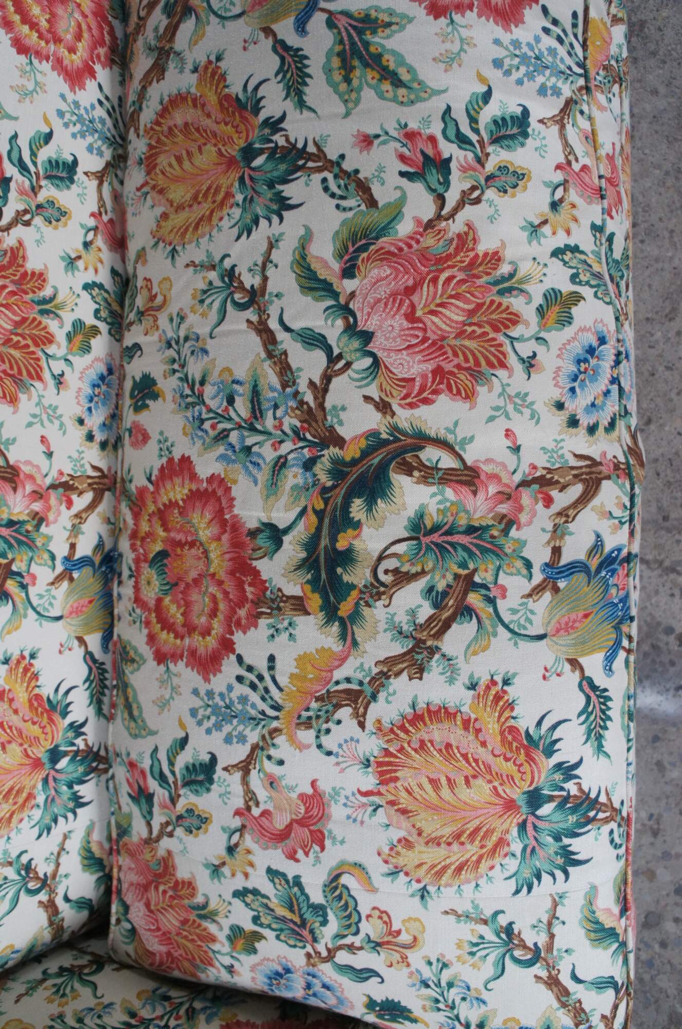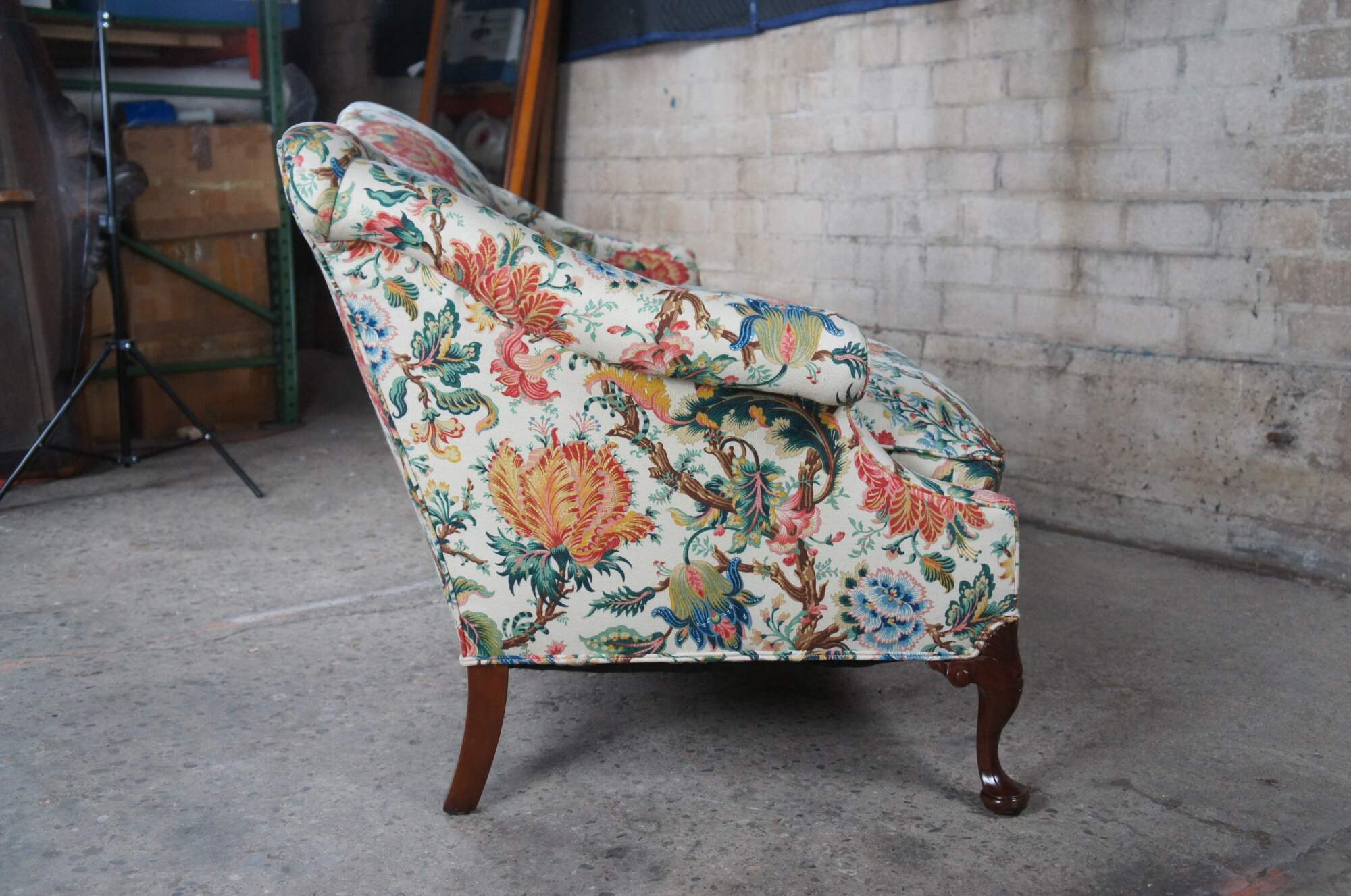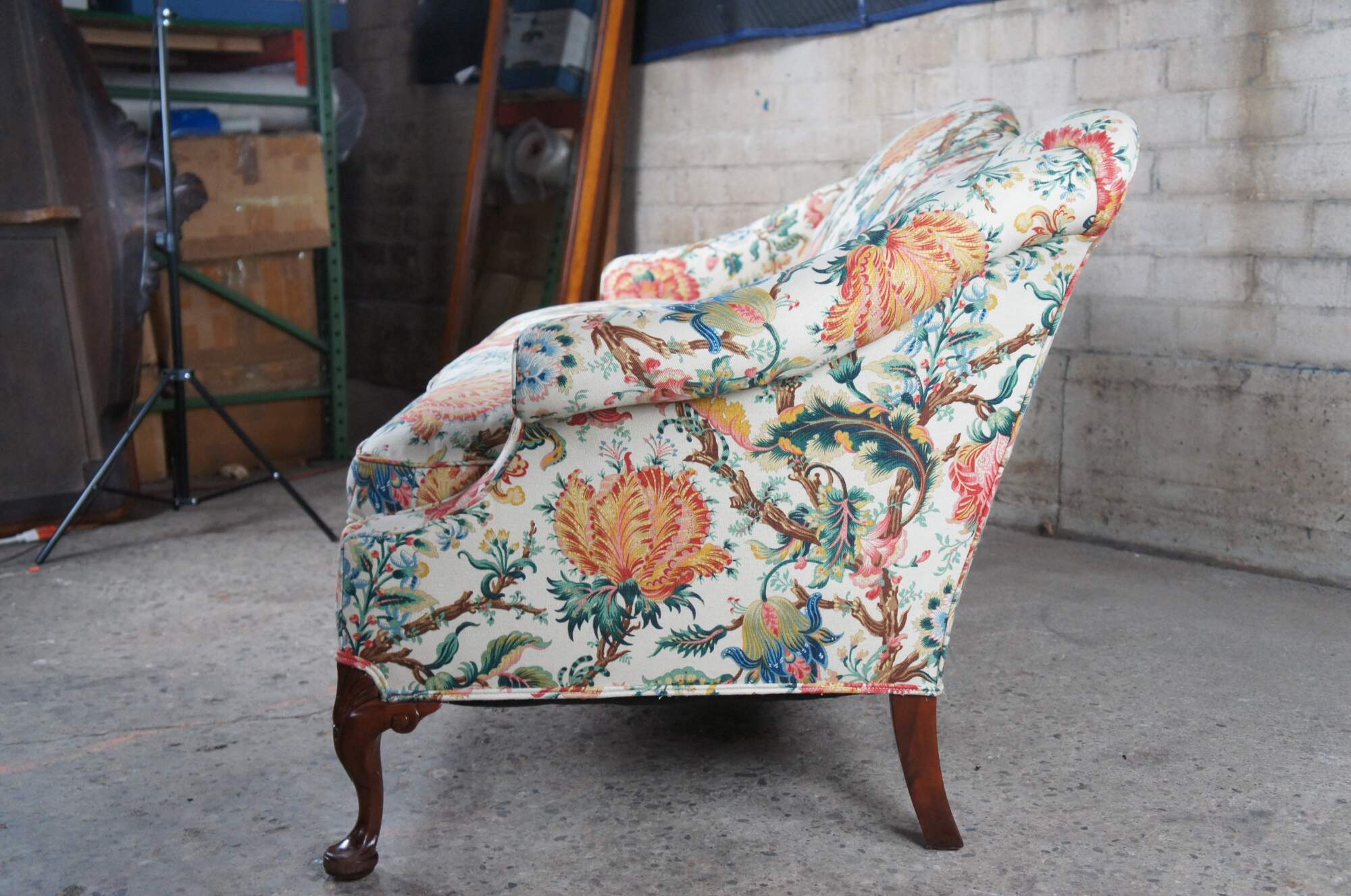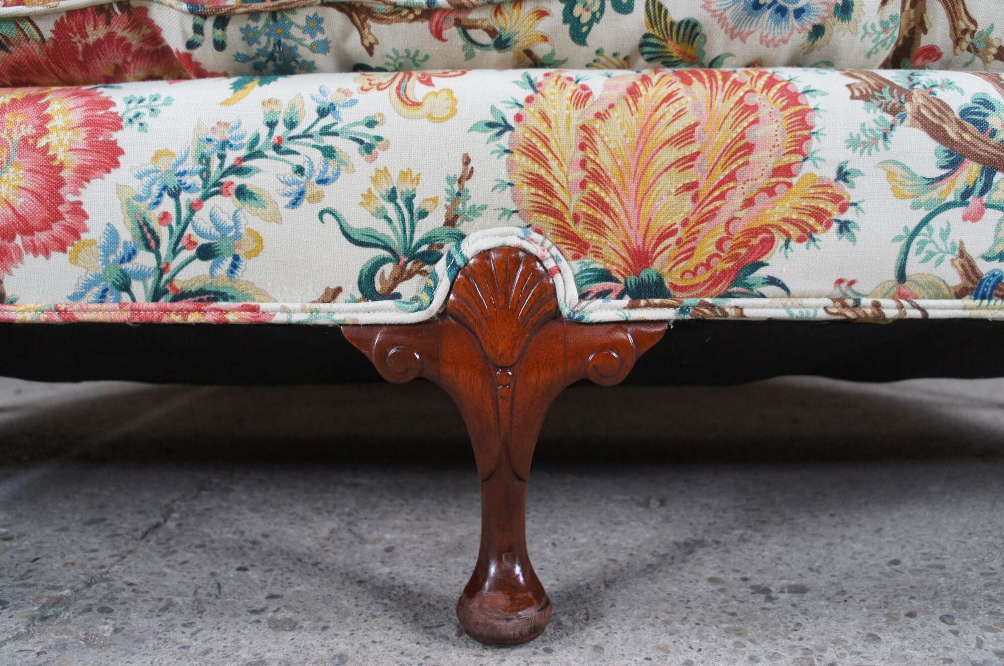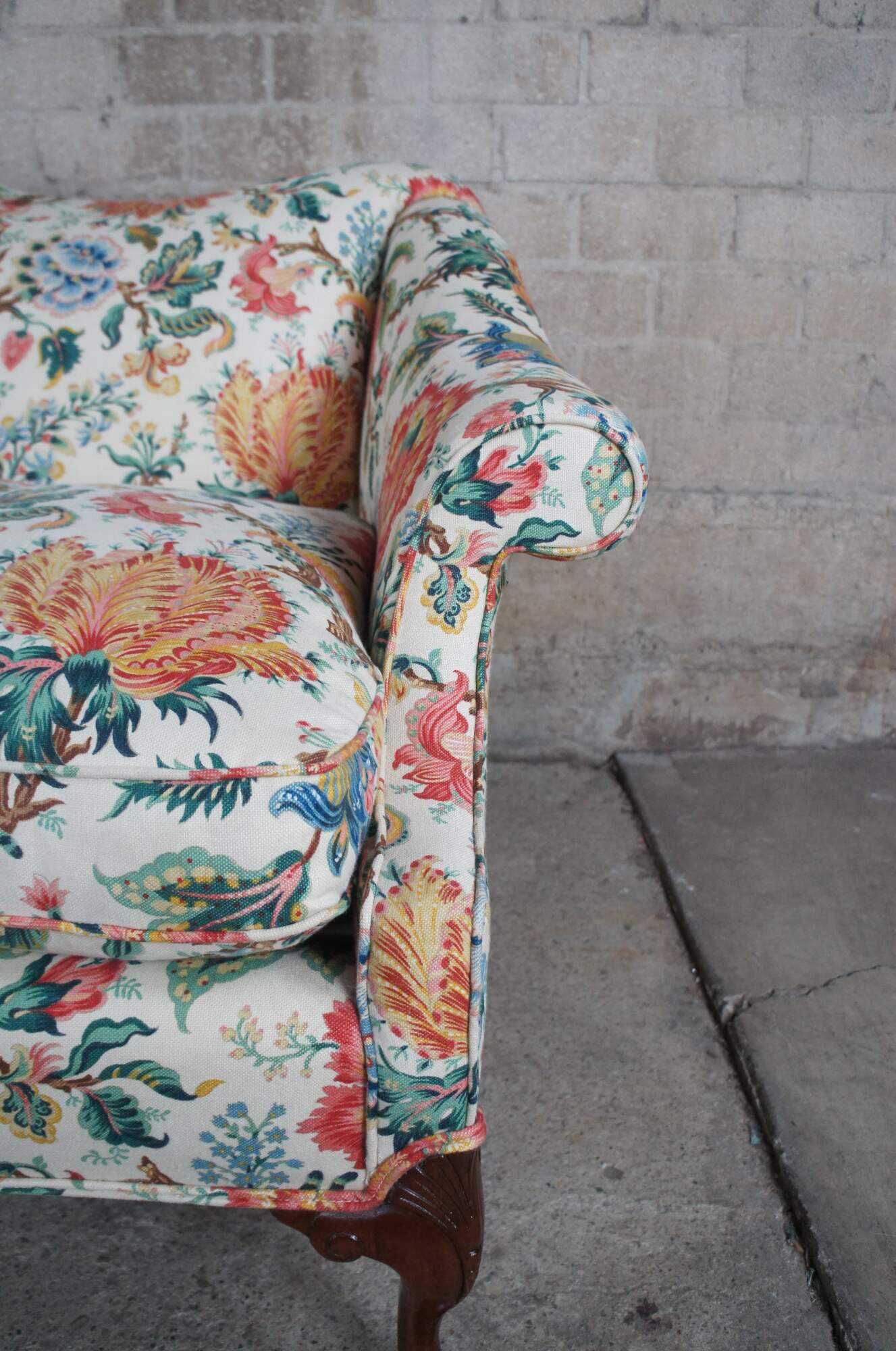 An exquisite Queen Anne style camelback settee or sofa, circa mid 20th century. Features a beautiful swooping back, rolled arms and large removable down filled seat. The settee is supported by cabriole legs with scallop carved knees, scrolling accents and large slipper feet. The crewel style fabric bolsters vivid eye catching floral sprays. A magnificent addition to any library, study or living space.