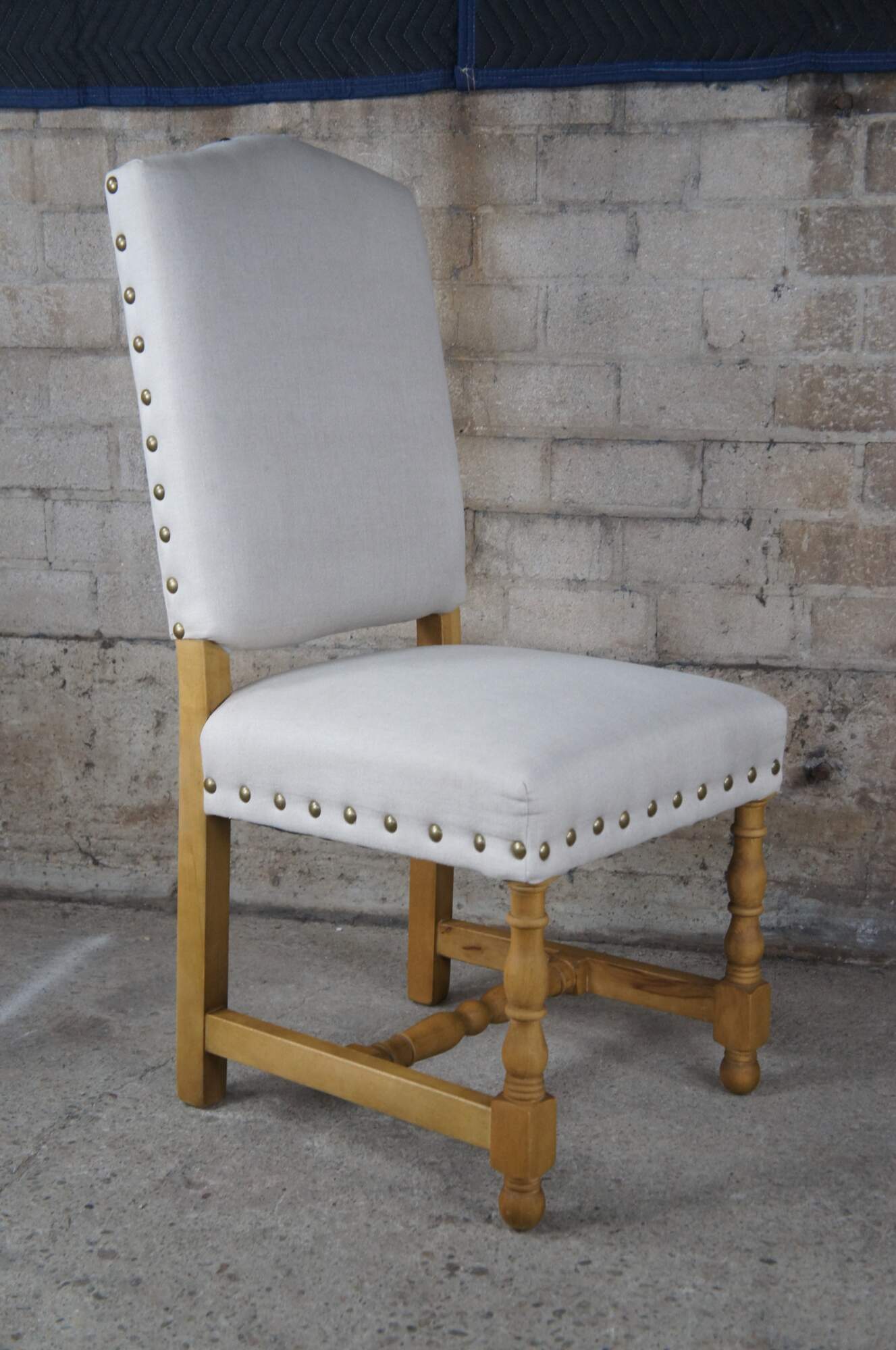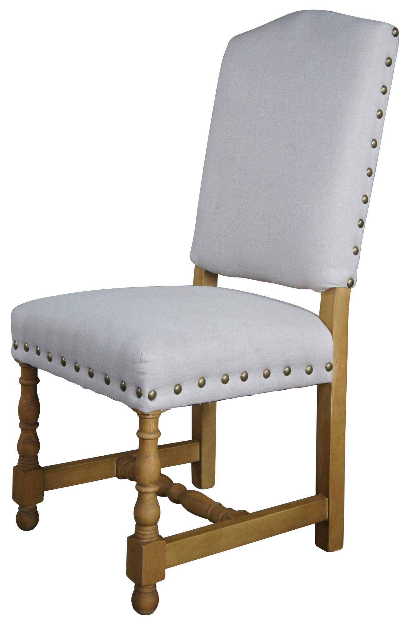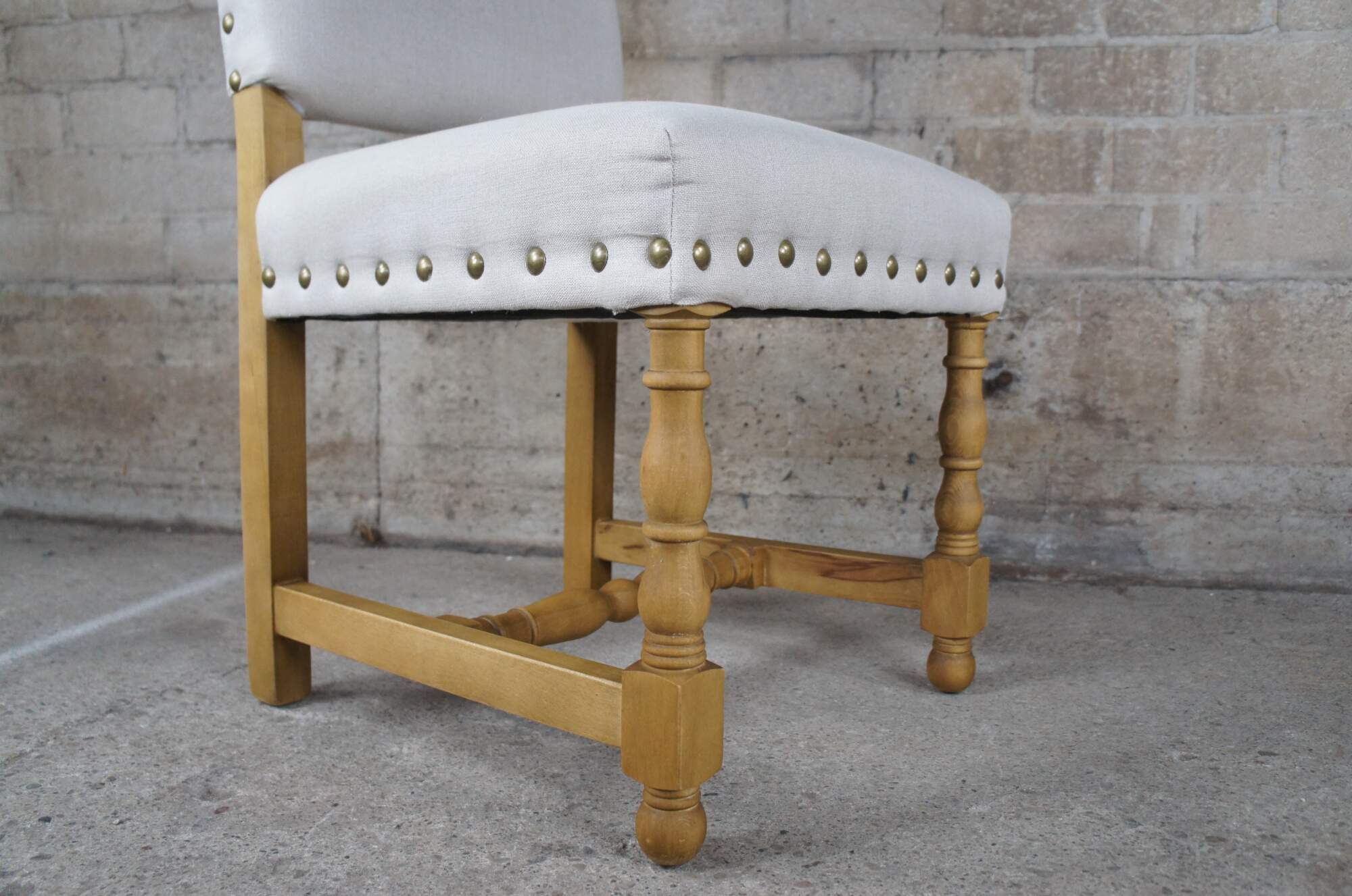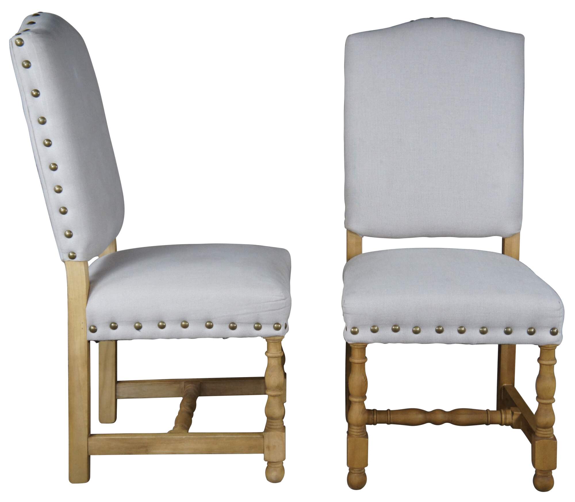 Linen Madrid side chairs by Furniture Classics. Spanish Reival with a sturdy solid oak frame over turned legs and brass nailhead trim.