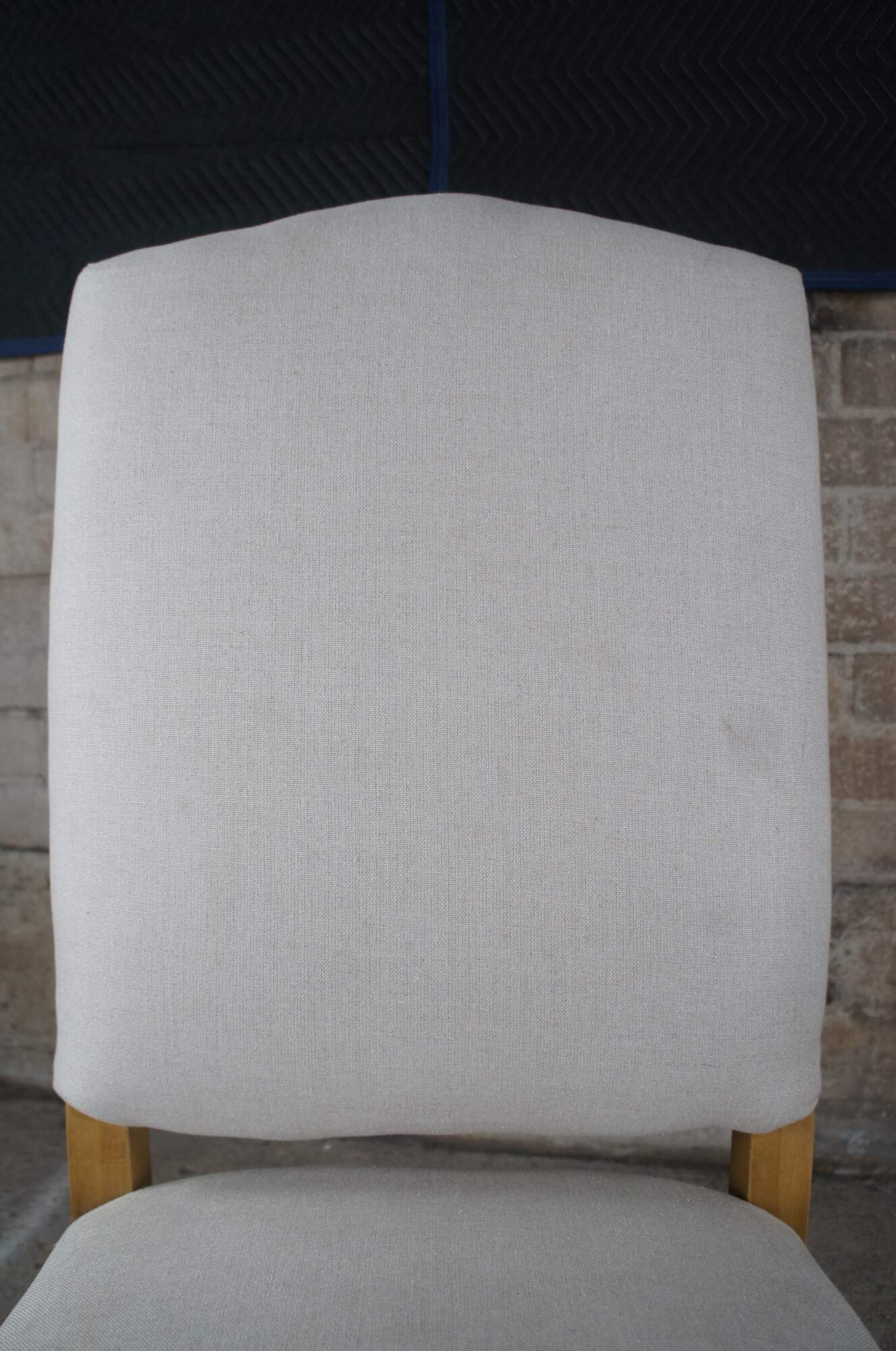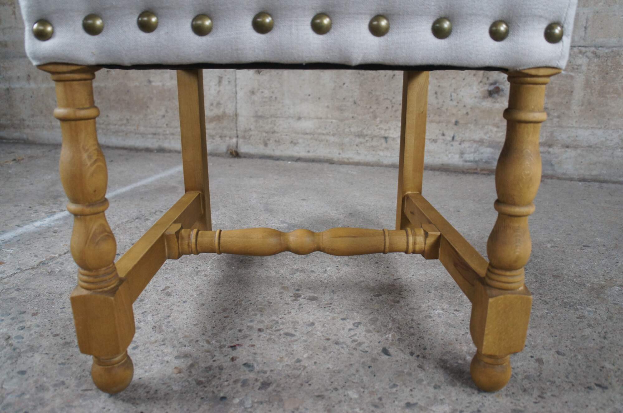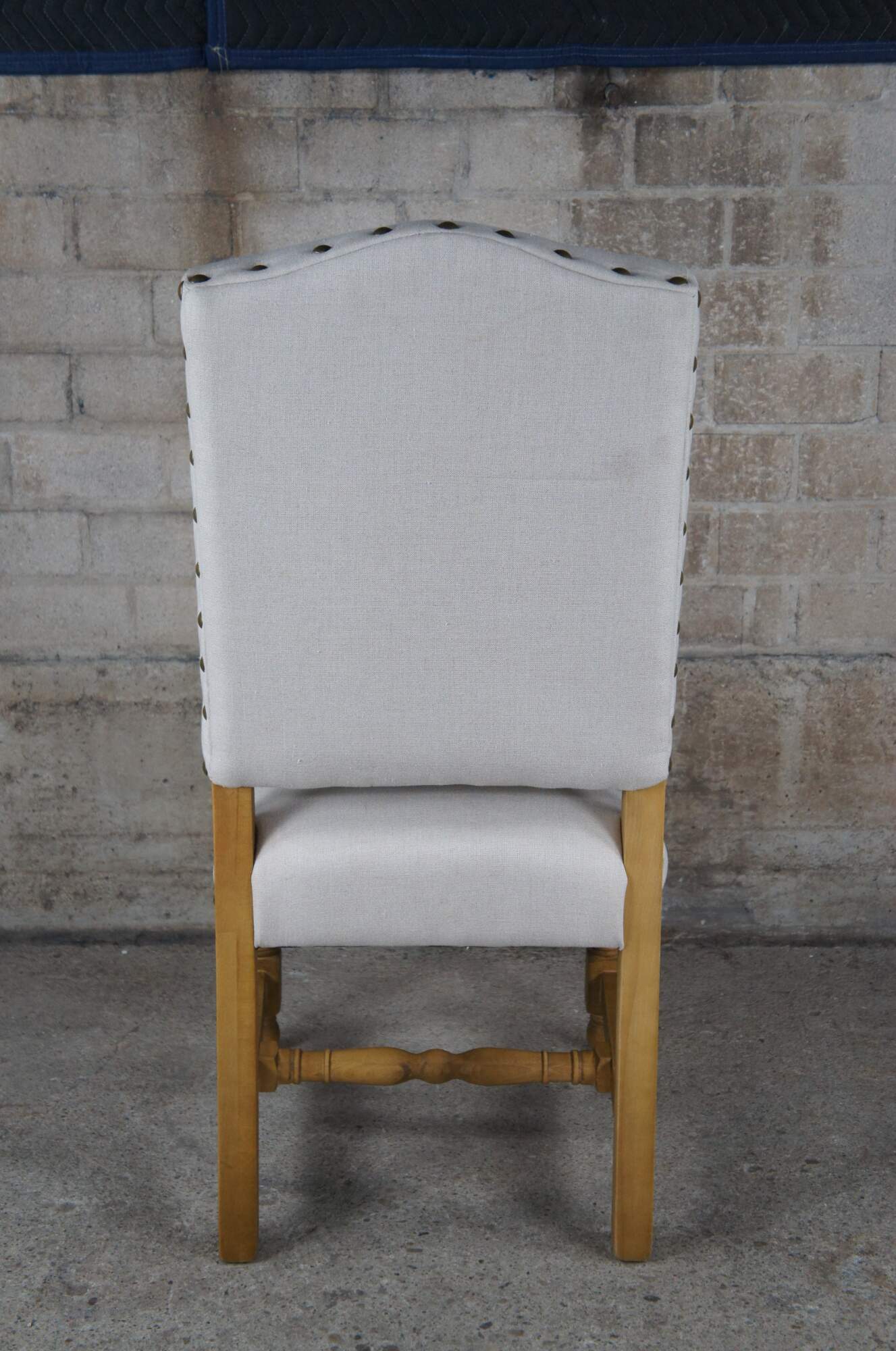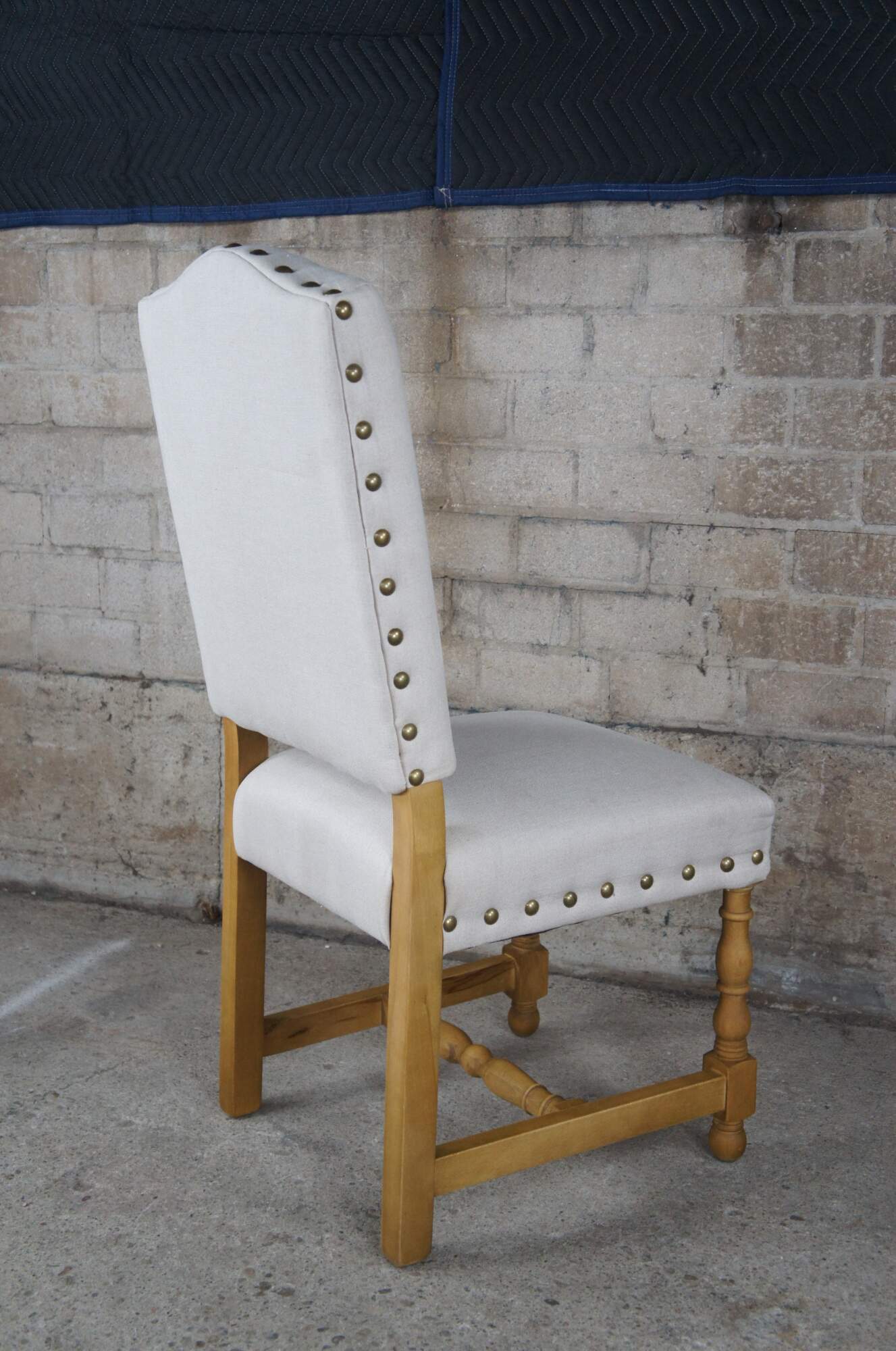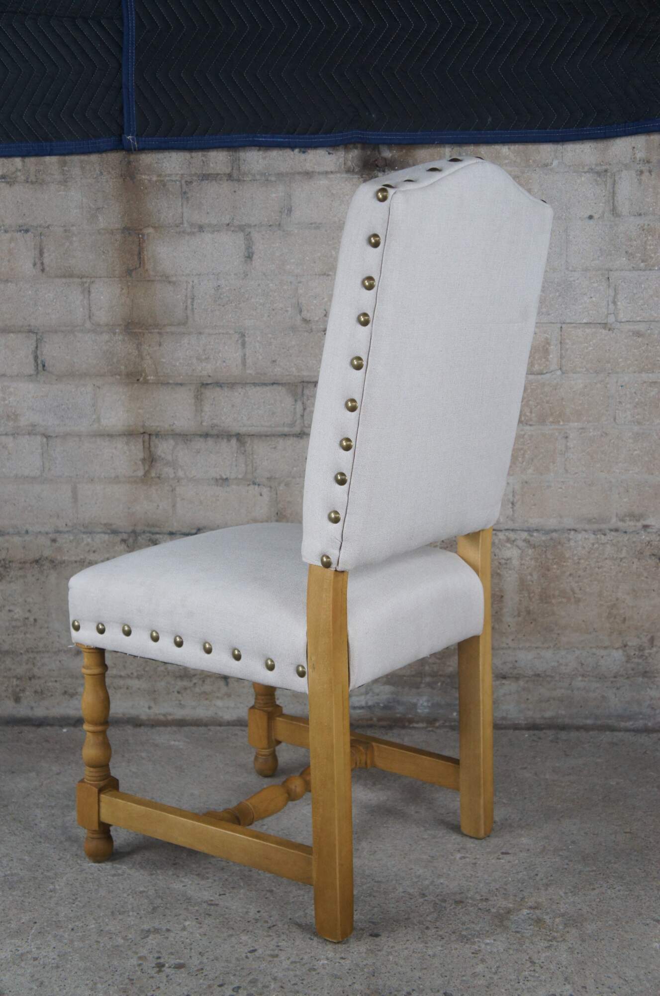 Linen Madrid side chairs by Furniture Classics. Spanish Reival with a sturdy solid oak frame over turned legs and brass nailhead trim.
