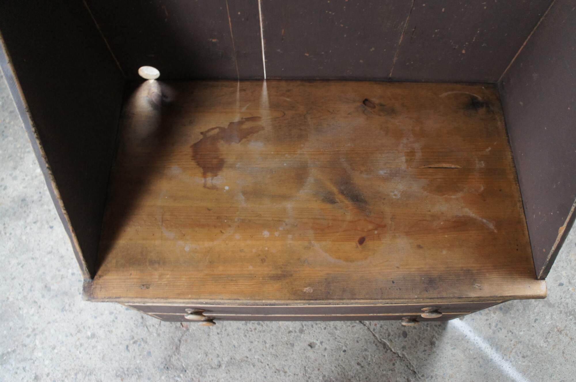 DS Whims Early American style or farmhouse bucket bench or media cabinet. Features a distinct form with large slant top leading to a table surface over a cubby and two lower dovetailed drawers. The cabinet has a hole along the backside of the front as well as the lower cubby allowing it to be used for media/ Tv or components. Made from pine with a brown painted distressed finish.