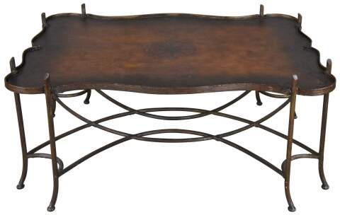 This stunning gilt iron faux bois coffee table features a double curved x-base, double corner faux bois legs, and a beautiful tole painted scalloped tray style top. The top is painted in a faux leather finish with a central stylized flower design and gold leaf and flower vines in the black border around the outer edge.