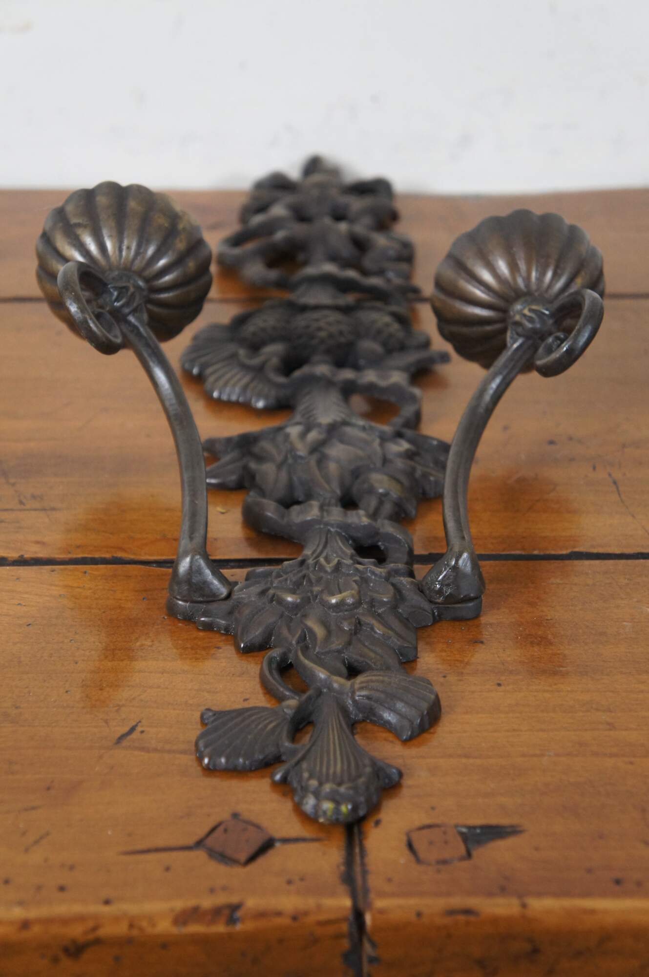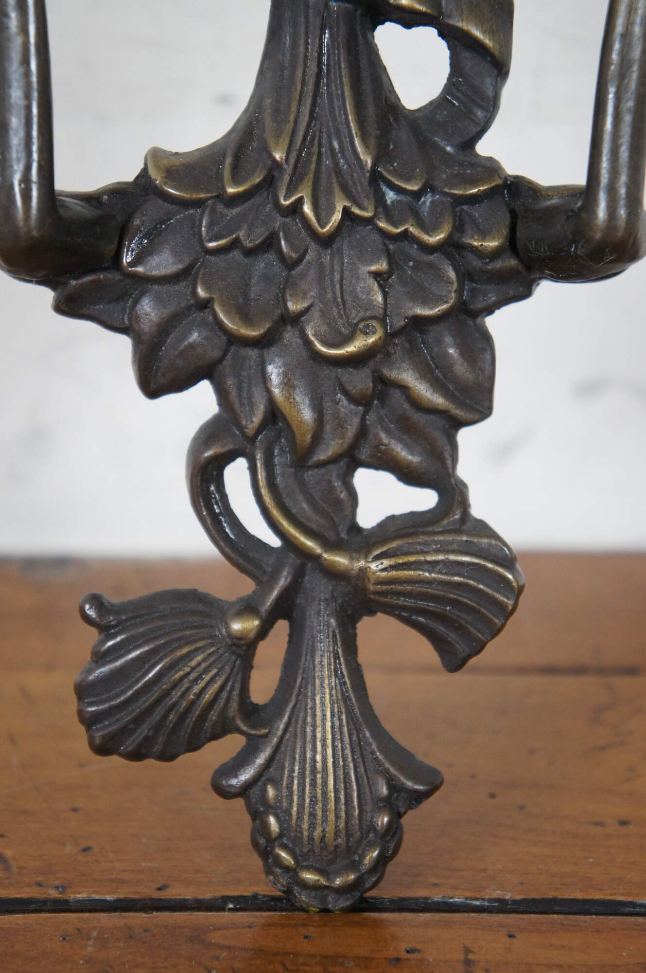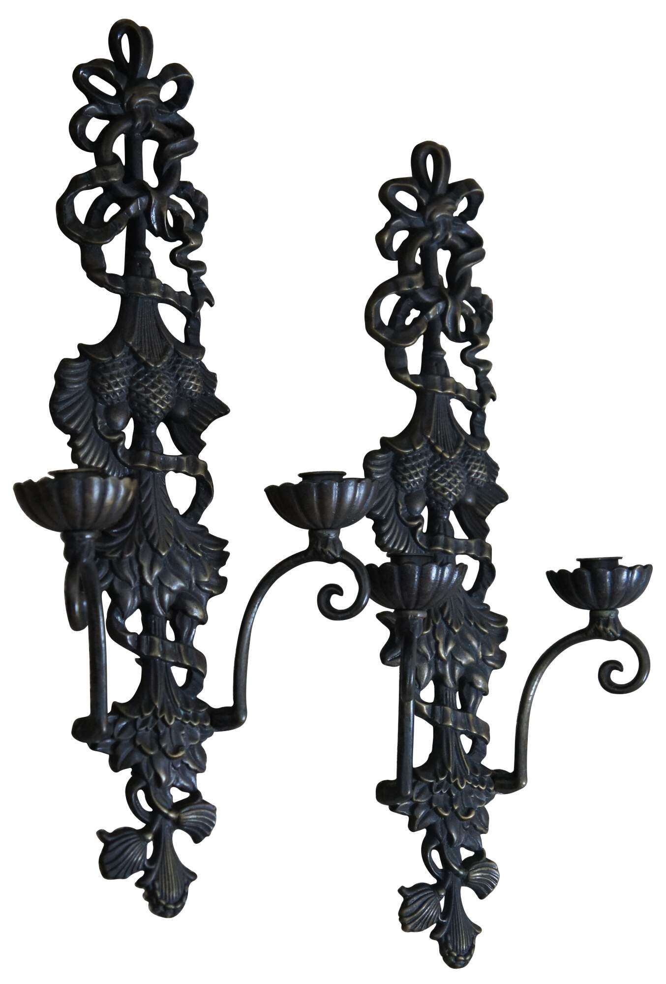 Pair of vintage bronze two light candle sconces featuring a Victorian design of ribbons, leaves and pine cones.