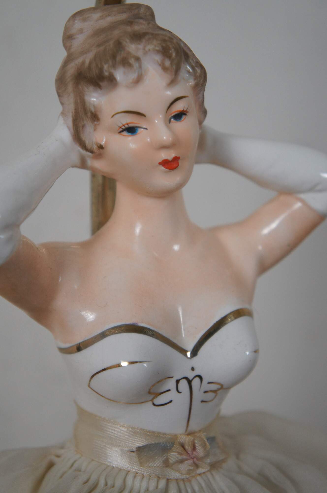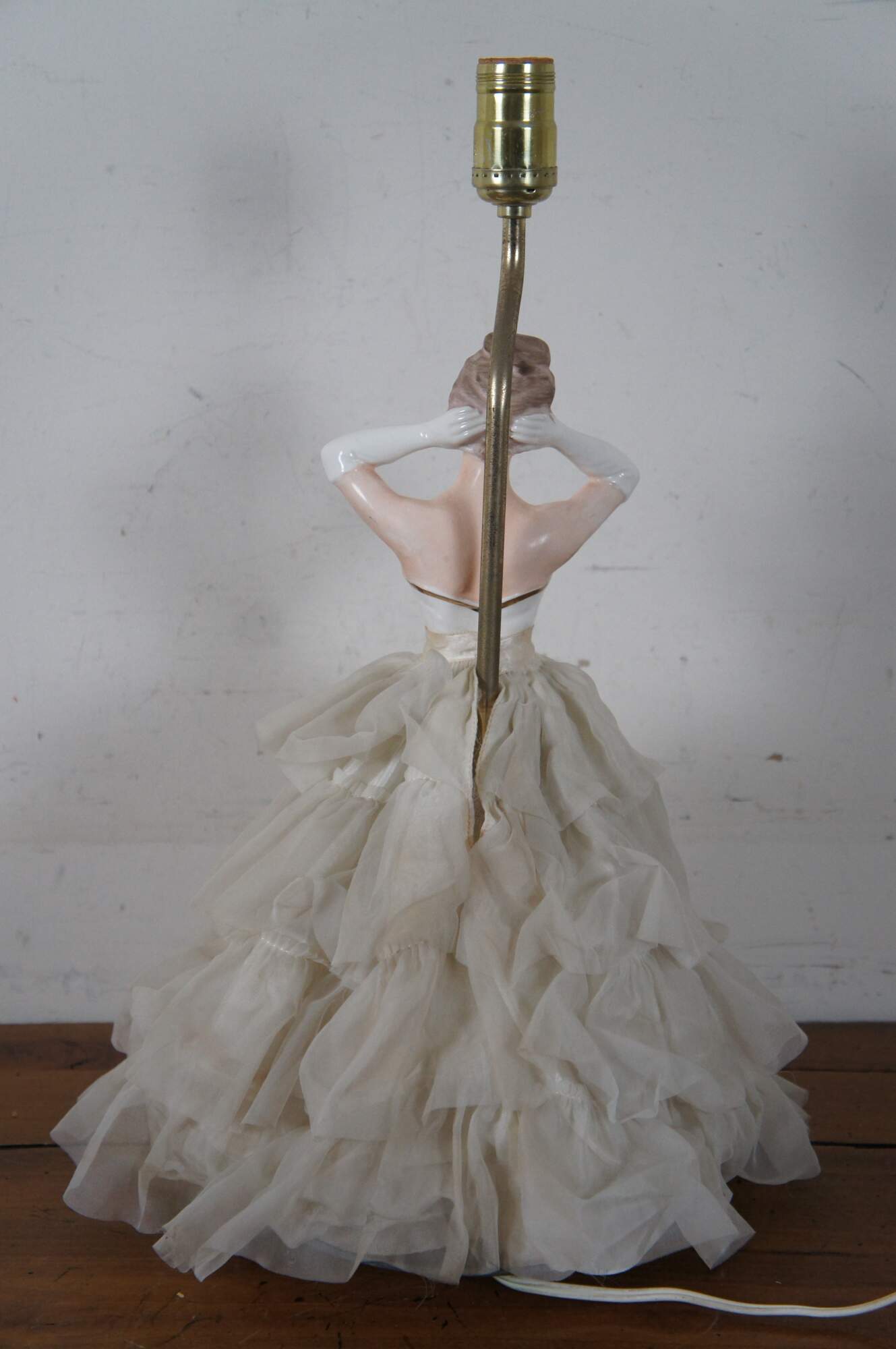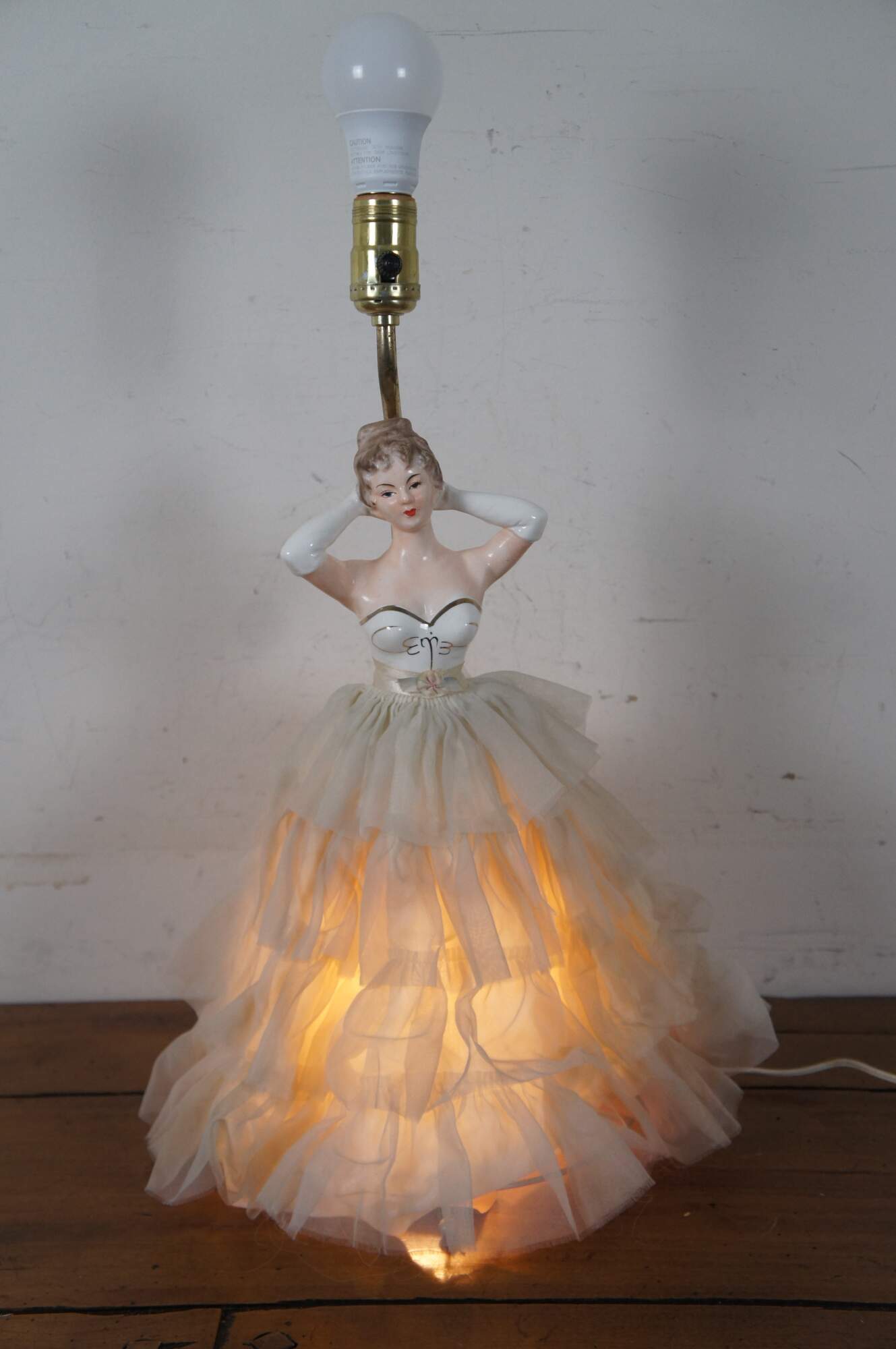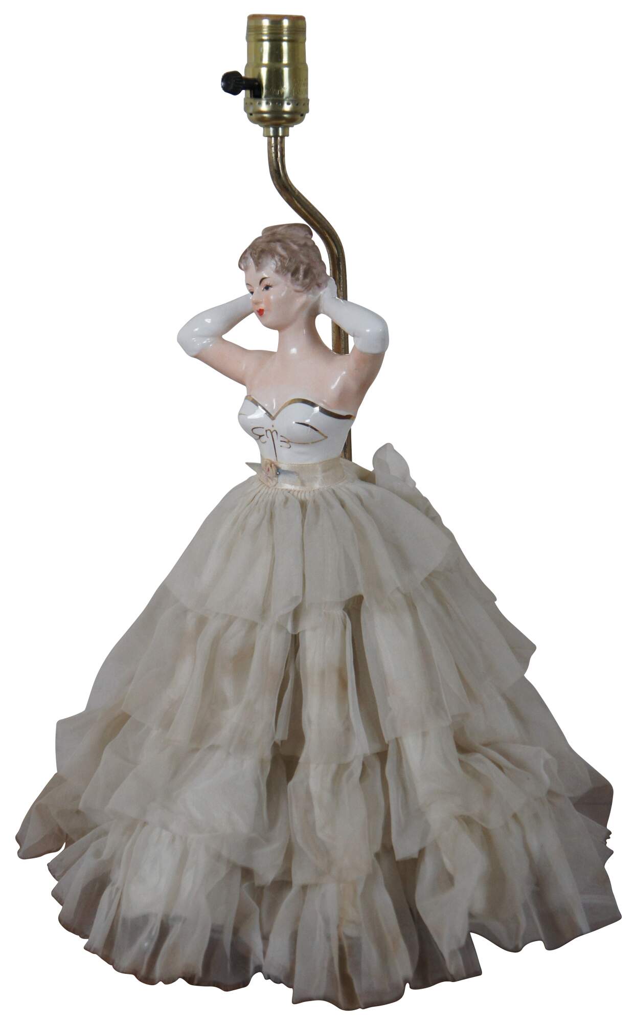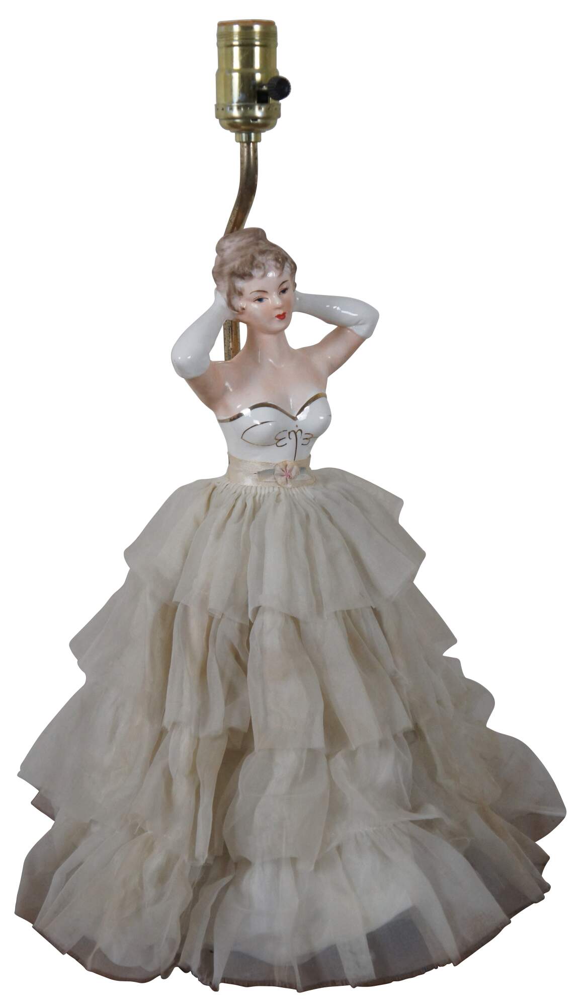 Vintage 1950s budoir / vanity lamp featuring a porcelain bust in the shape of a pretty woman in evening gloves with a lower light inside her voluminous lace skirts and main light above her head. Includes the frame and lace for matching shade but needs repair. Three way switch allows the upper and lower lights to be lit either separately or together.