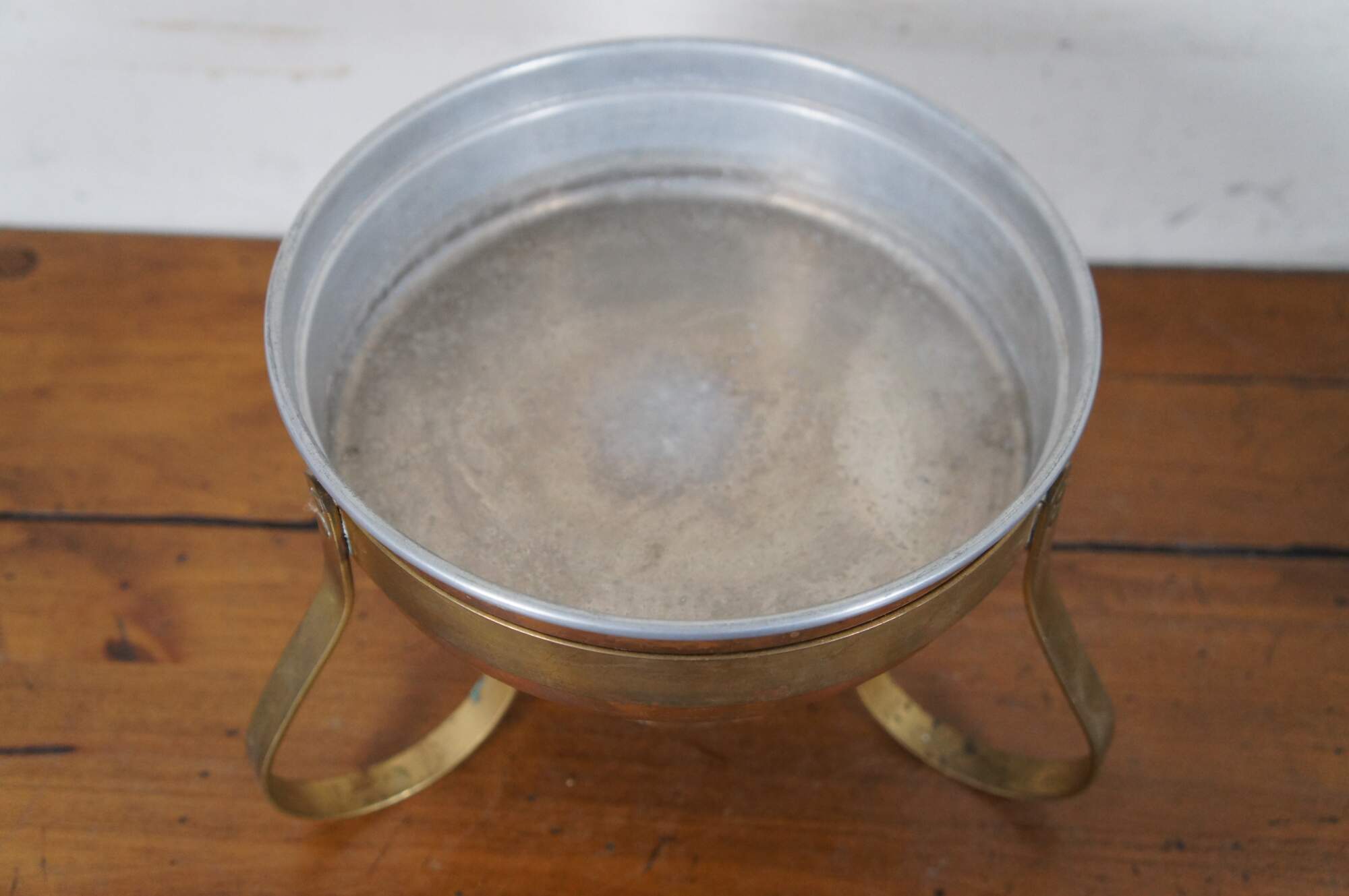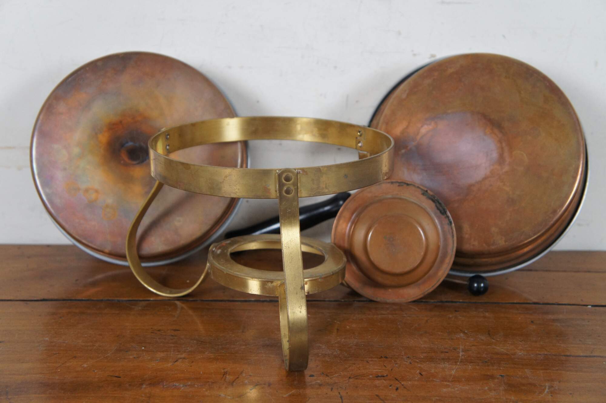Vintage Wittcrosse chafing dish set including a brass stand, copper oil lamp / burner, and a two-part warming pan with lid.