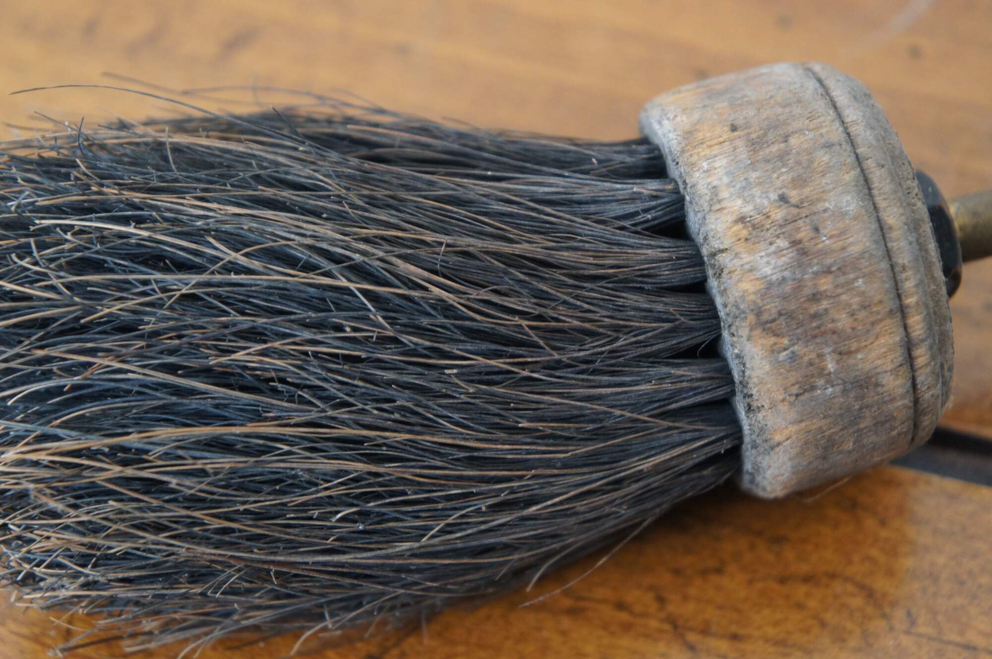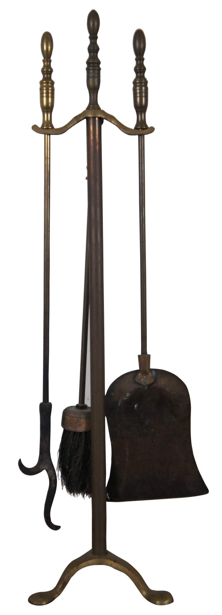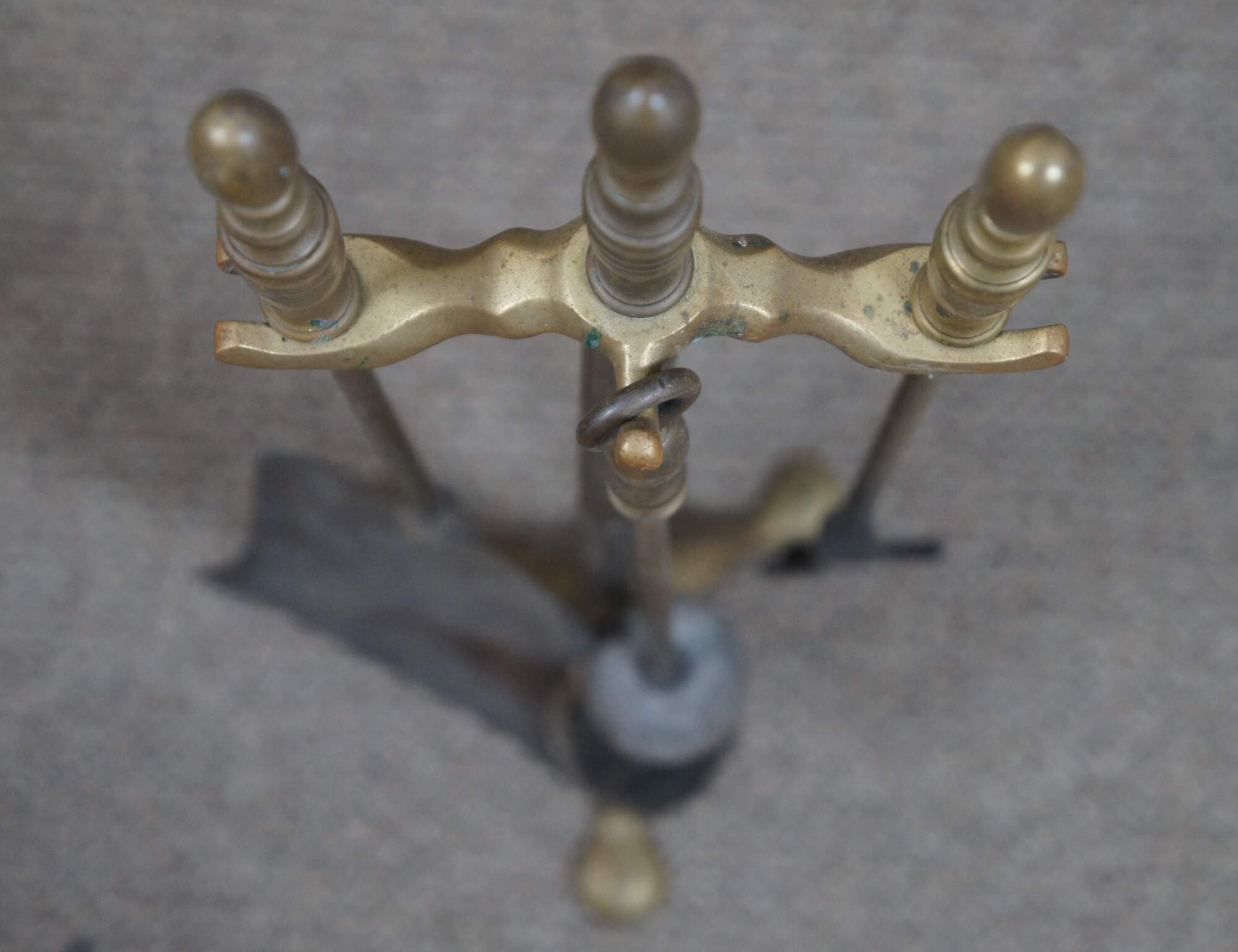 Early 20th century four piece brass fireplace set including a stand, poker, shovel and brush.