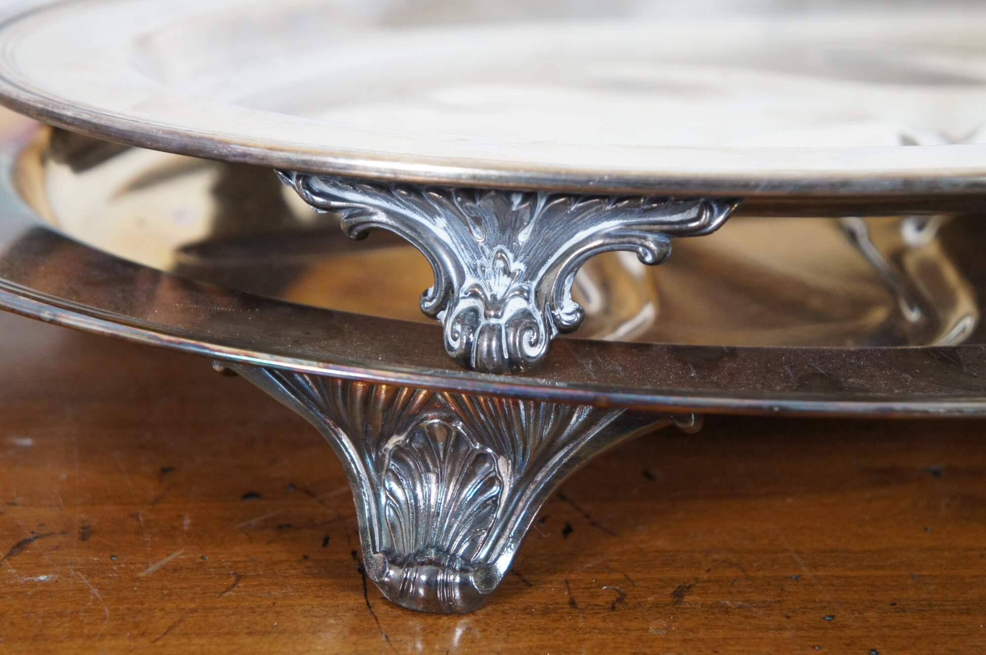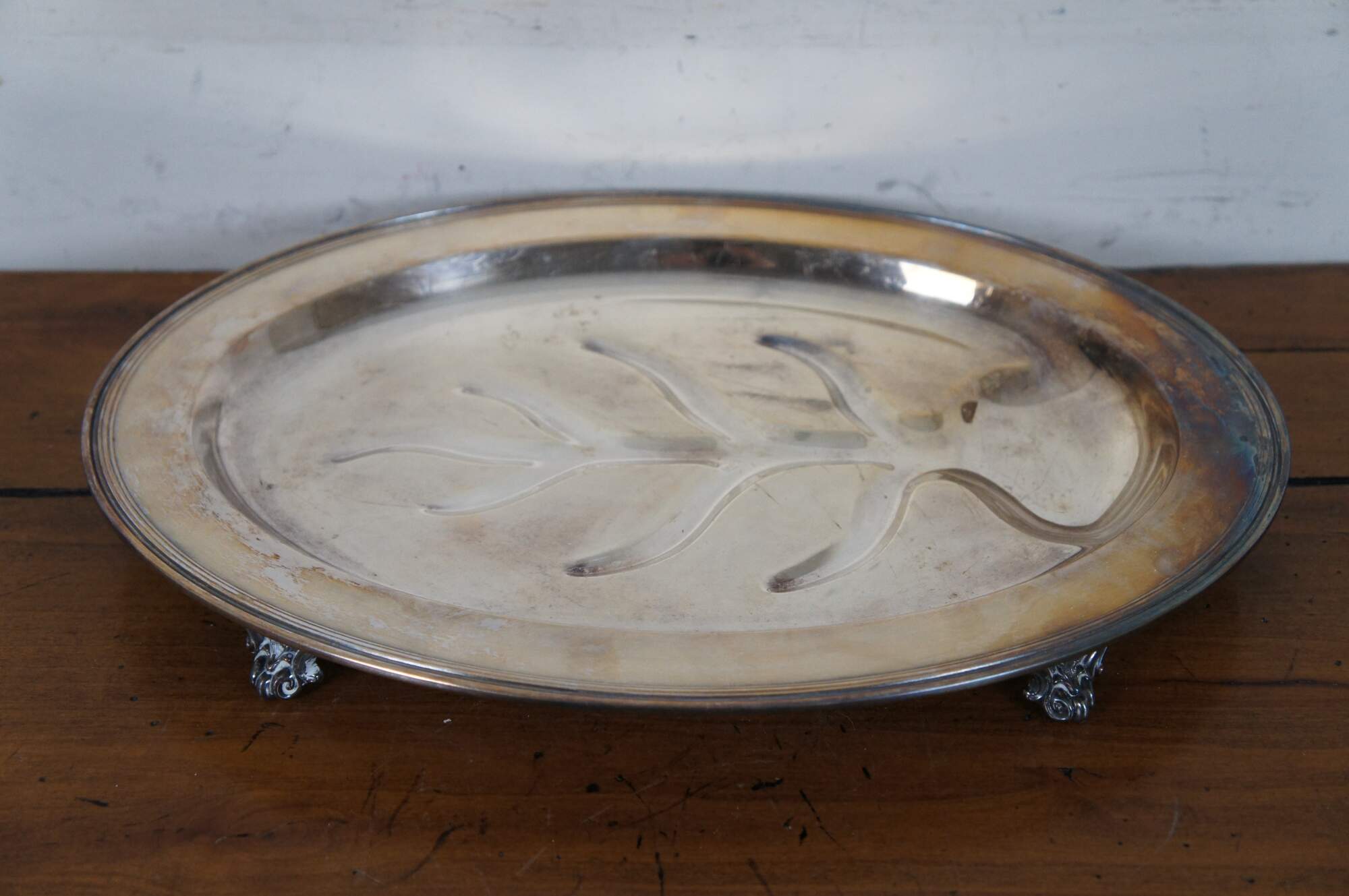 Vintage lot of five silver plate serving pieces including a Meriden Silver Plate / International Silver Company large, footed, oval meat tray; a smaller footed meat tray from Bergdorf Goodman, pattern number 3030; a Reed & Barton, number 5001, Mayflower pattern rectangular serving dish; Gorham number YC780 round, footed serving bowl / compote; and a small round plate by WMA Rogers.
