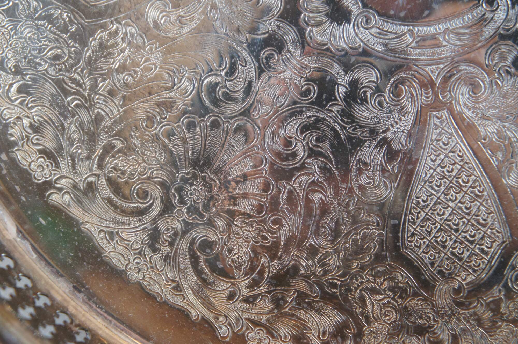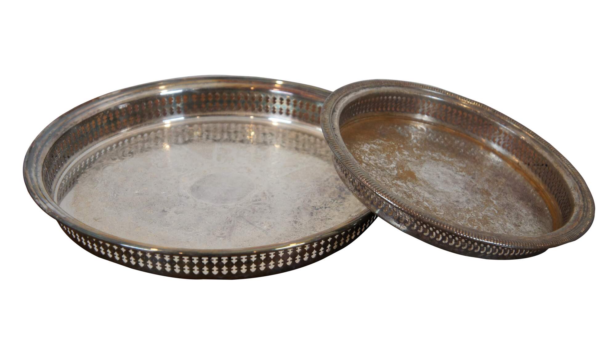 Pair of vintage round serving trays with raised and pierced gallery edge and etched floral surfaces – one by Gorham, number YC 1739 and one by WM Rogers Manufacturing Co, number 4270G.