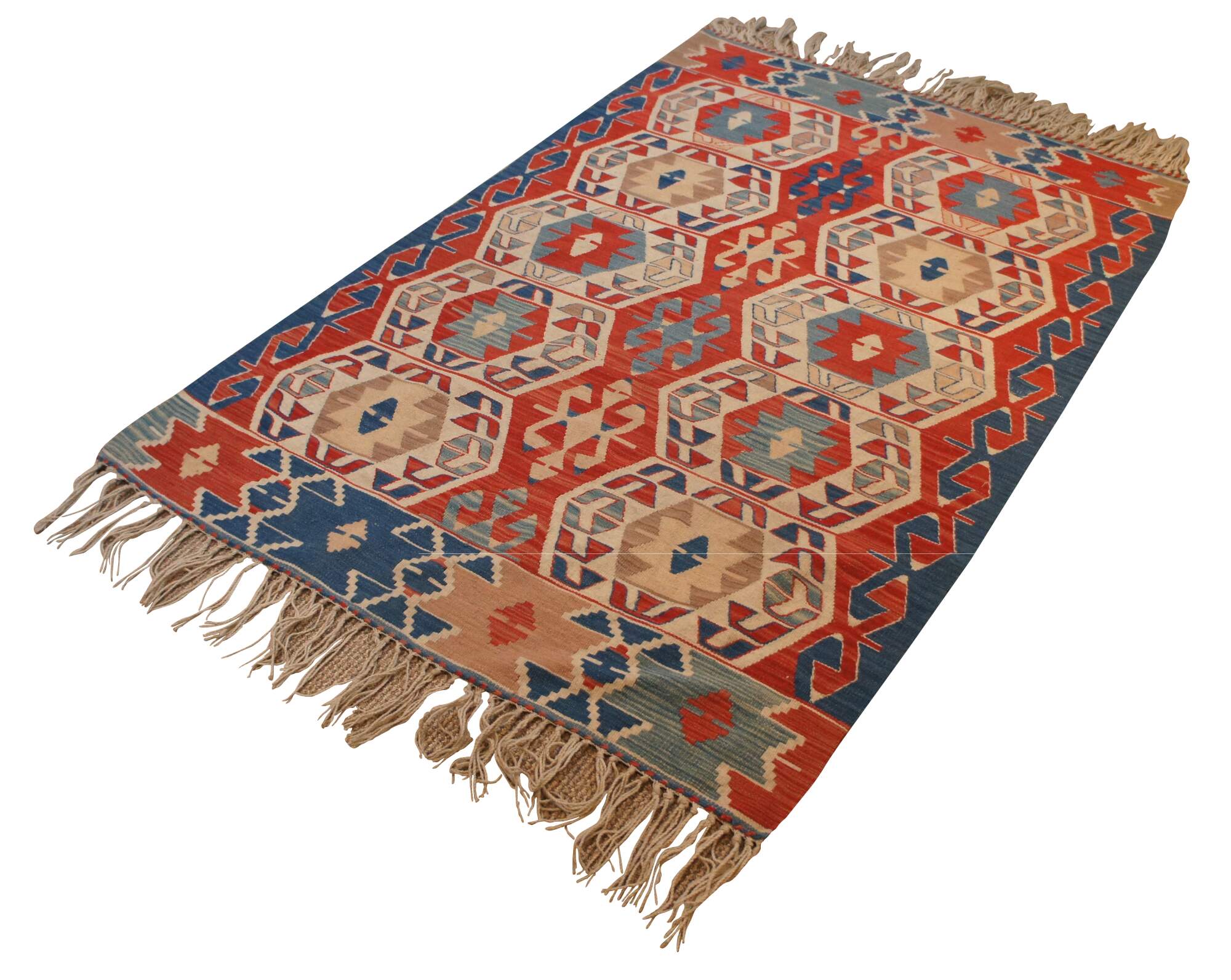 Vintage red, blue and beige geometric Turkish kilim rug with fringe. Approx 3' x 5'.