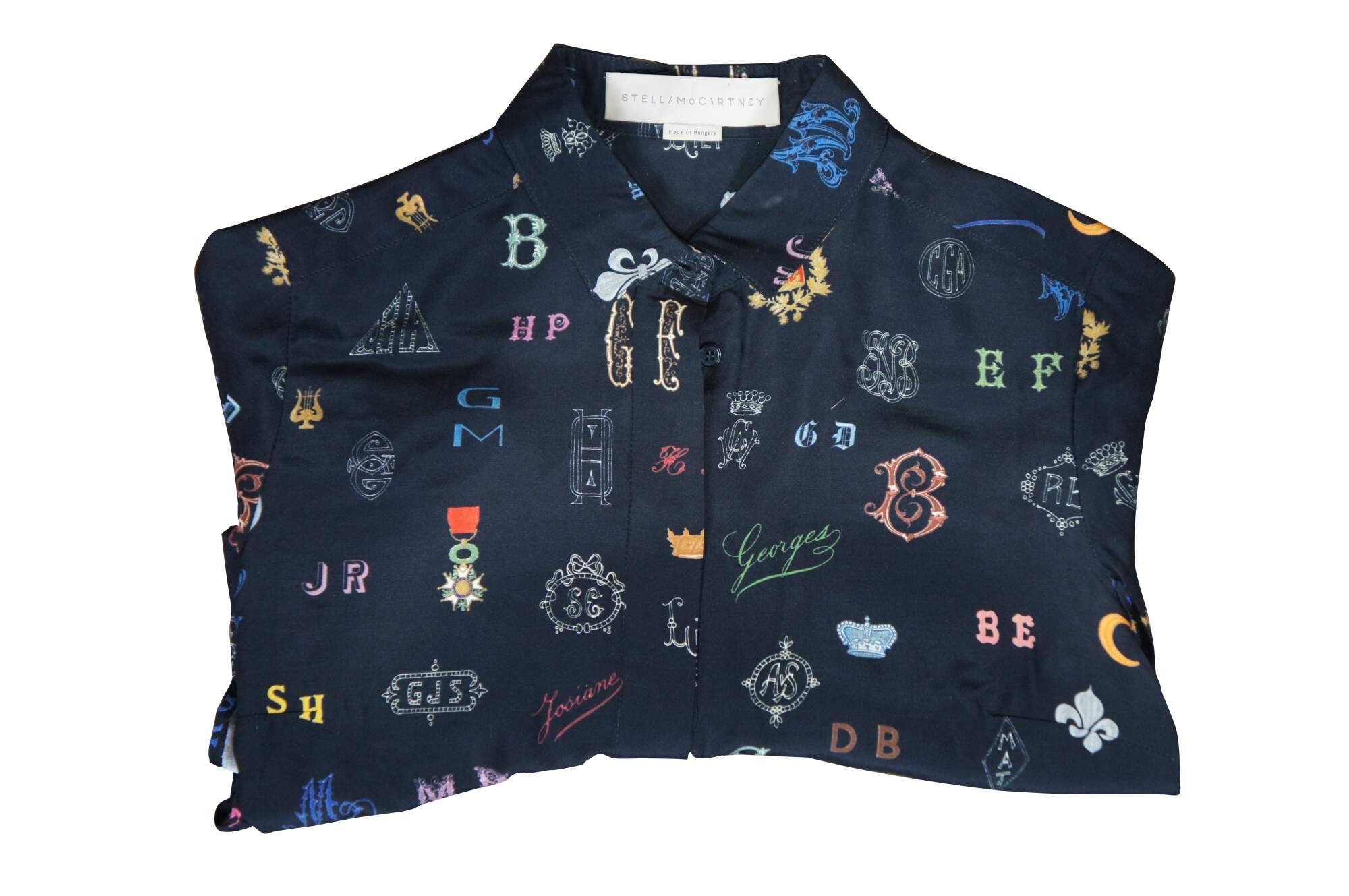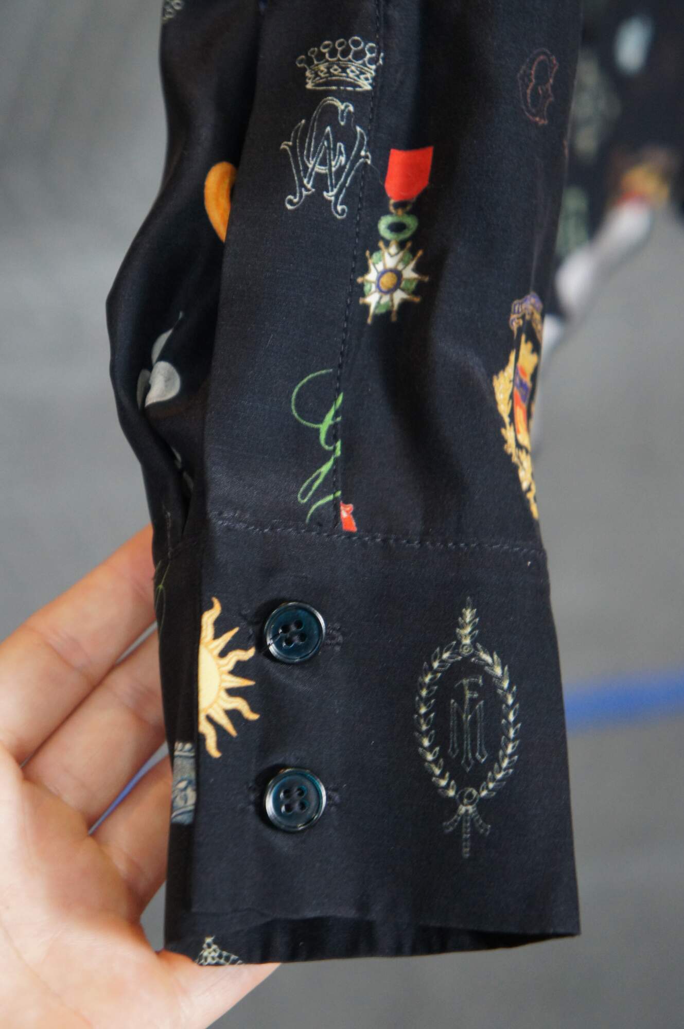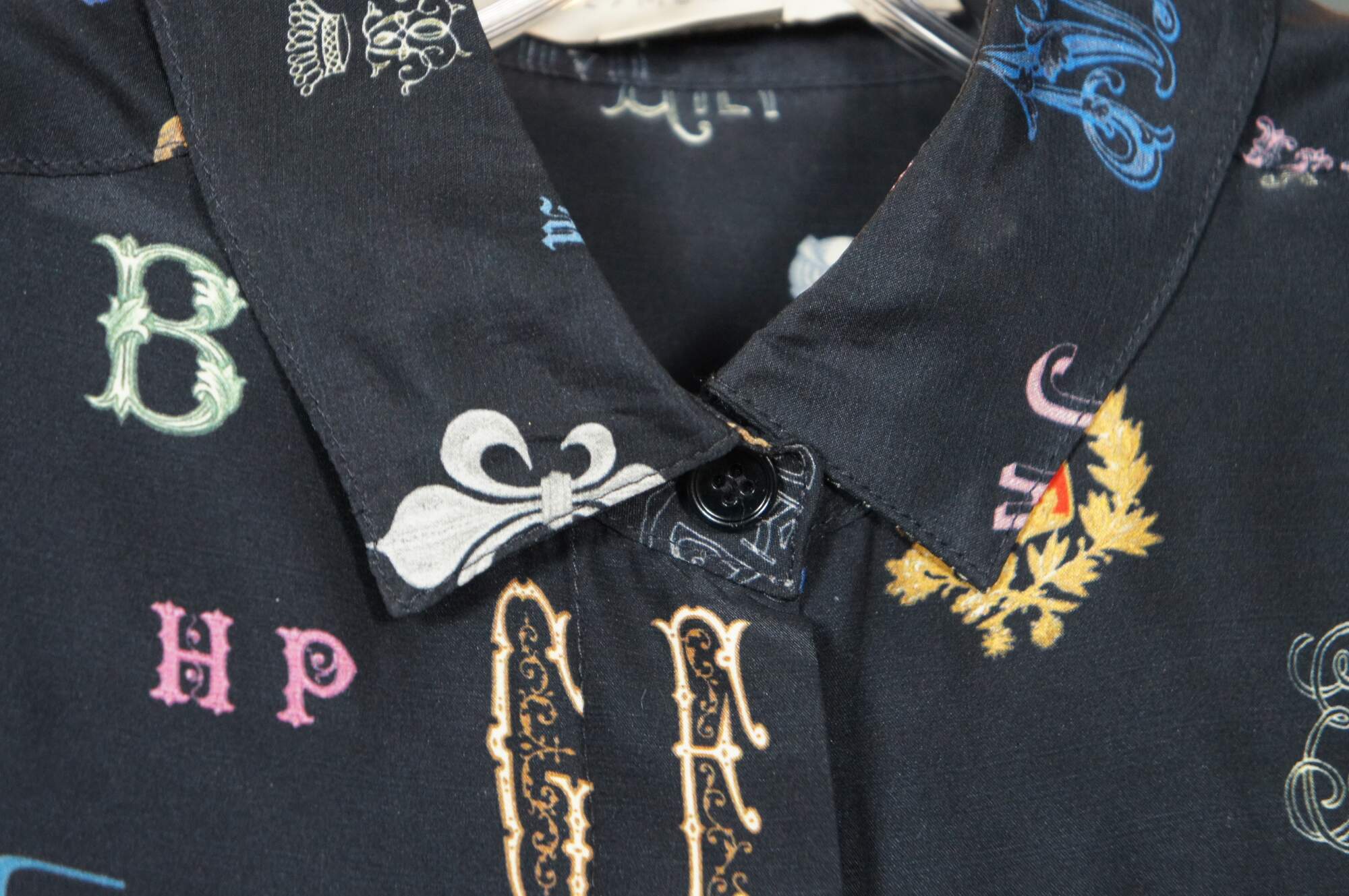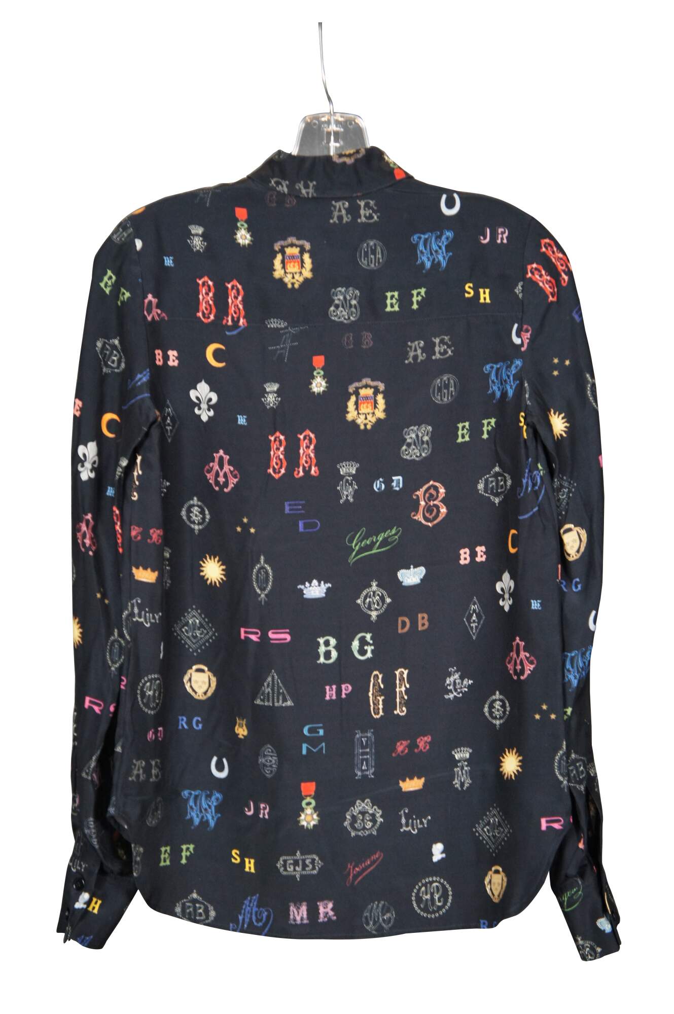 Vintage Stella McCartney 100% silk button up monogram logo shirt / long sleeve blouse with printed pattern on black ground and hem slightly longer in the back then the front. Made in Hungary.