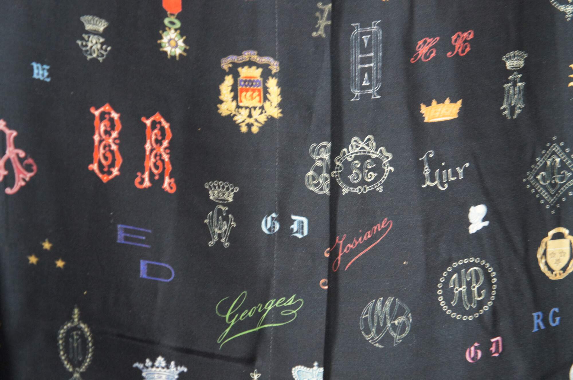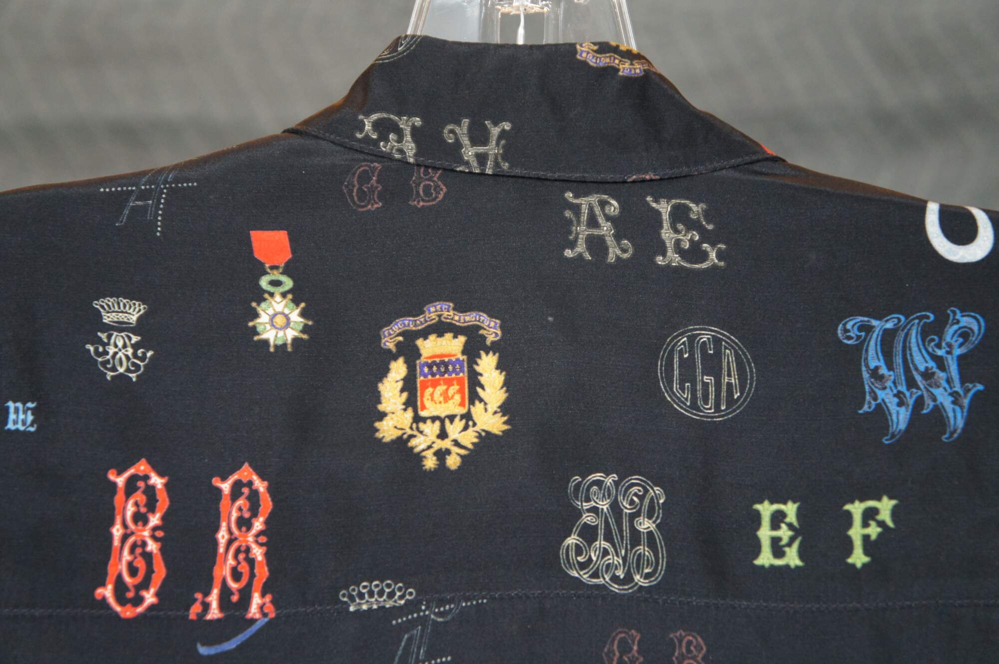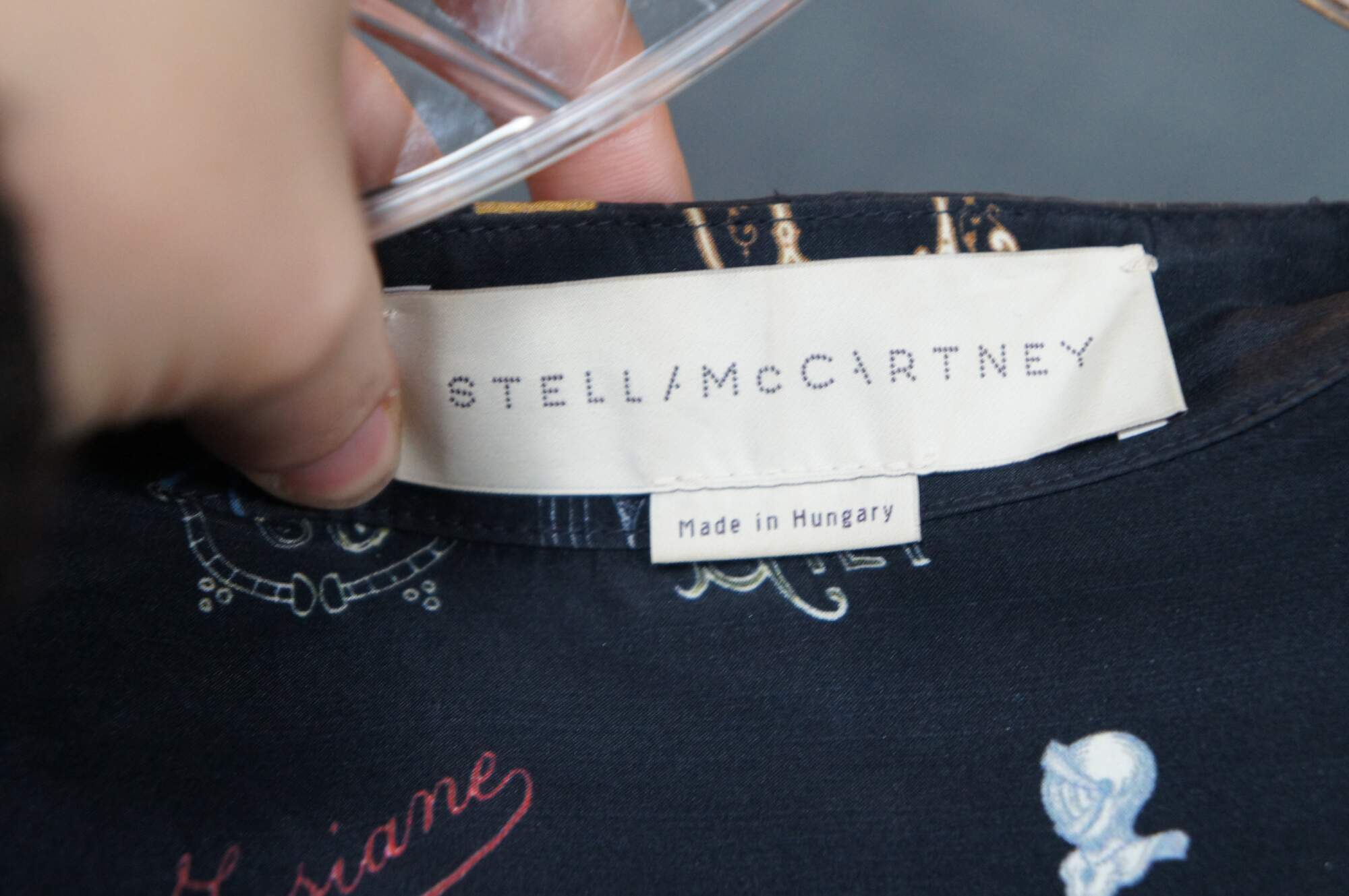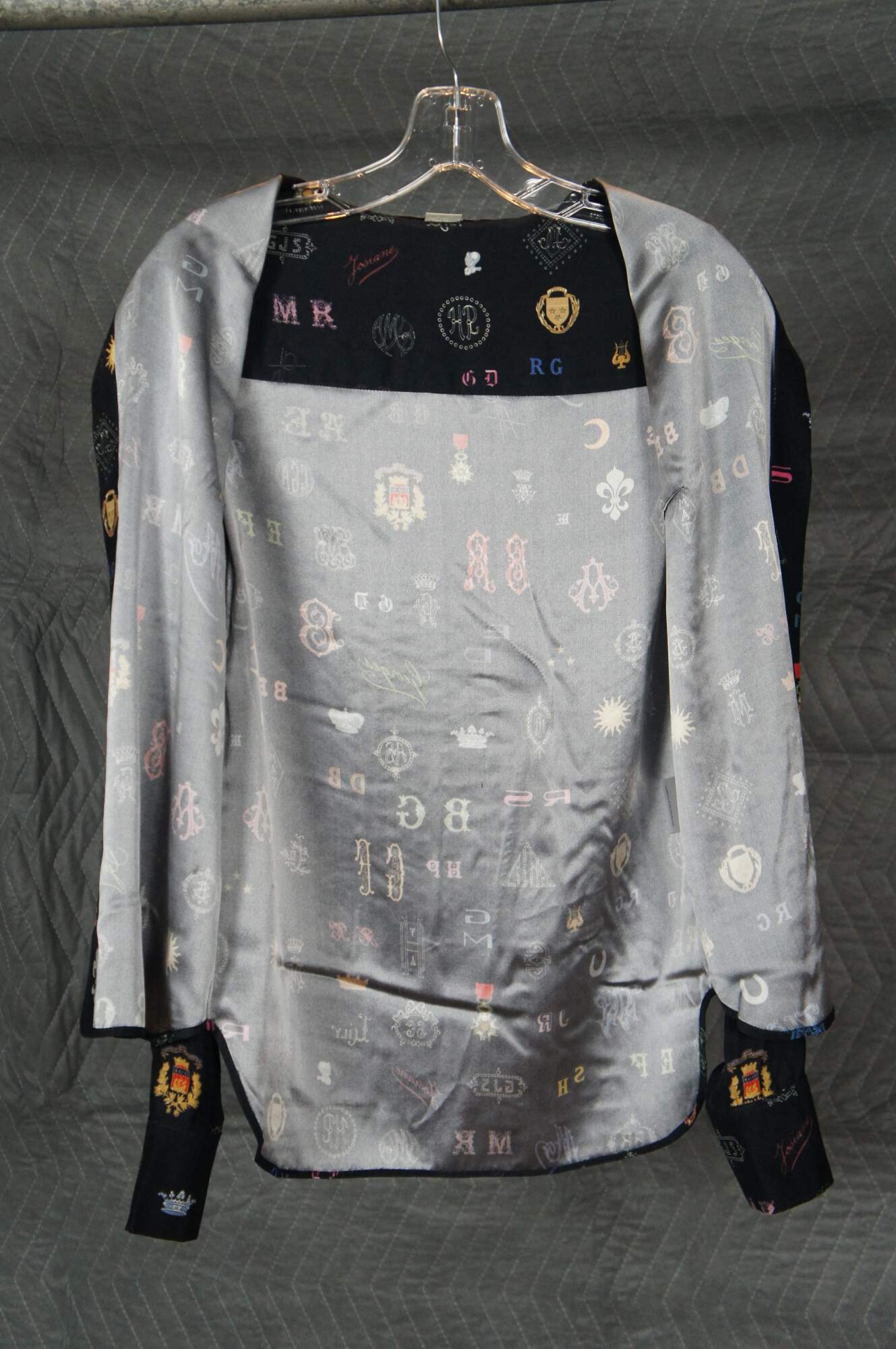 Vintage Stella McCartney 100% silk button up monogram logo shirt / long sleeve blouse with printed pattern on black ground and hem slightly longer in the back then the front. Made in Hungary.