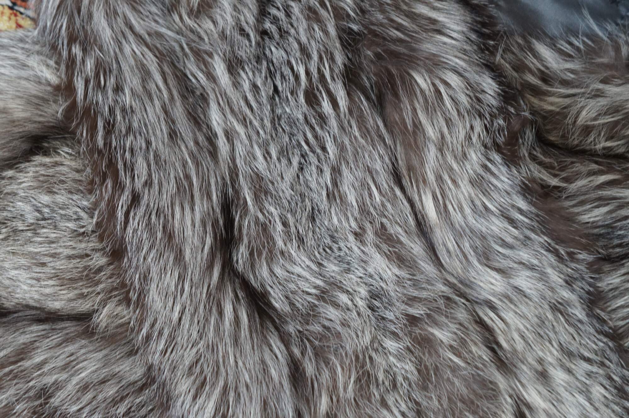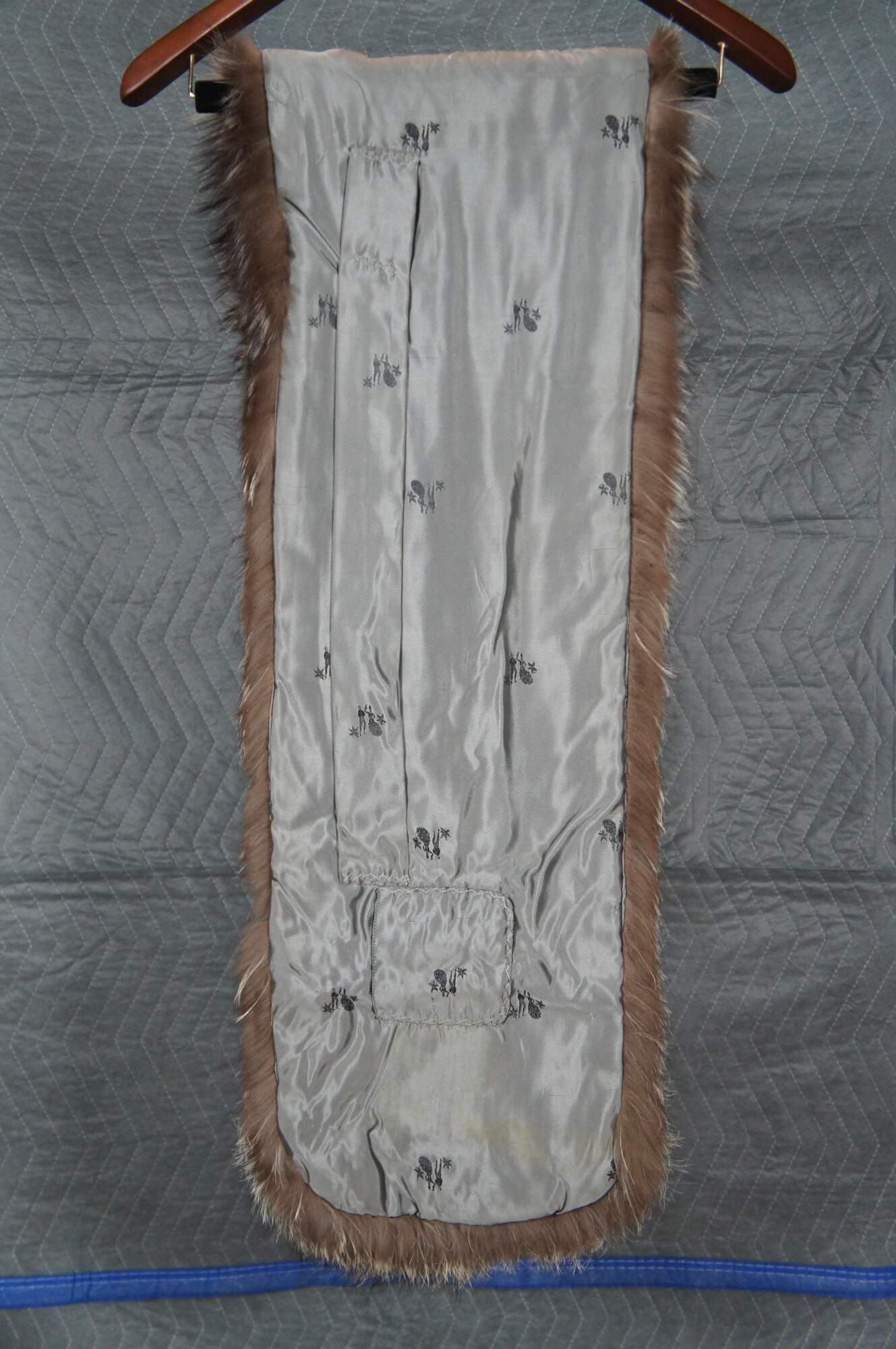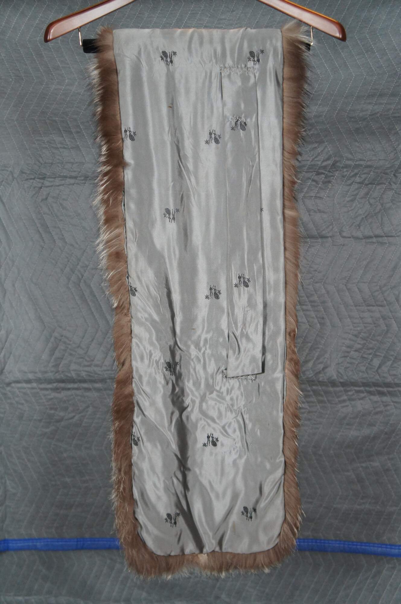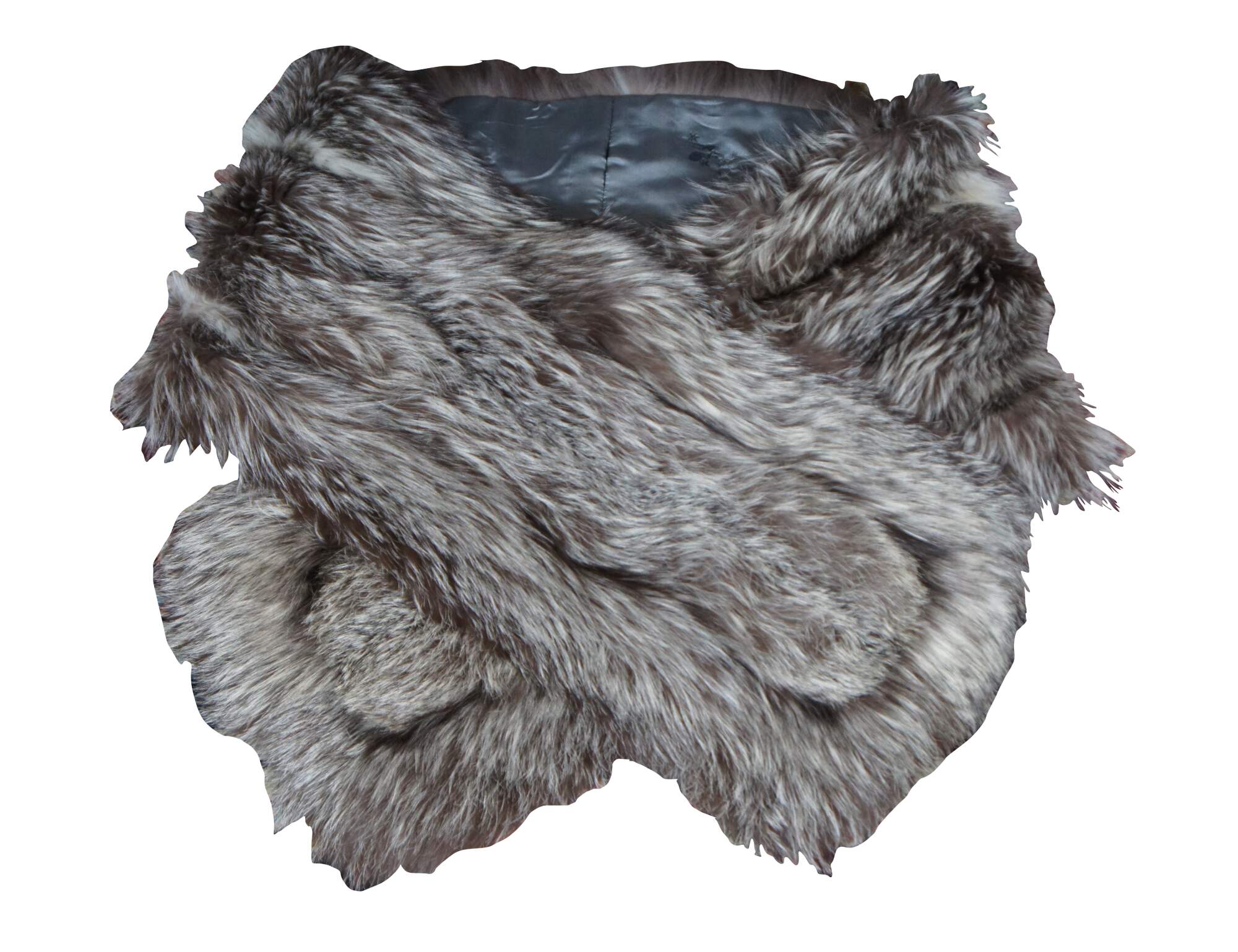 Vintage mid to late 20th century dark brown / white / gray authentic fox fur stole / wrap featuring interior shoulder straps and one small interior pocket. Lined with silk patterned with romantic figures.