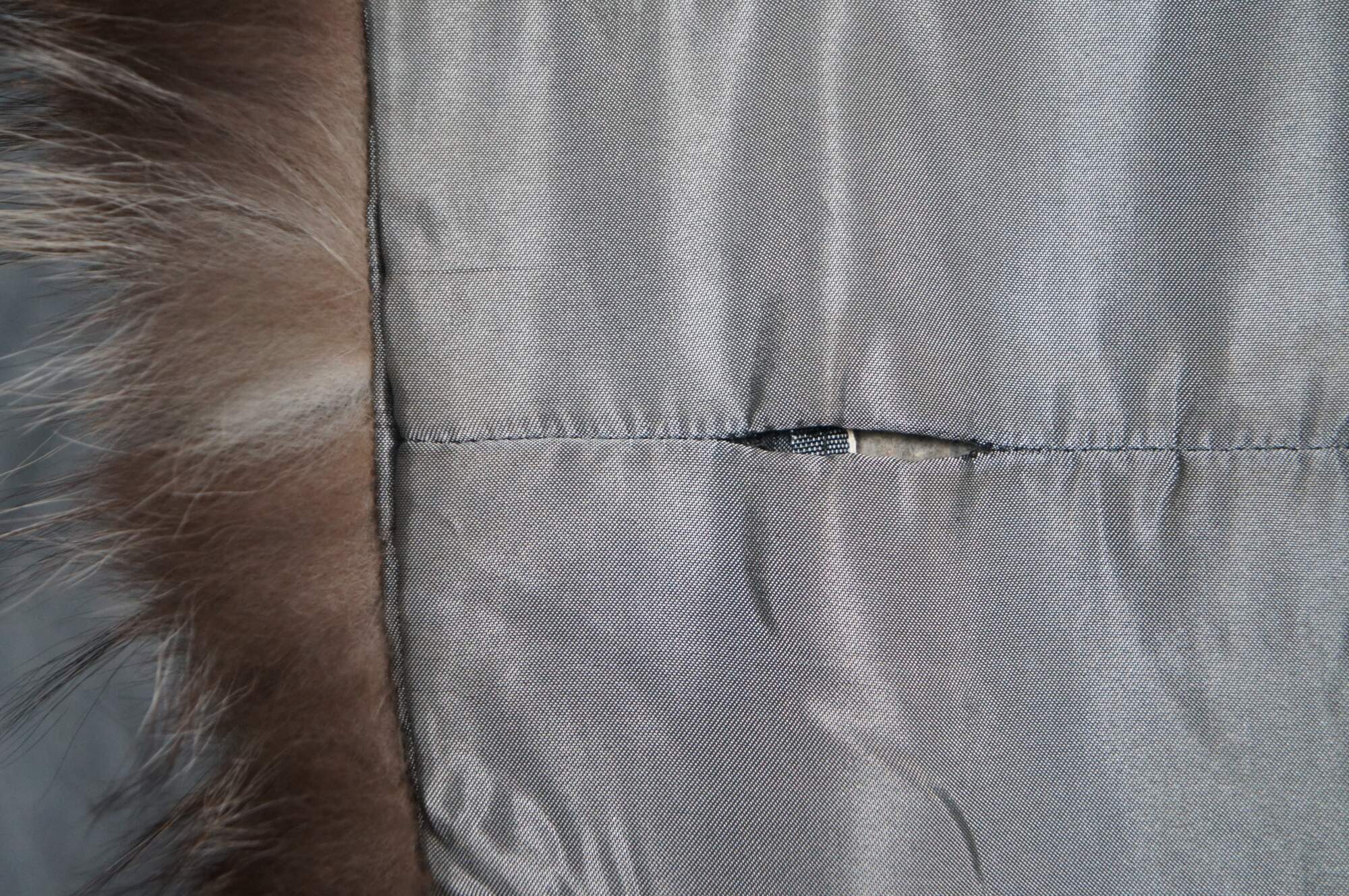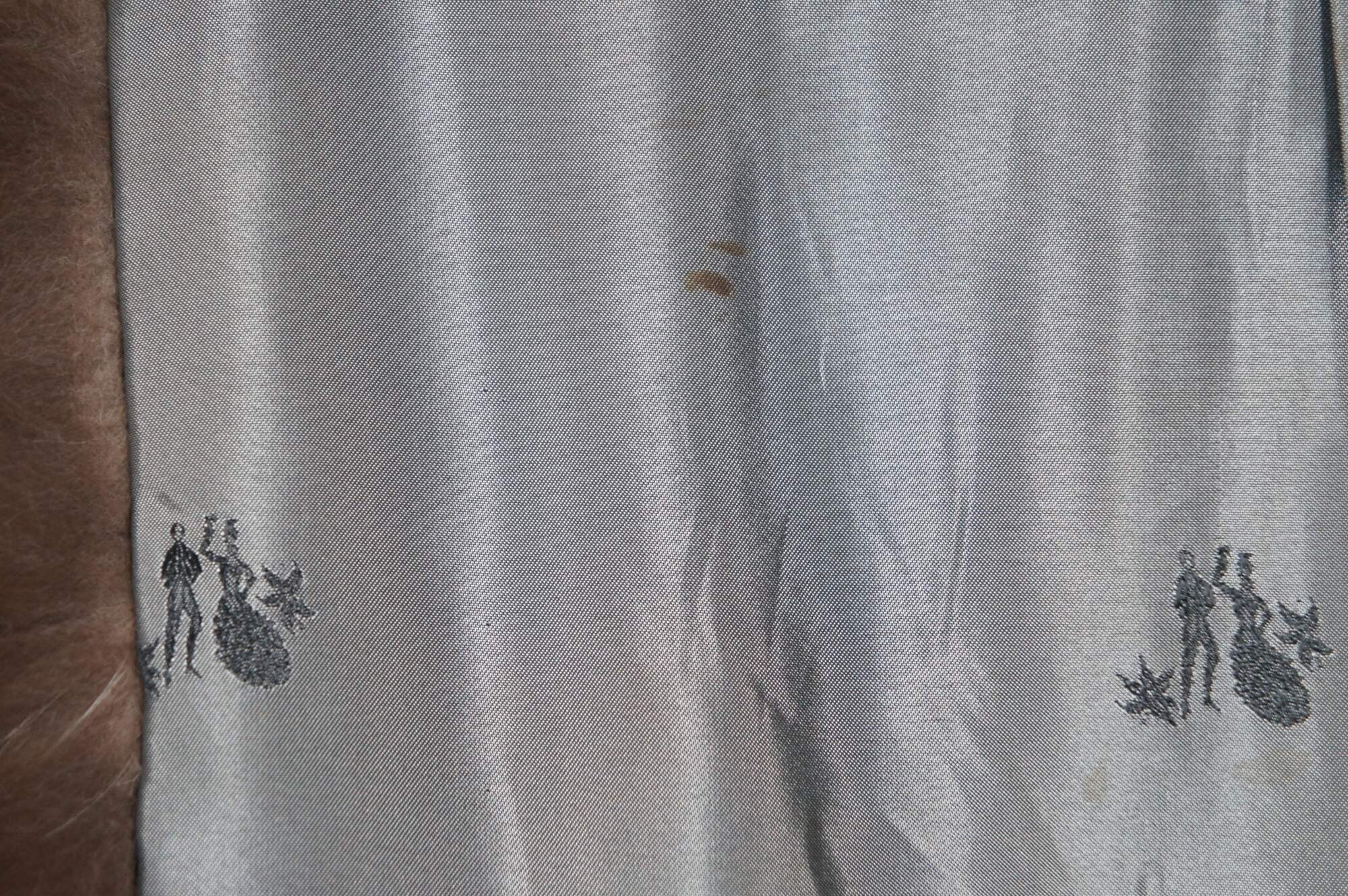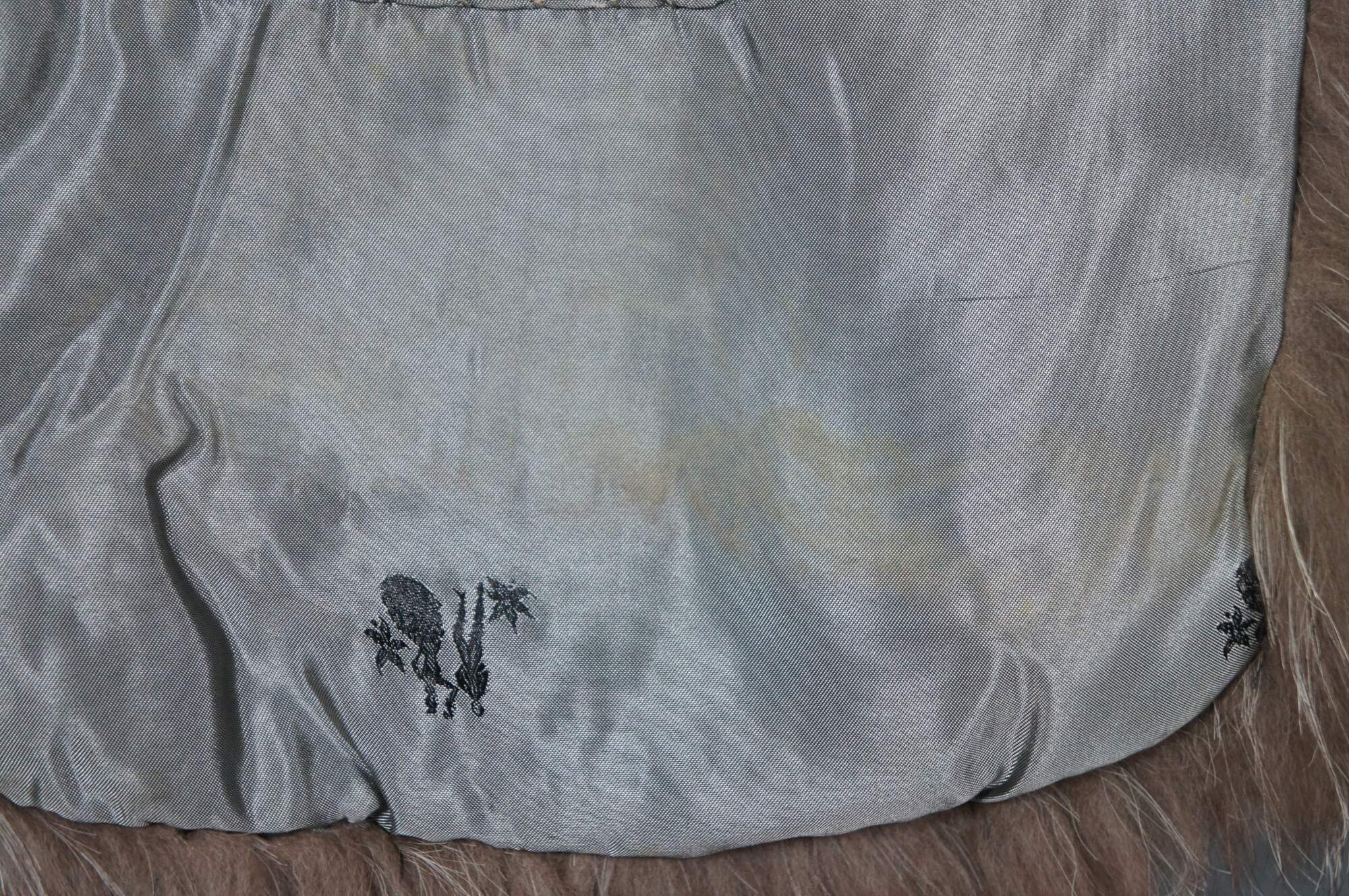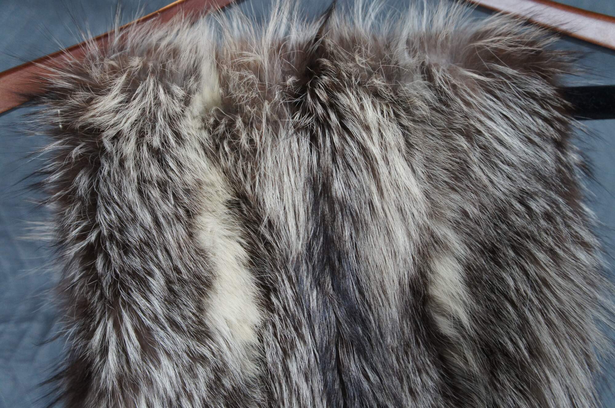 Vintage mid to late 20th century dark brown / white / gray authentic fox fur stole / wrap featuring interior shoulder straps and one small interior pocket. Lined with silk patterned with romantic figures.