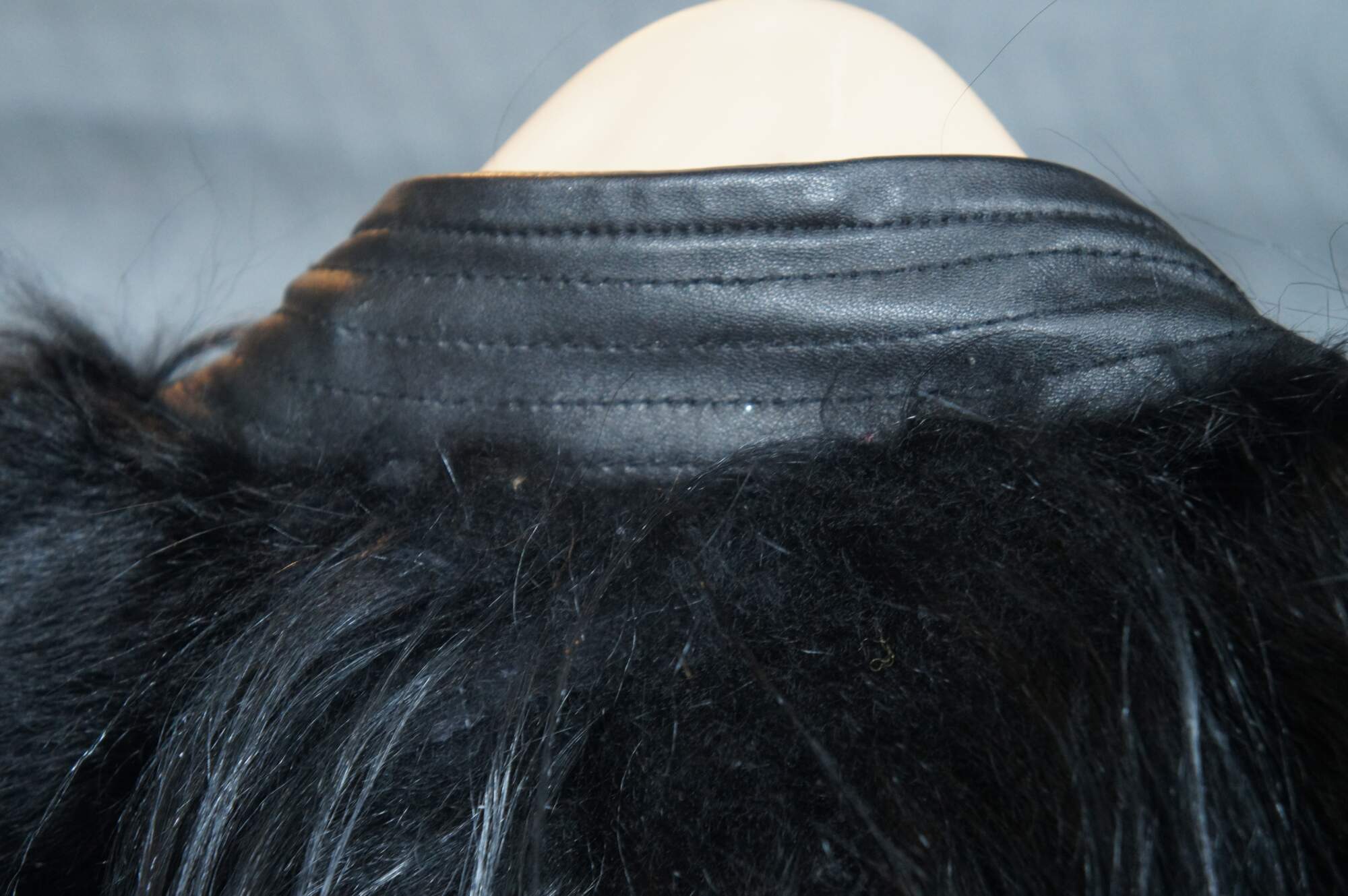 Stunning Elizabeth and James women’s black fur and leather jacket featuring alternating sections of genuine long haired goat fur, rabbit fur and lamb leather. Full zip closure.