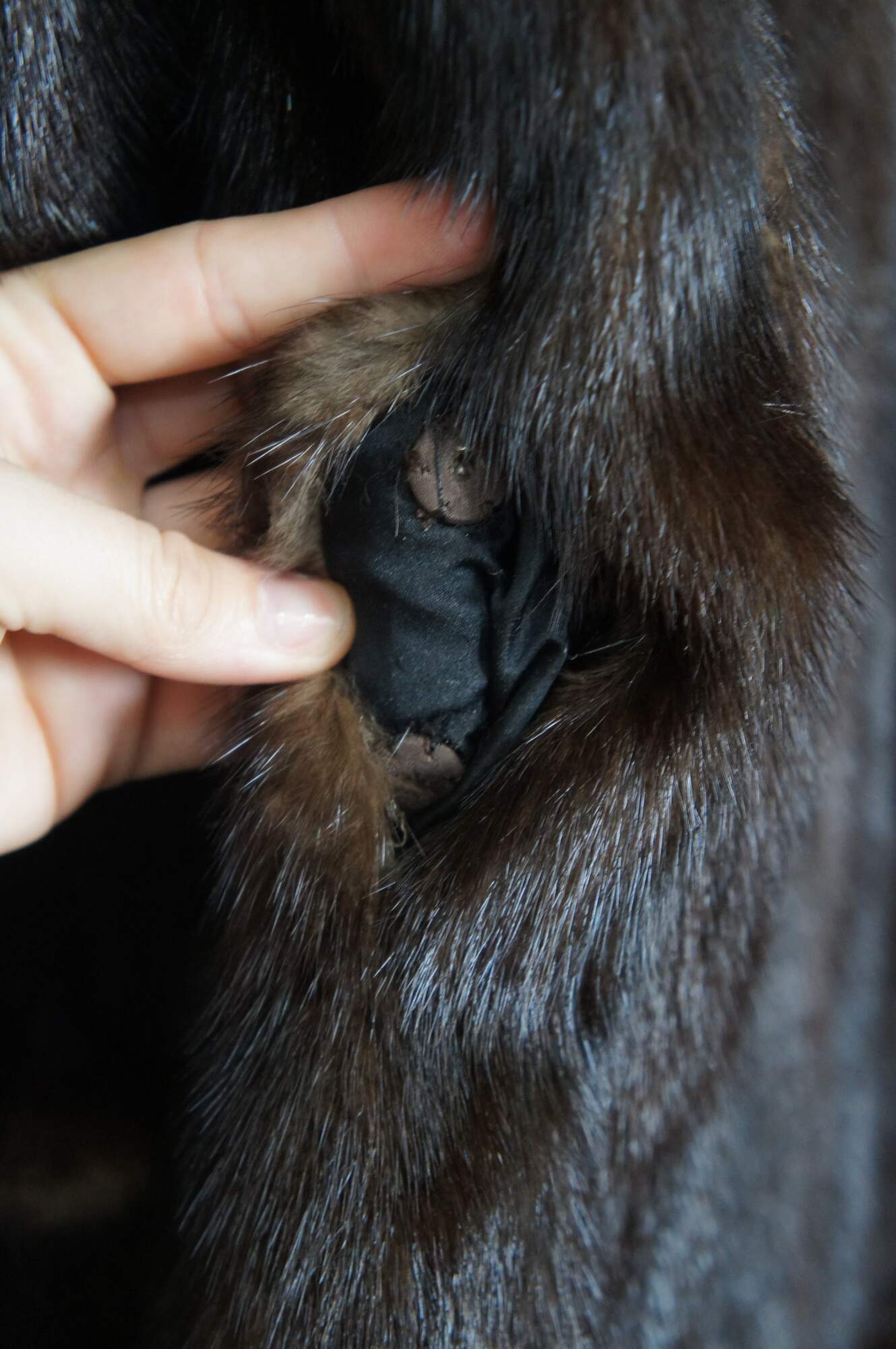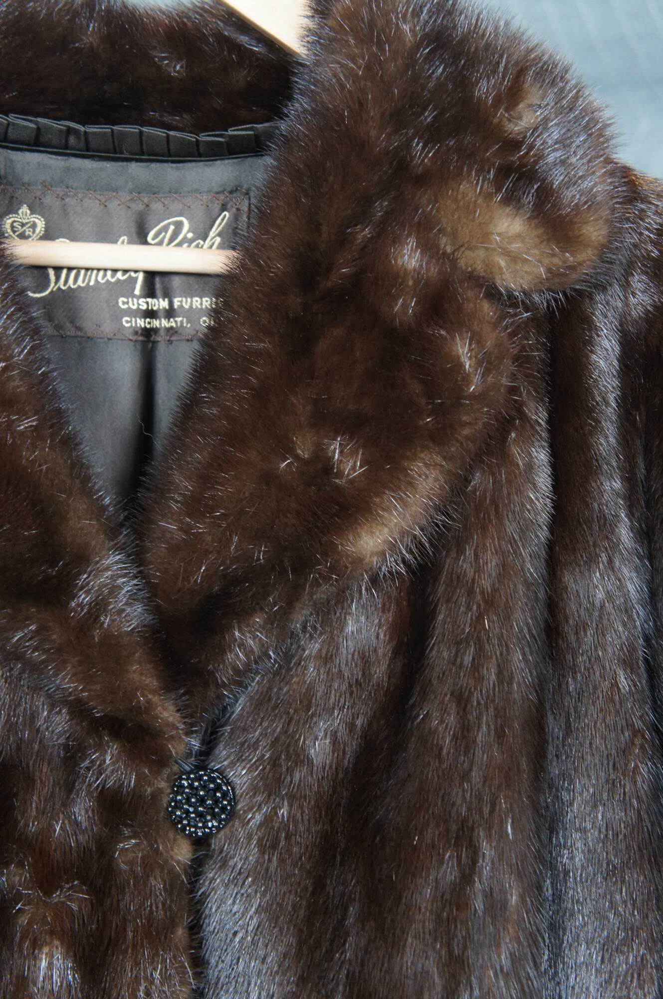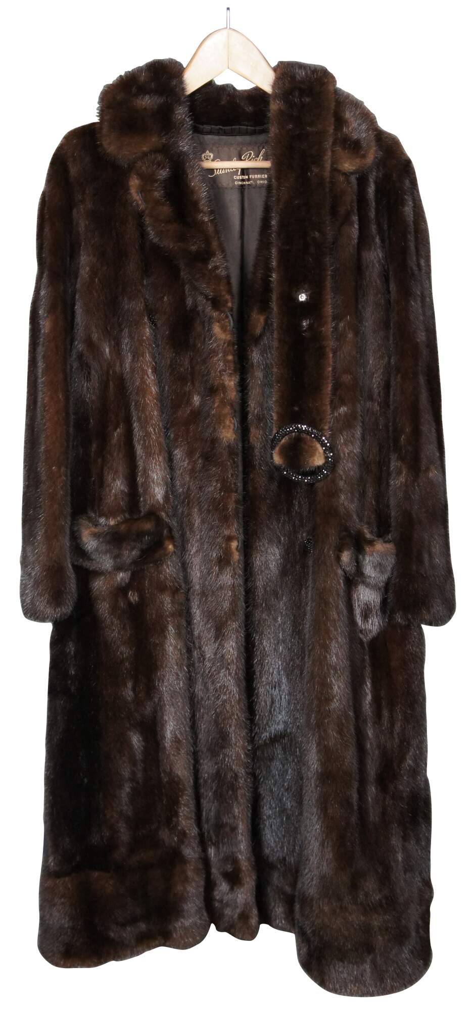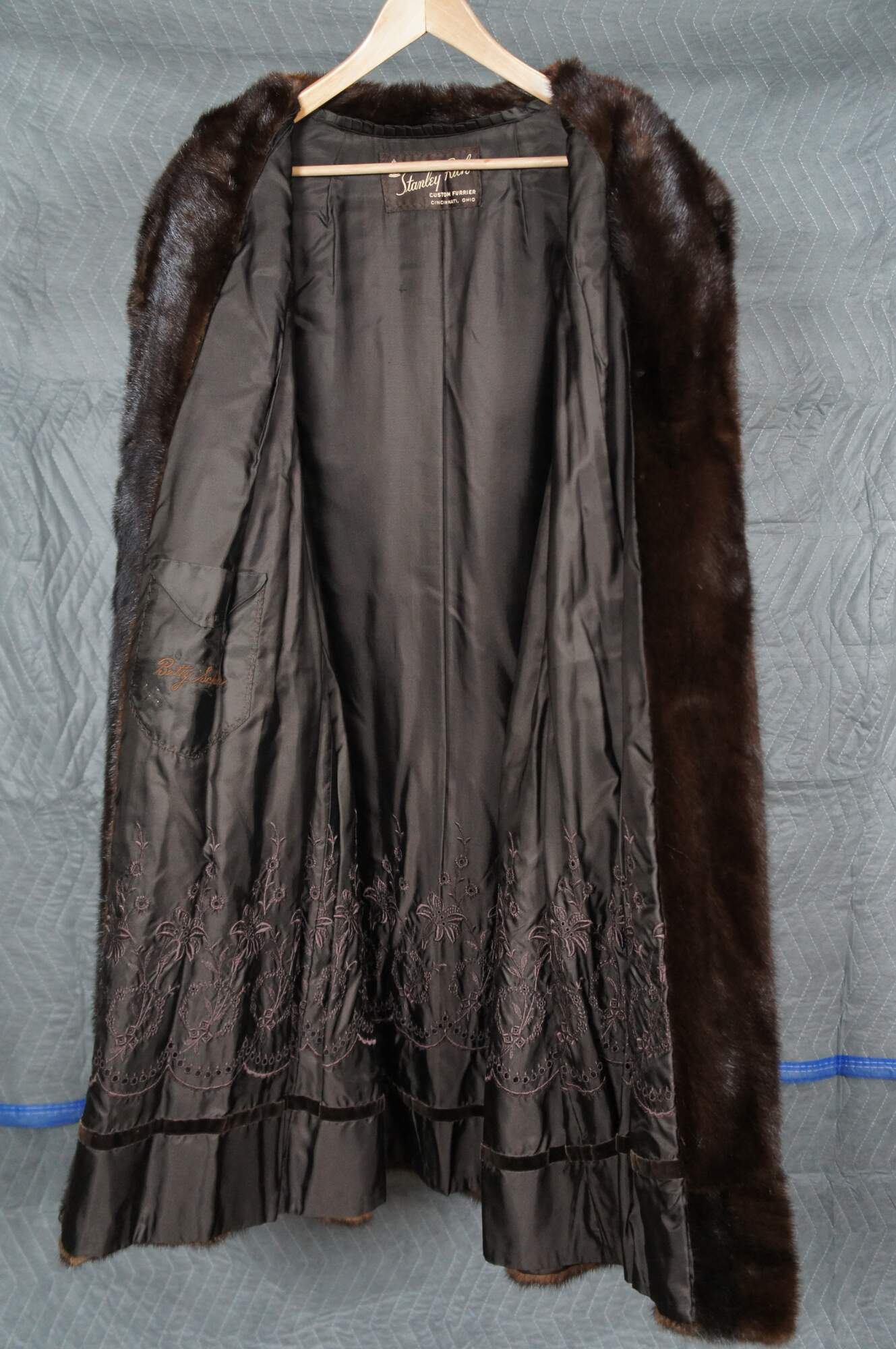 Vintage dark brown mink coat by Stanley Rich of Cincinnati, Ohio, full length with two front pockets, double breasted with two rows of black rhinestone studded buttons, and belt with matching ring buckle. Floral embroidered lining with single interior pocket. Owner was approx. 5'3", 100lbs.
