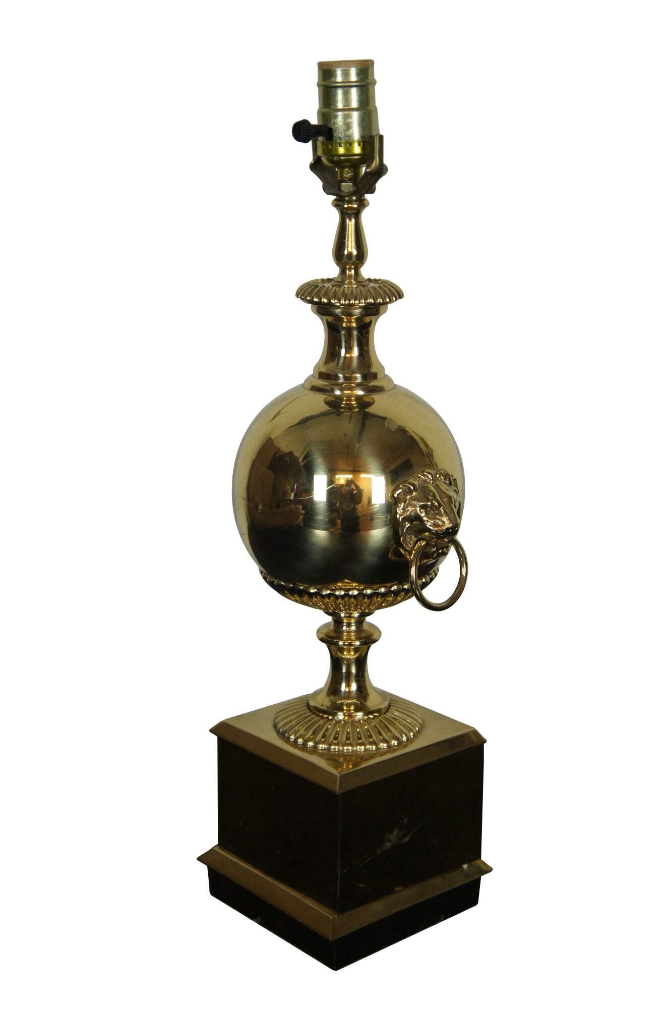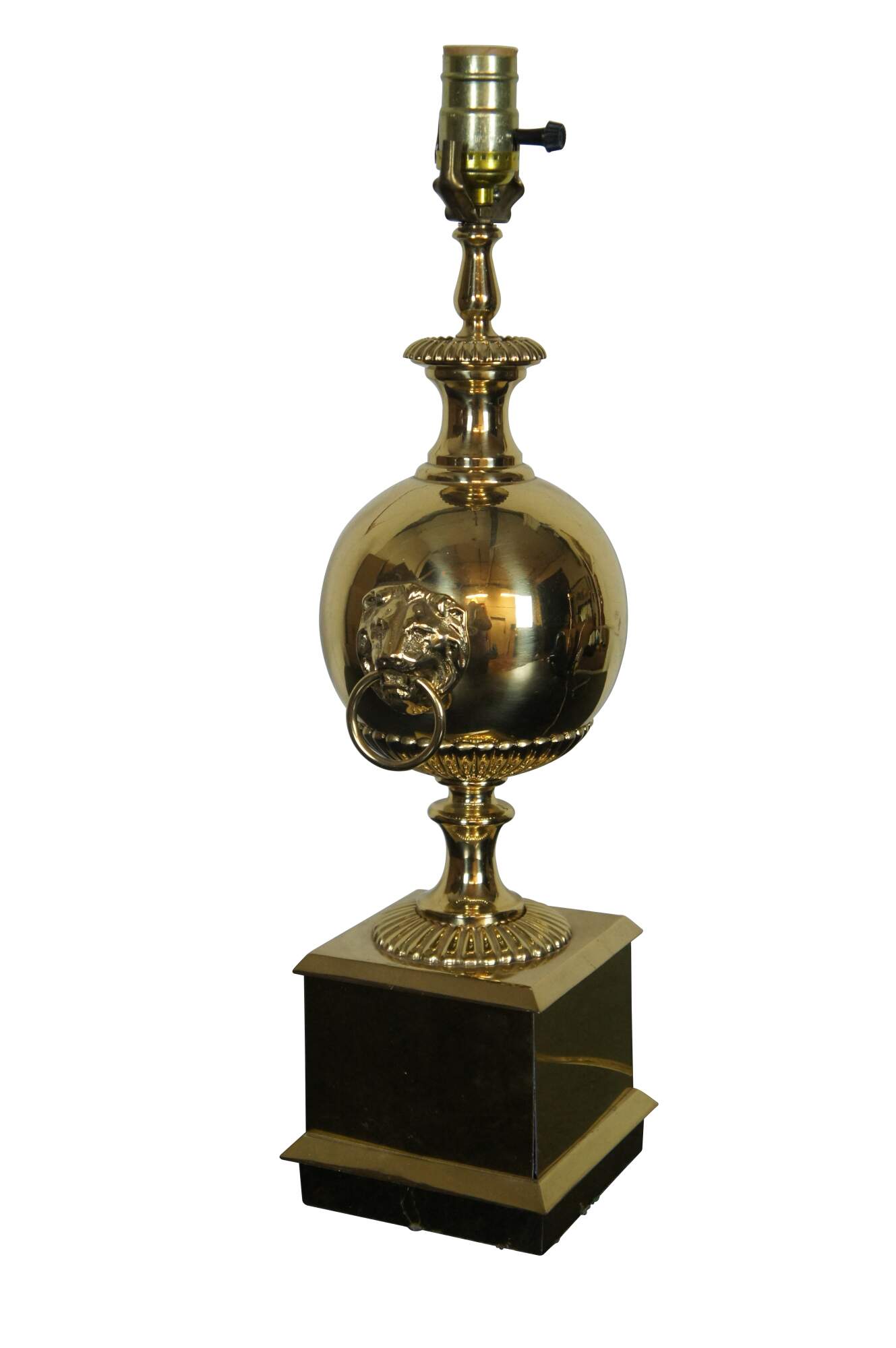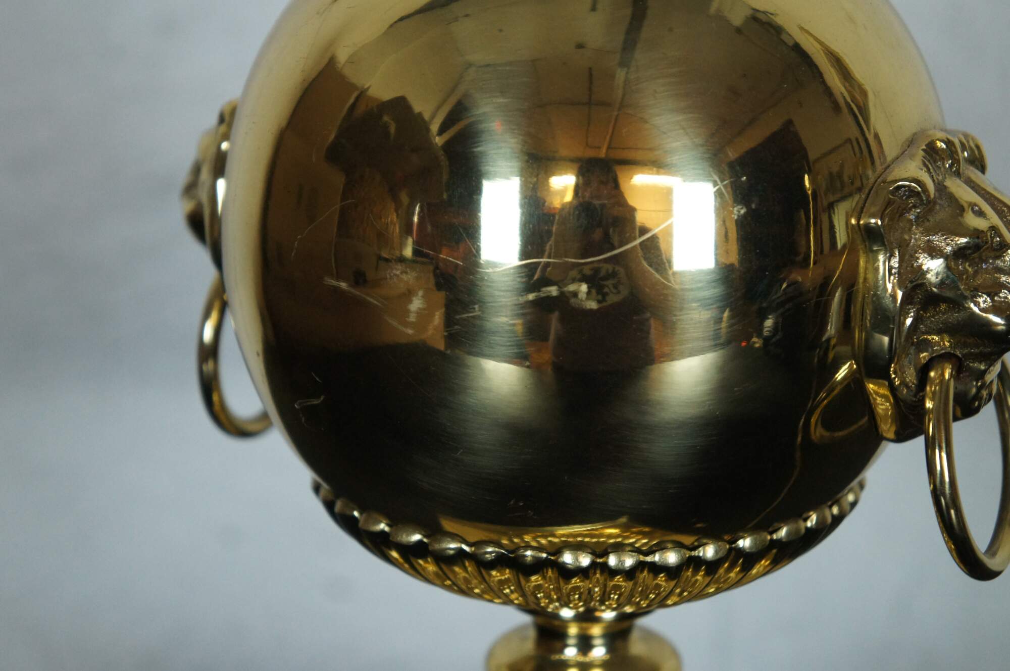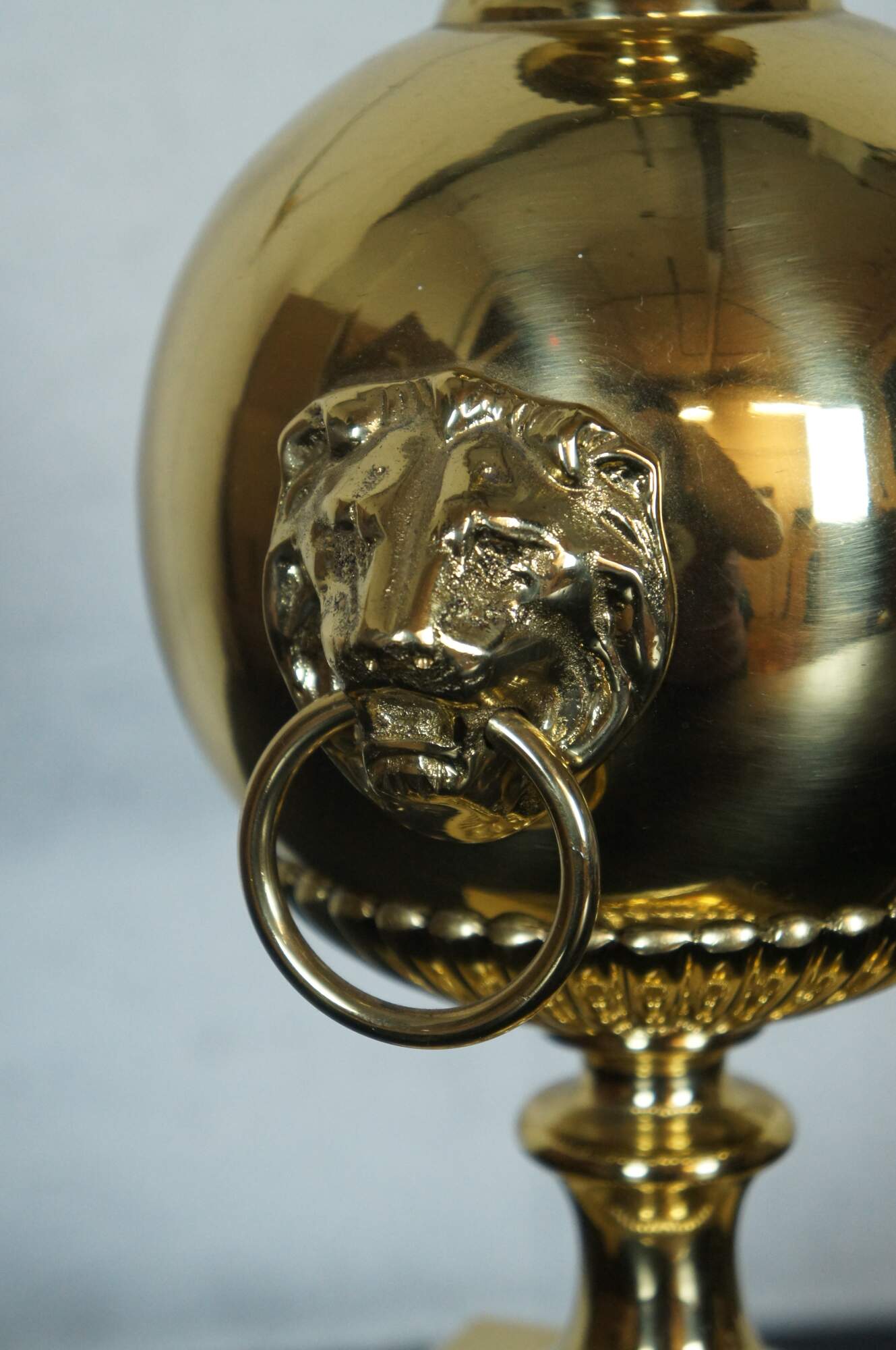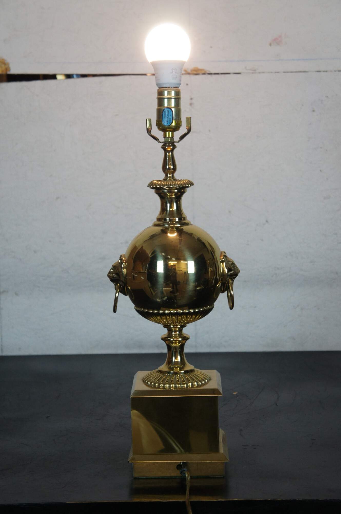 Vintage brass cannonball trophy lamp featuring round urn shaped body with lion head ring knockers and square pedestal base.