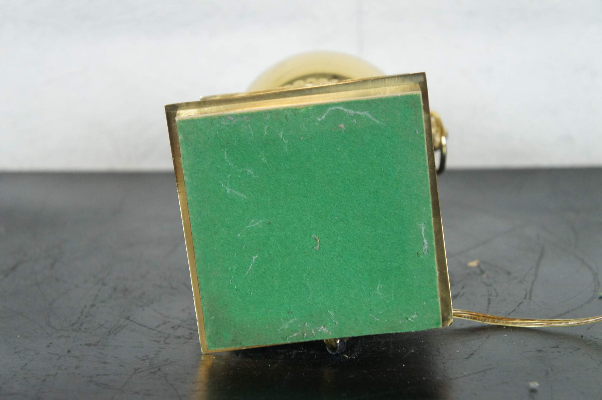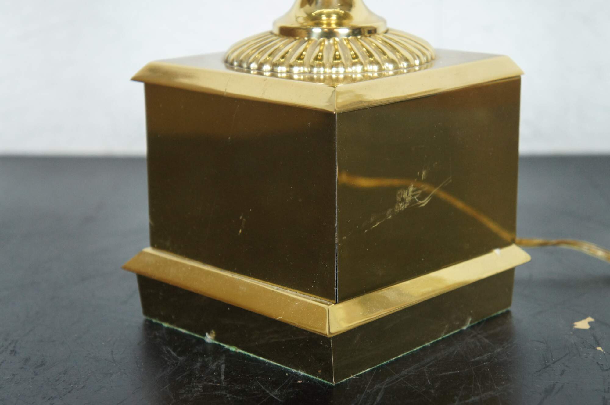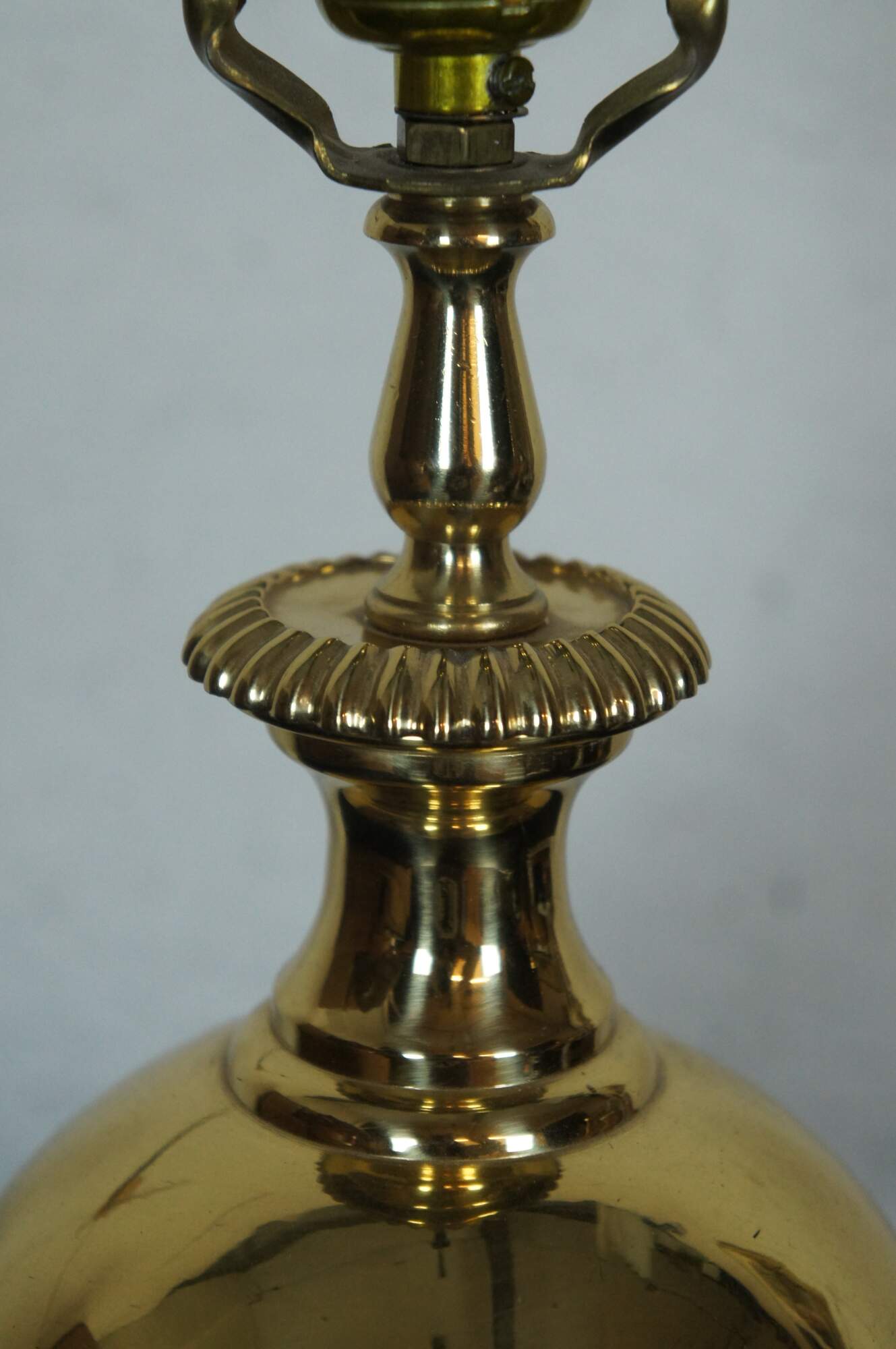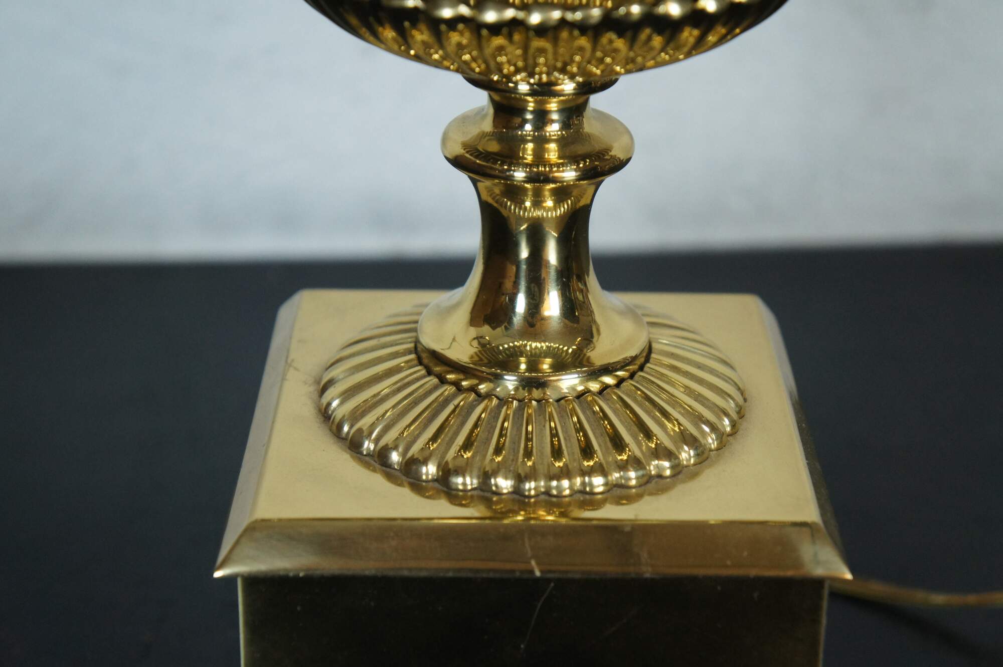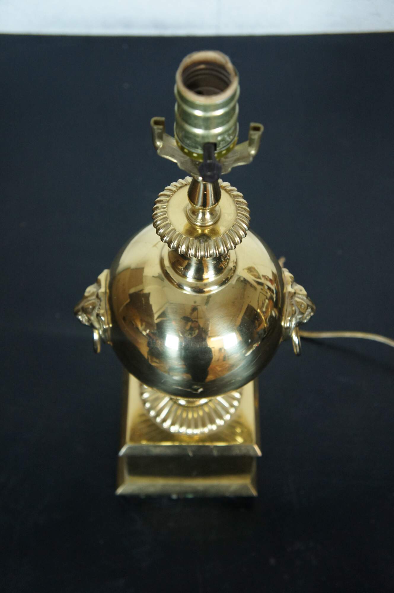 Vintage brass cannonball trophy lamp featuring round urn shaped body with lion head ring knockers and square pedestal base.