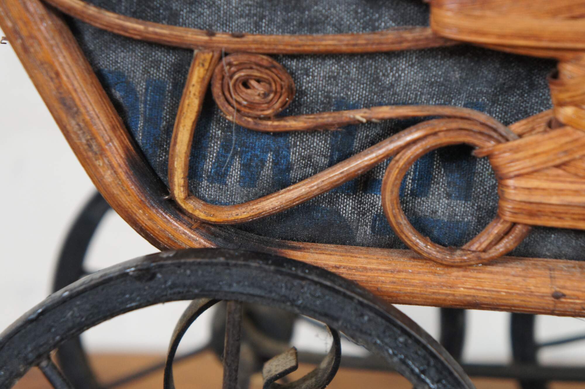 Antique Victorian doll sized baby buggy or carriage, crafted of wood and wicker accents, with iron banded wheels and wrought handle, lined and hooded with black cloth.