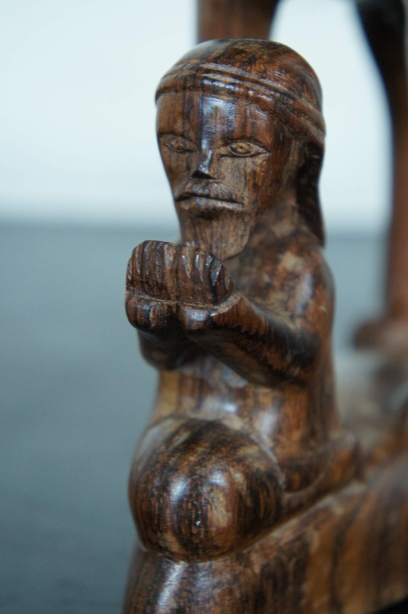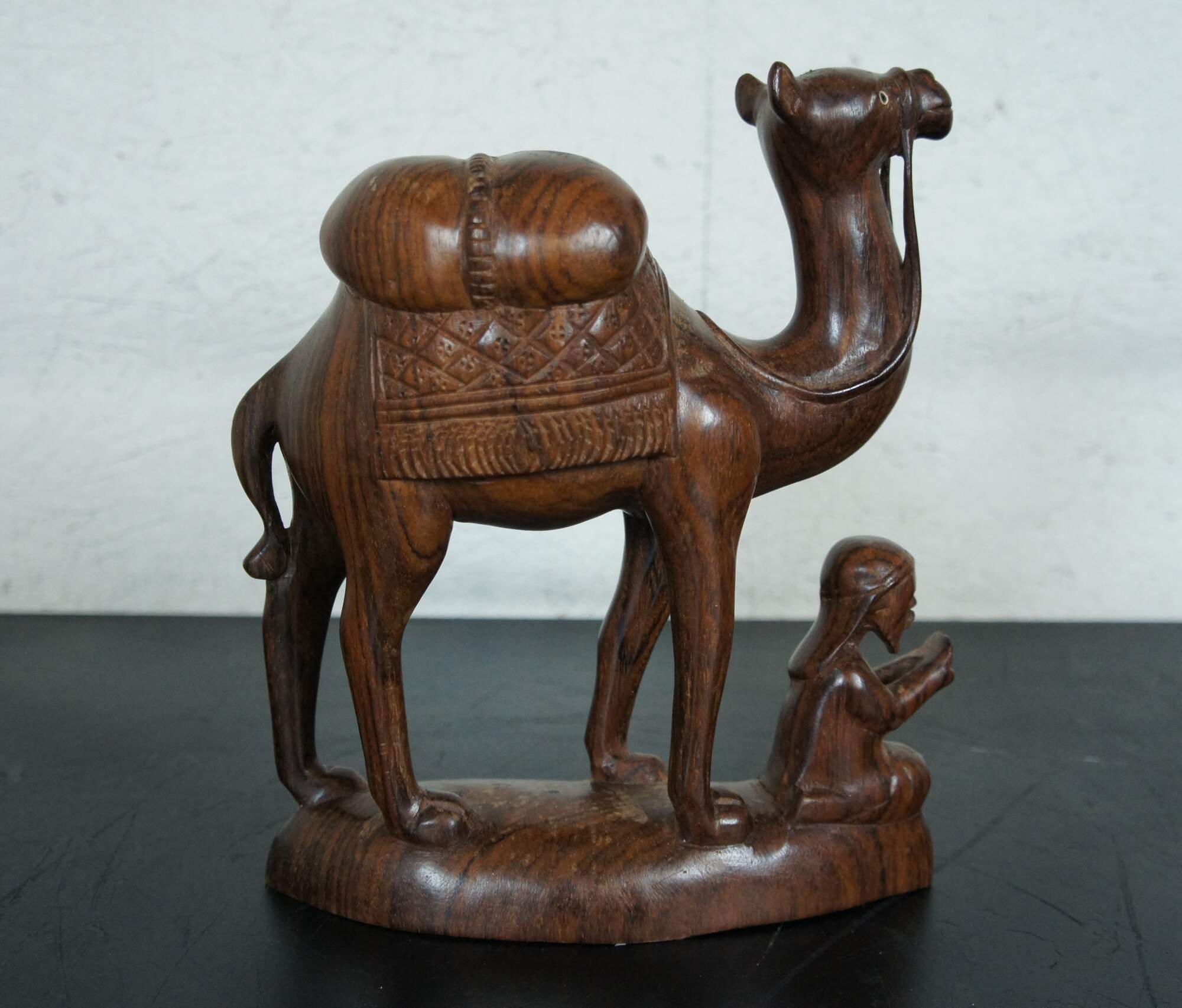 Vintage carved wood sculpture featuring a camel laden for a journey, standing over a kneeling figure at prayer.