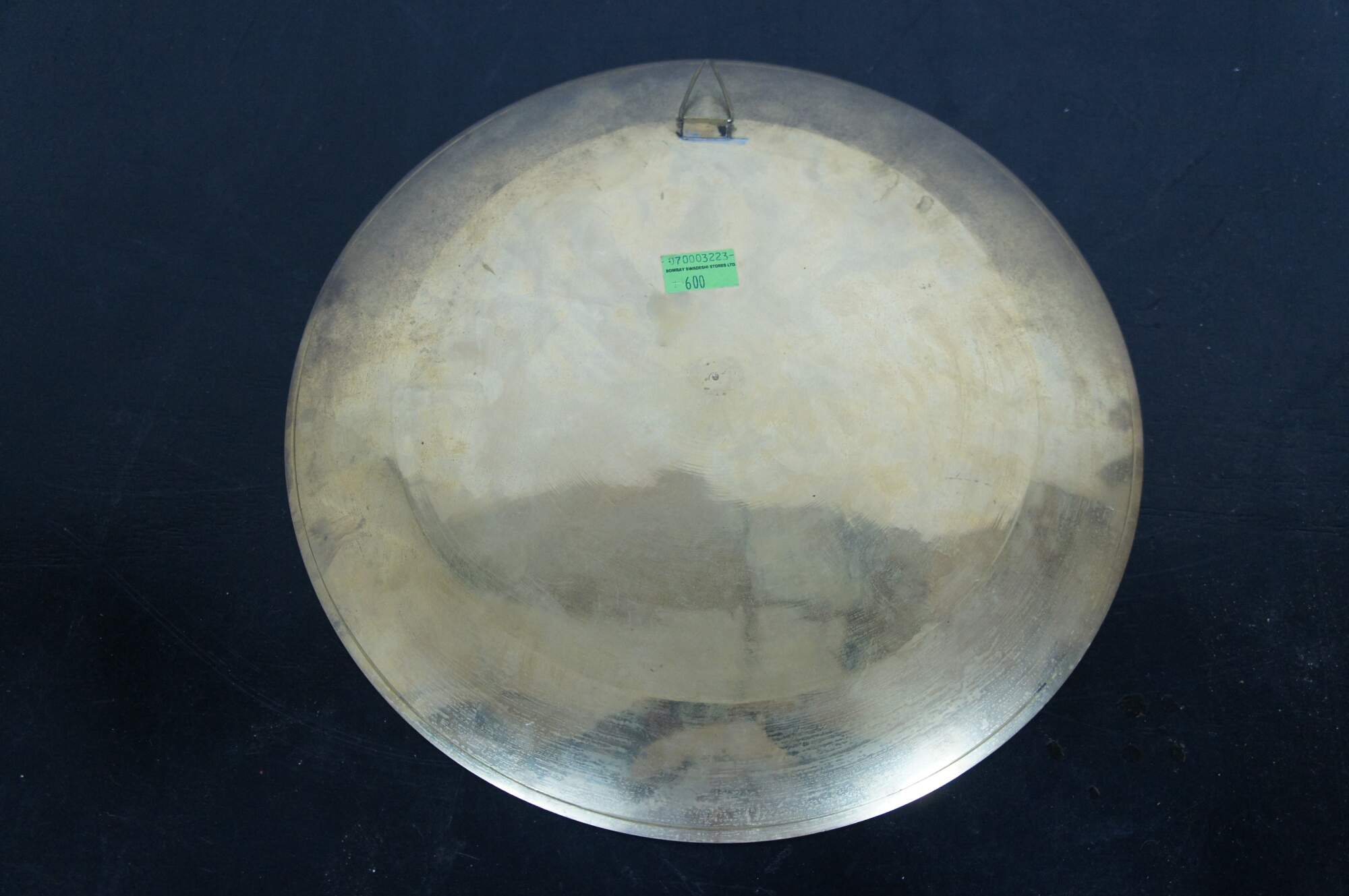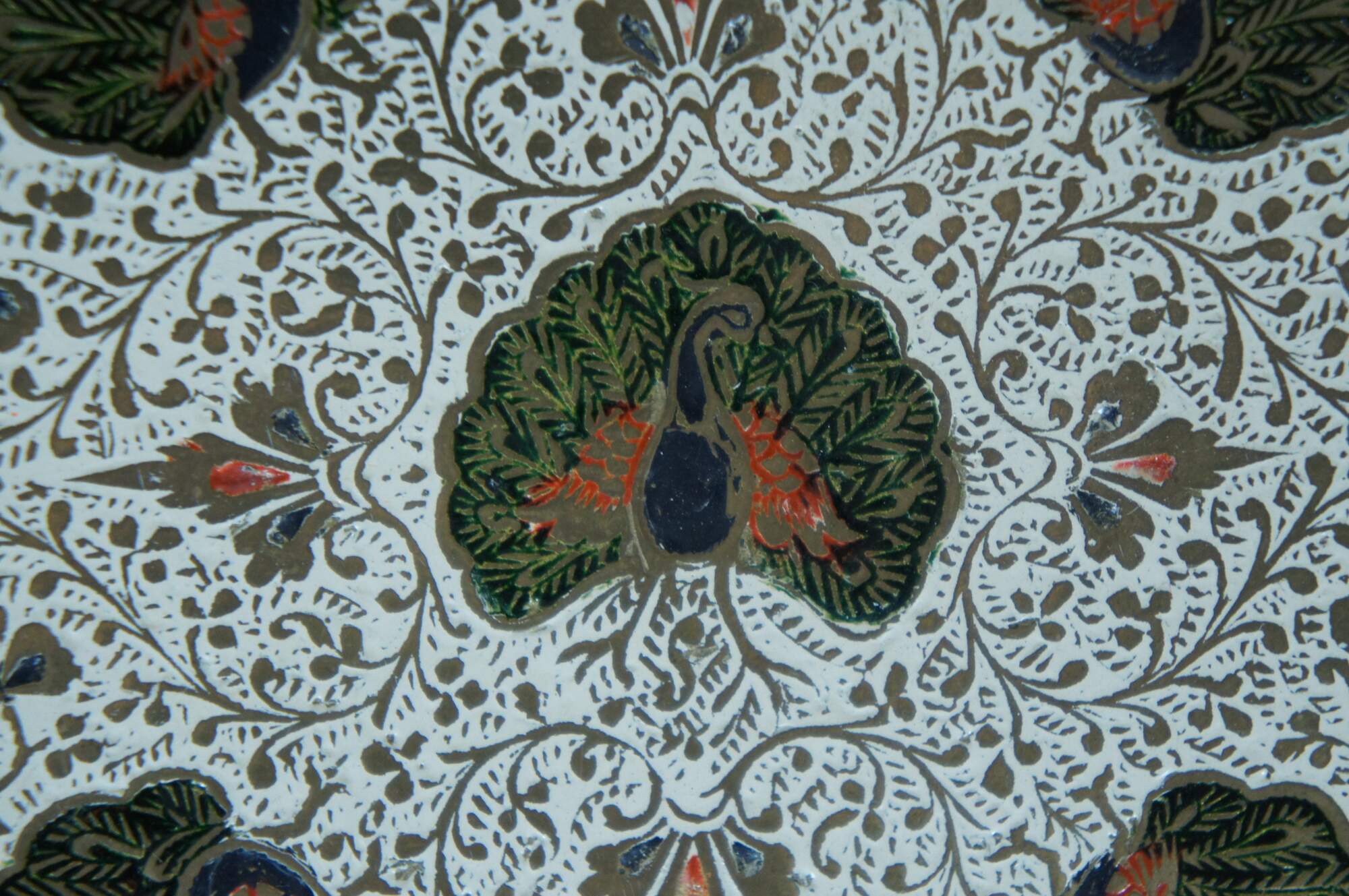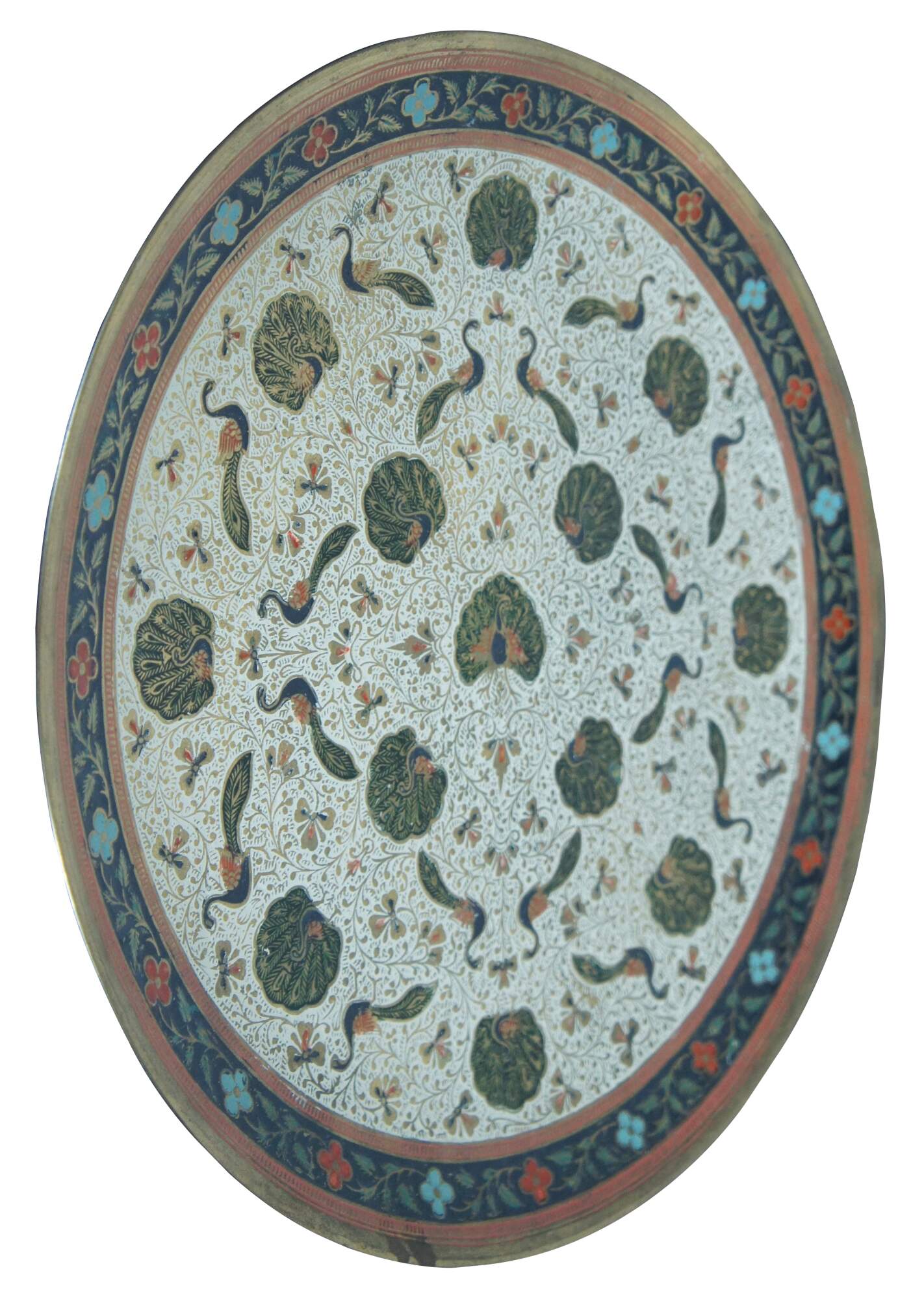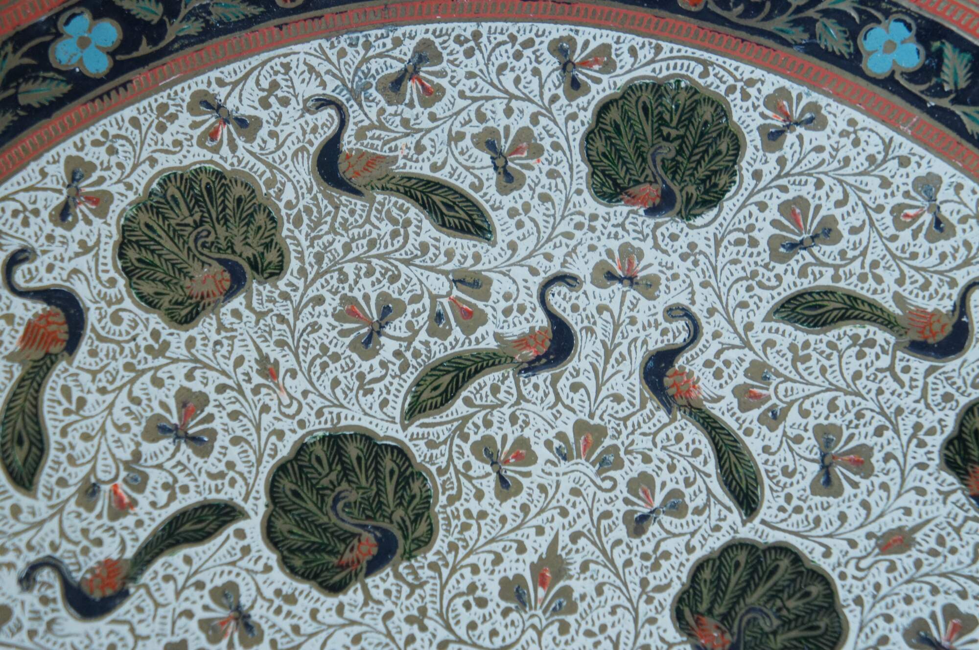 Vintage enameled Moroccan brass serving plate or charger decorated with a pattern of peacocks and gingko leaves on a white ground, encircled with a border of red and blue flowers. Back sports a hook for display on the wall. Originally sold by Bombay Swadeshi Stores Limited.
