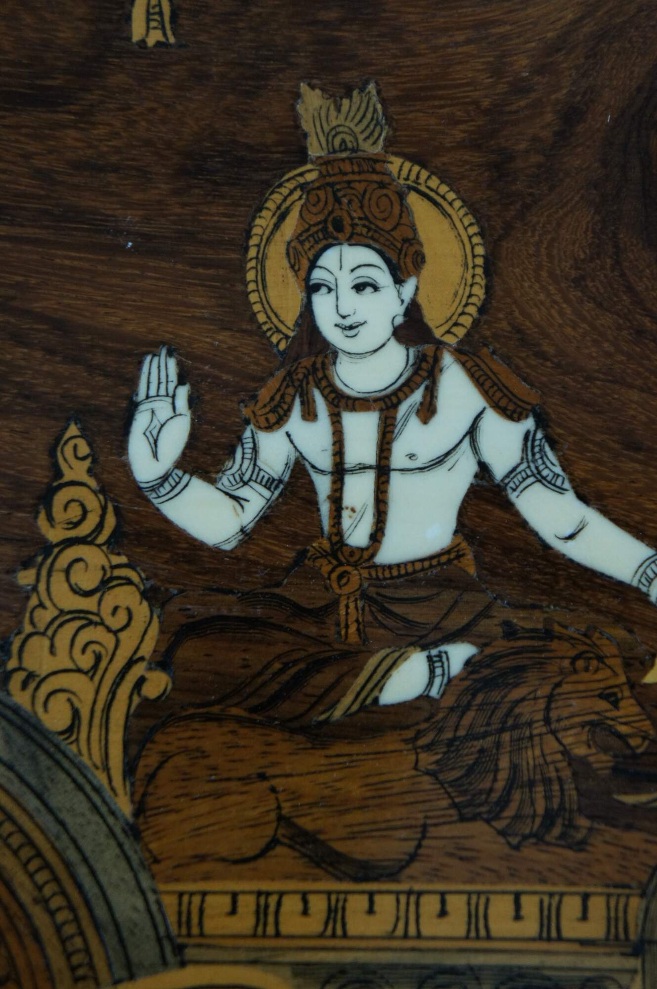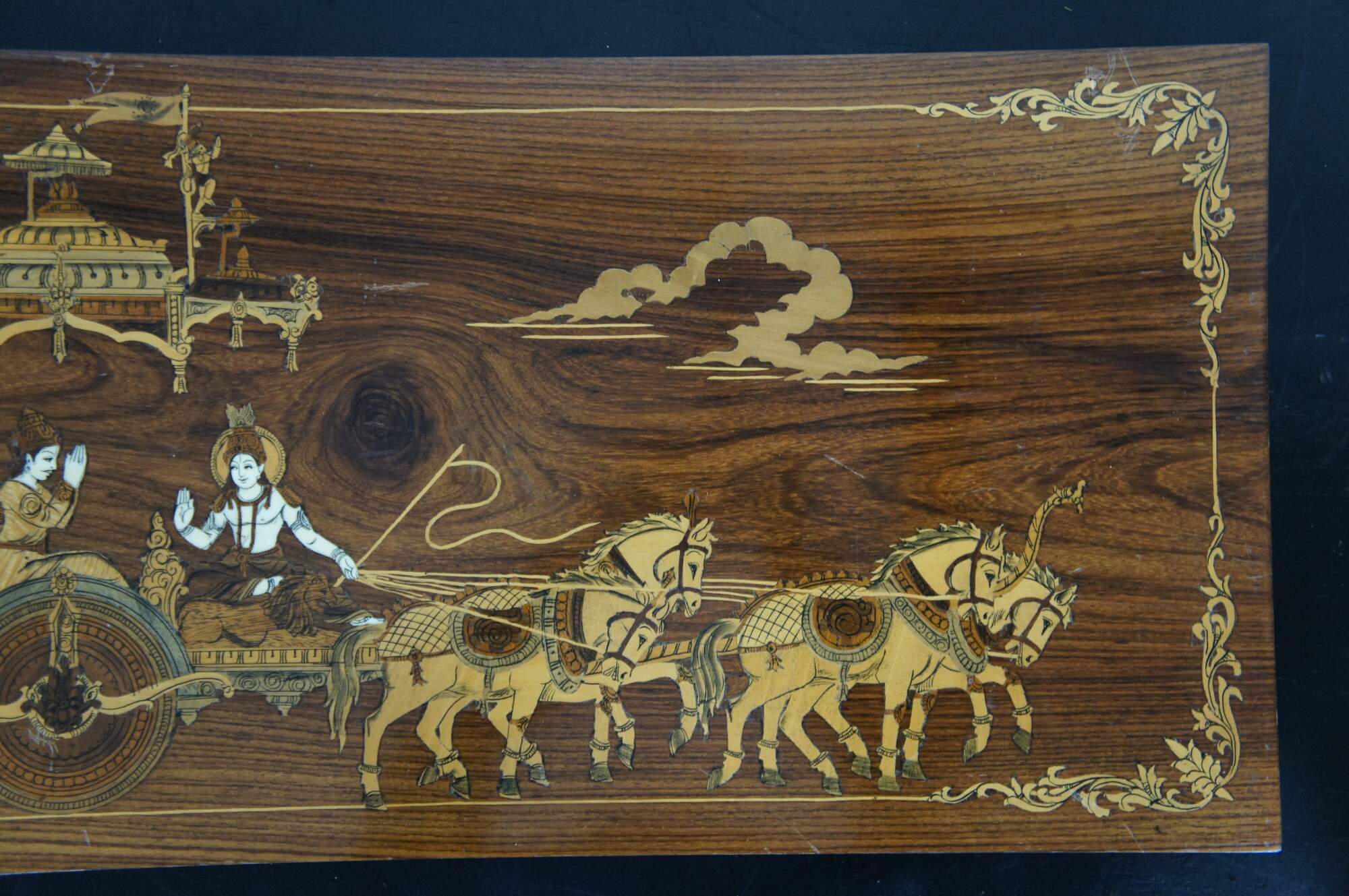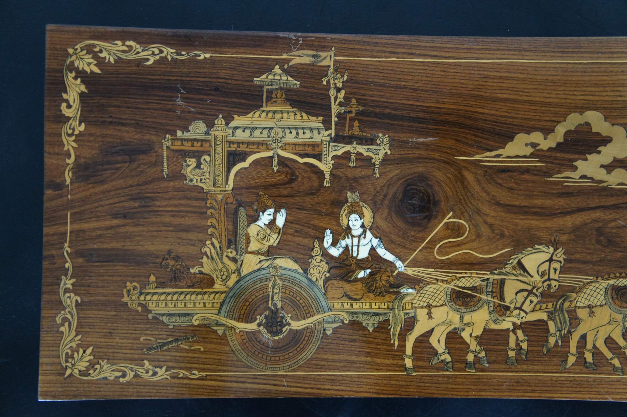 Beautiful Indian / Hindu inlaid wood panel depicting the Hindu god Krishna driving the chariot of warrior-prince Arjuna from the Bhagavad Gita.