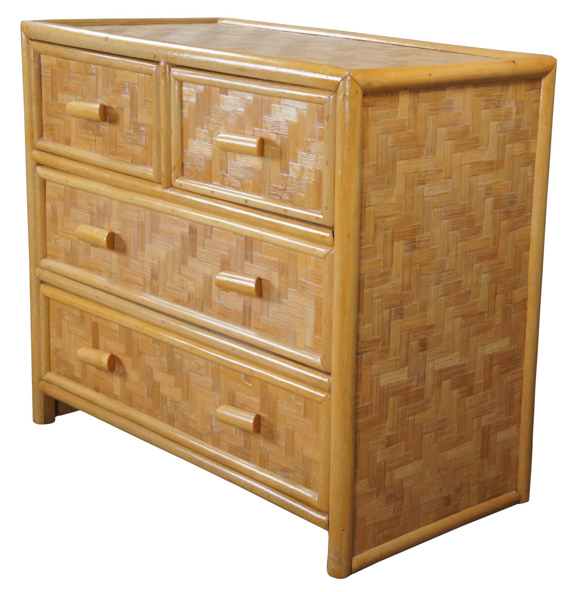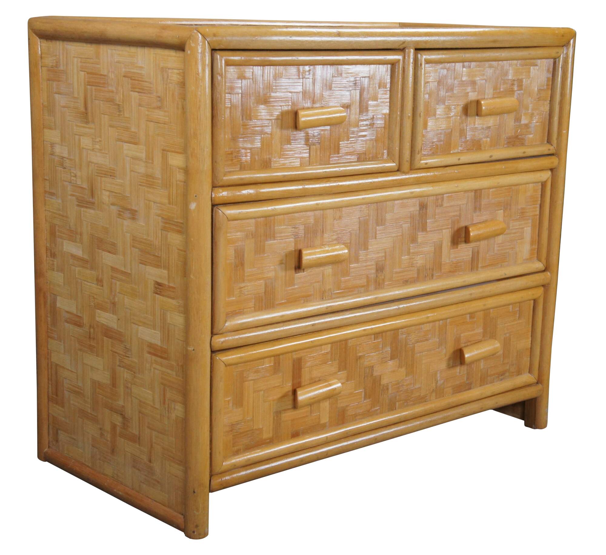 Vintage Hollywood Regency / Bohemian dresser, circa last quarter 20th century. Features a bamboo frame with geometric rattan panels. Includes 4 drawers