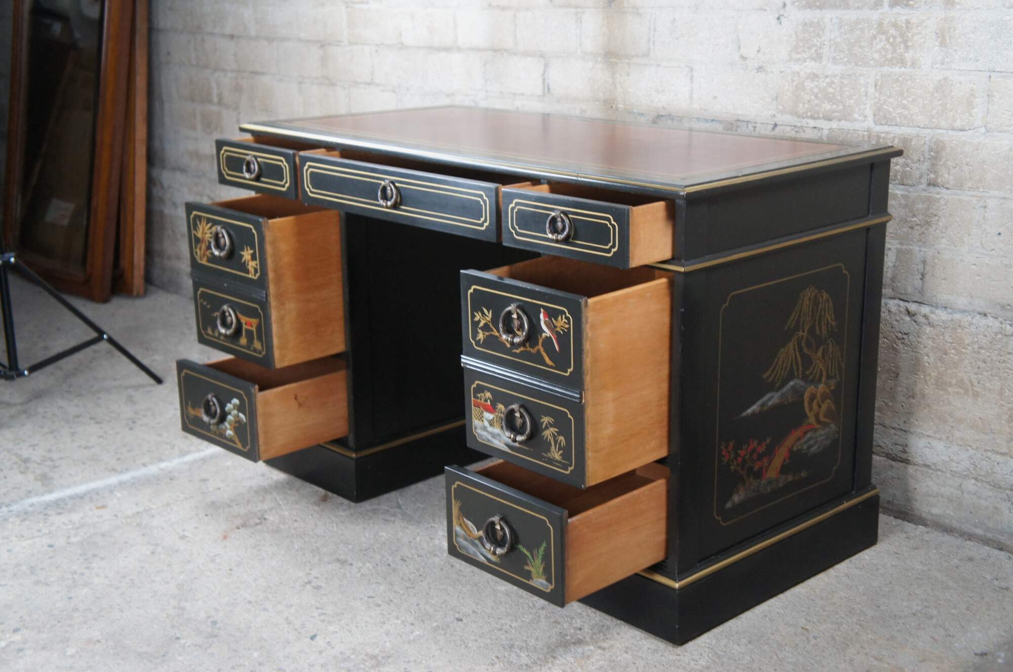 Vintage Sligh Furniture black lacquered knee hole writing desk featuring Chinoiserie styling with seven drawers, a tooled red leather top, and floral landscape motif that features birds, bridges, boats, pagodas and bamboo.