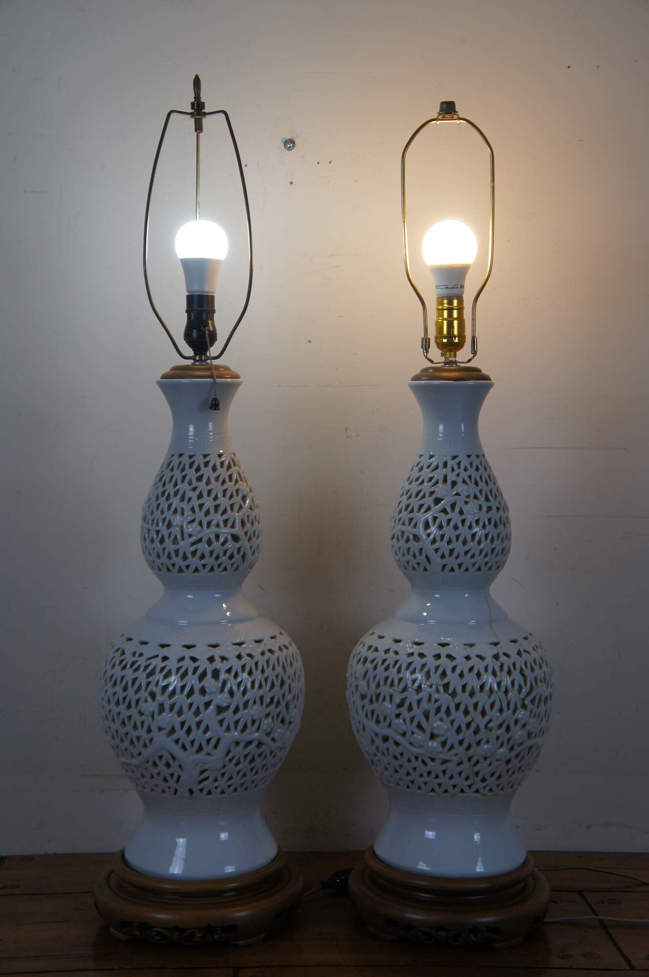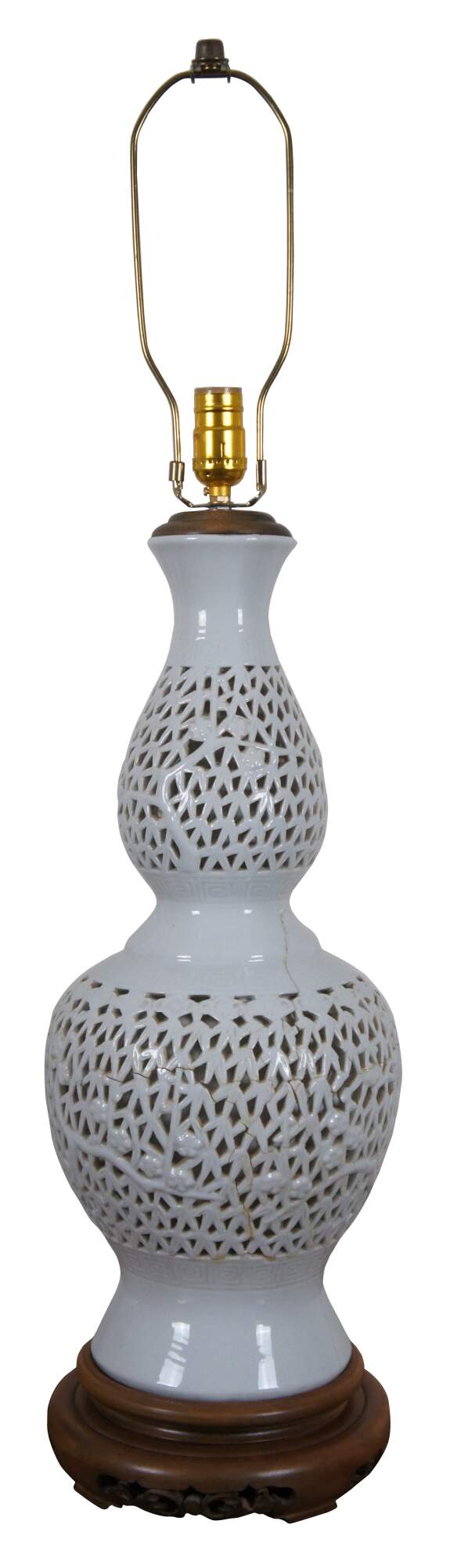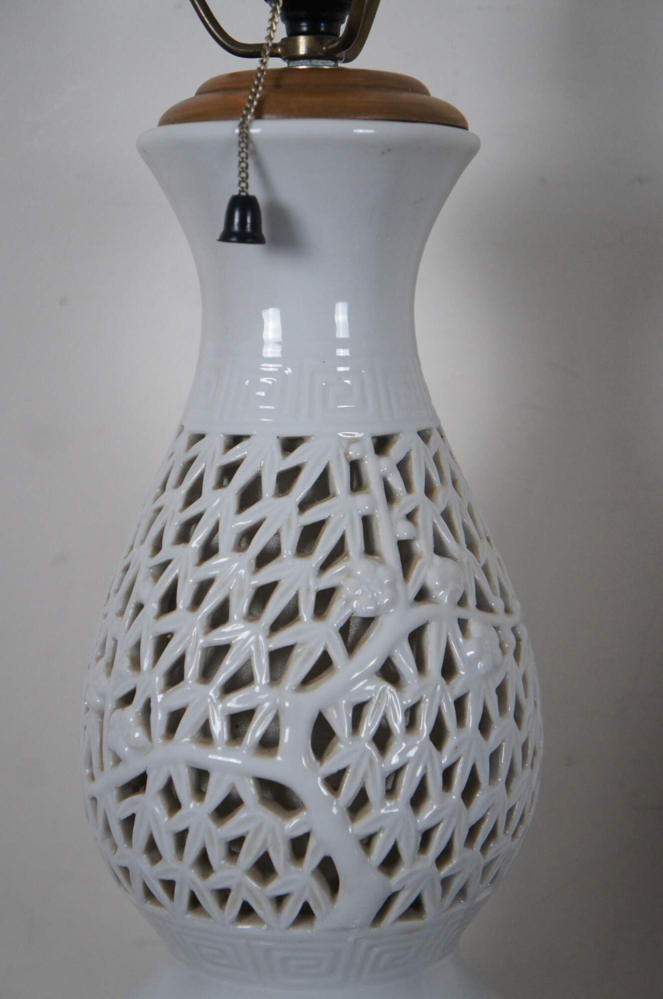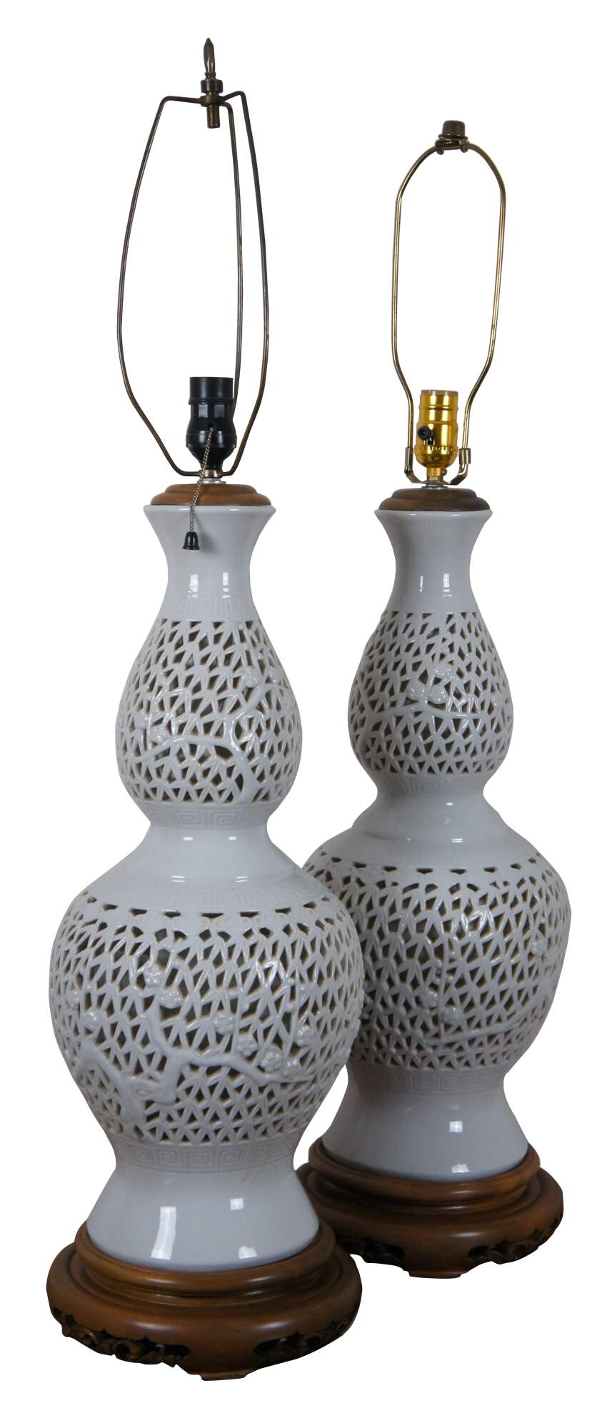 Pair of mid century blanc de chine reticulated porcelain table lamps with wood base and cap, featuring a gourd shaped form pierced with a design of bamboo stalks and leaves.