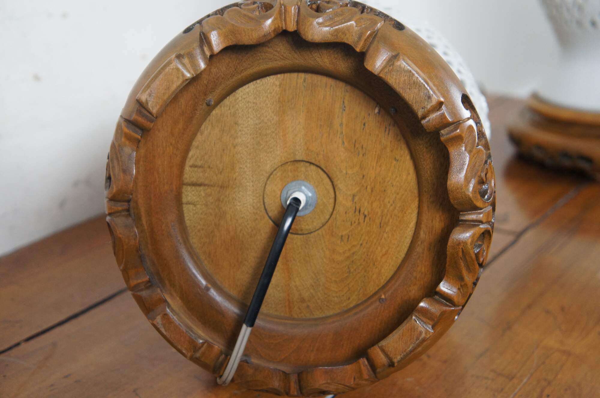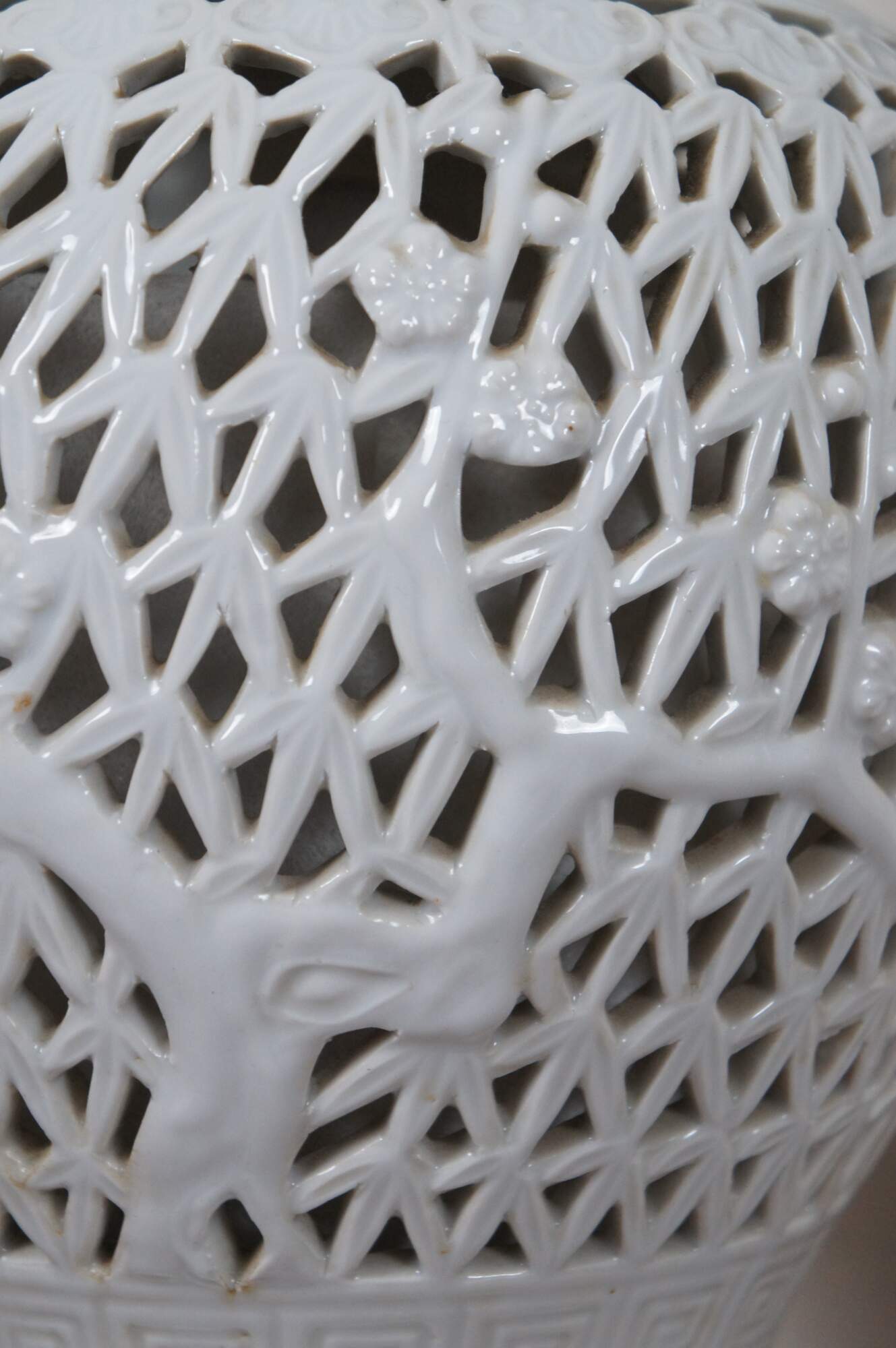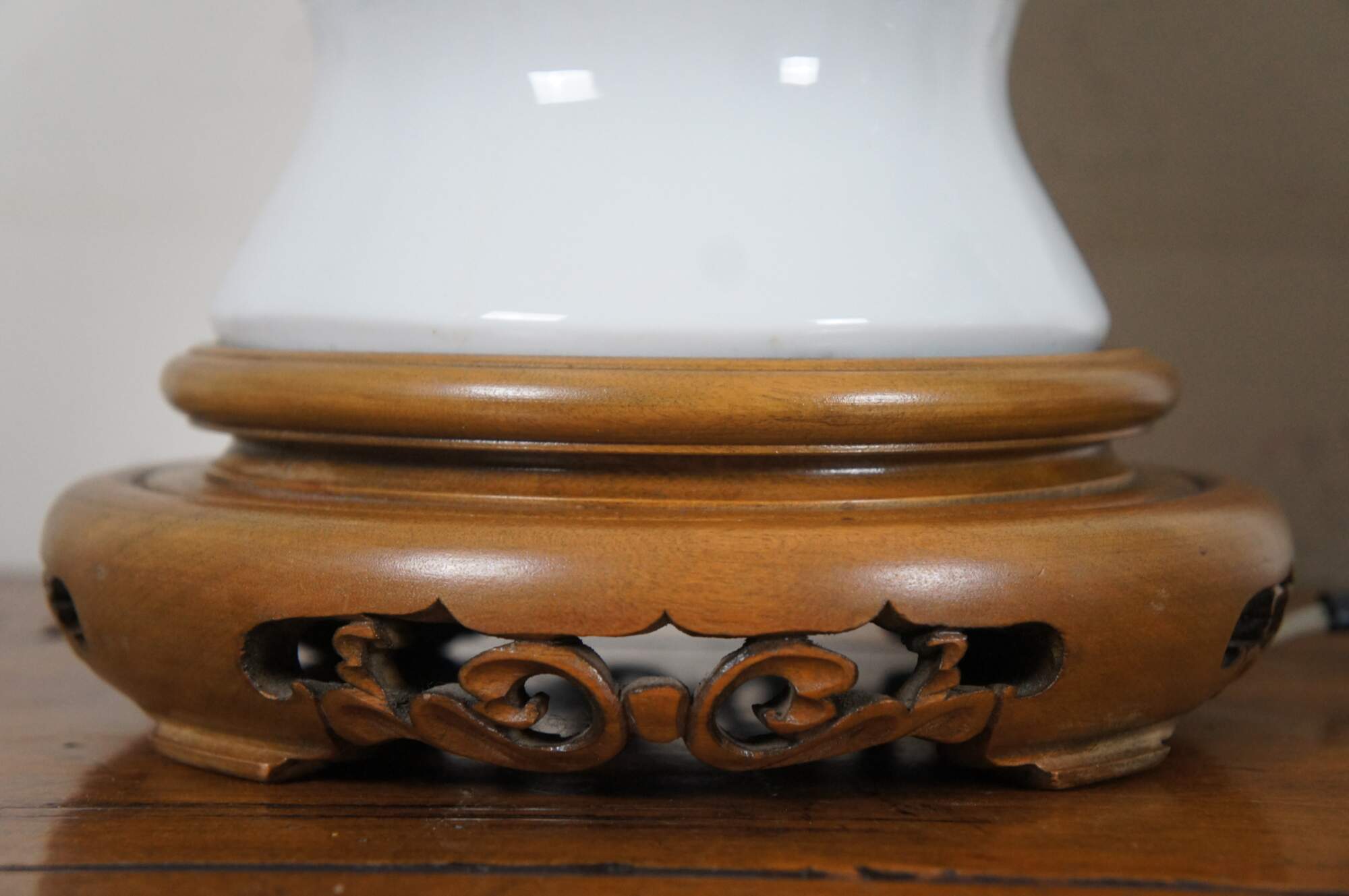 Pair of mid century blanc de chine reticulated porcelain table lamps with wood base and cap, featuring a gourd shaped form pierced with a design of bamboo stalks and leaves.