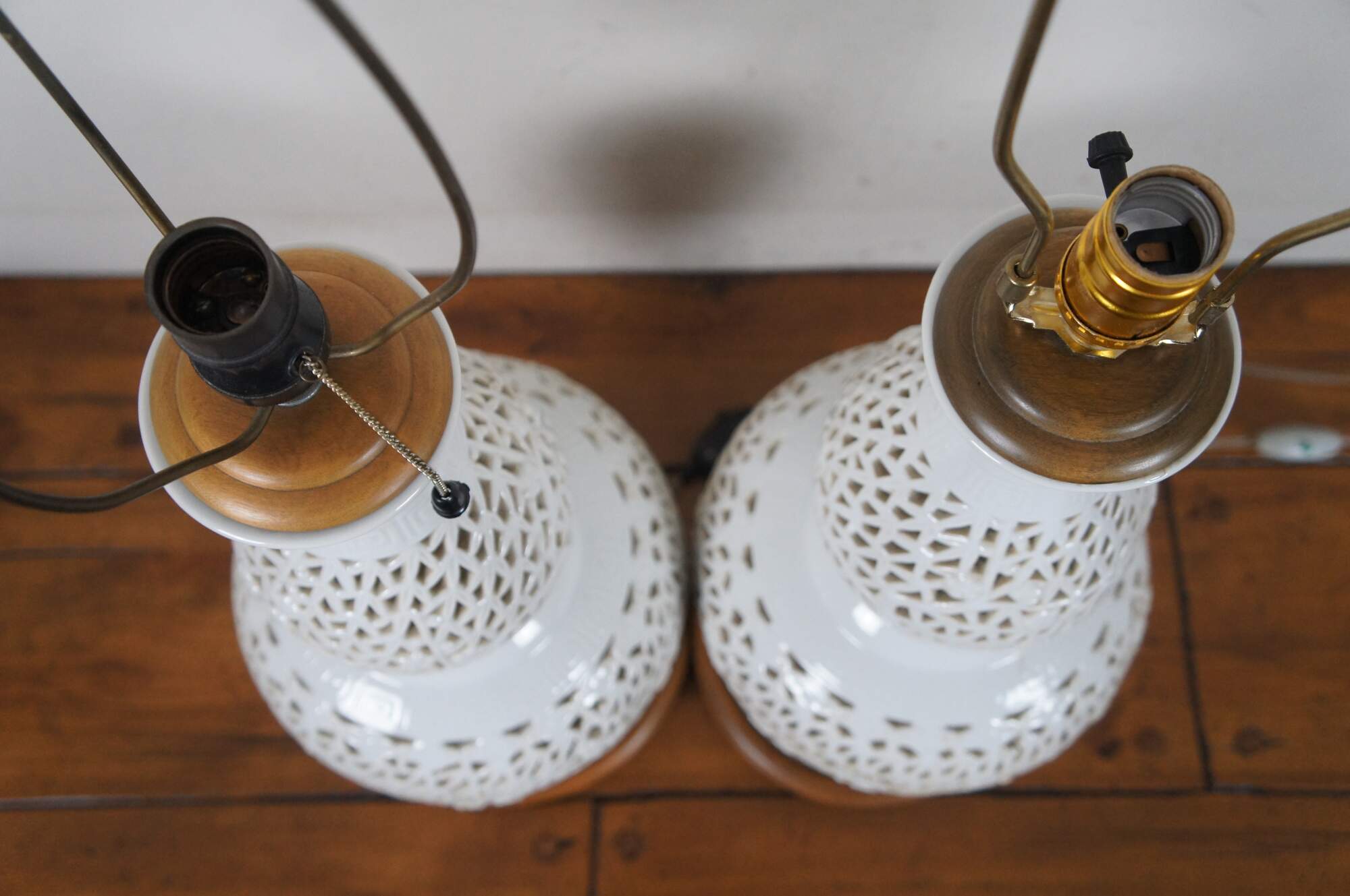 Fair Condition - Repairs to side of one; some stains; some damage to one cord (electrical taped); mismatched harps; wood topper of one slightly loose