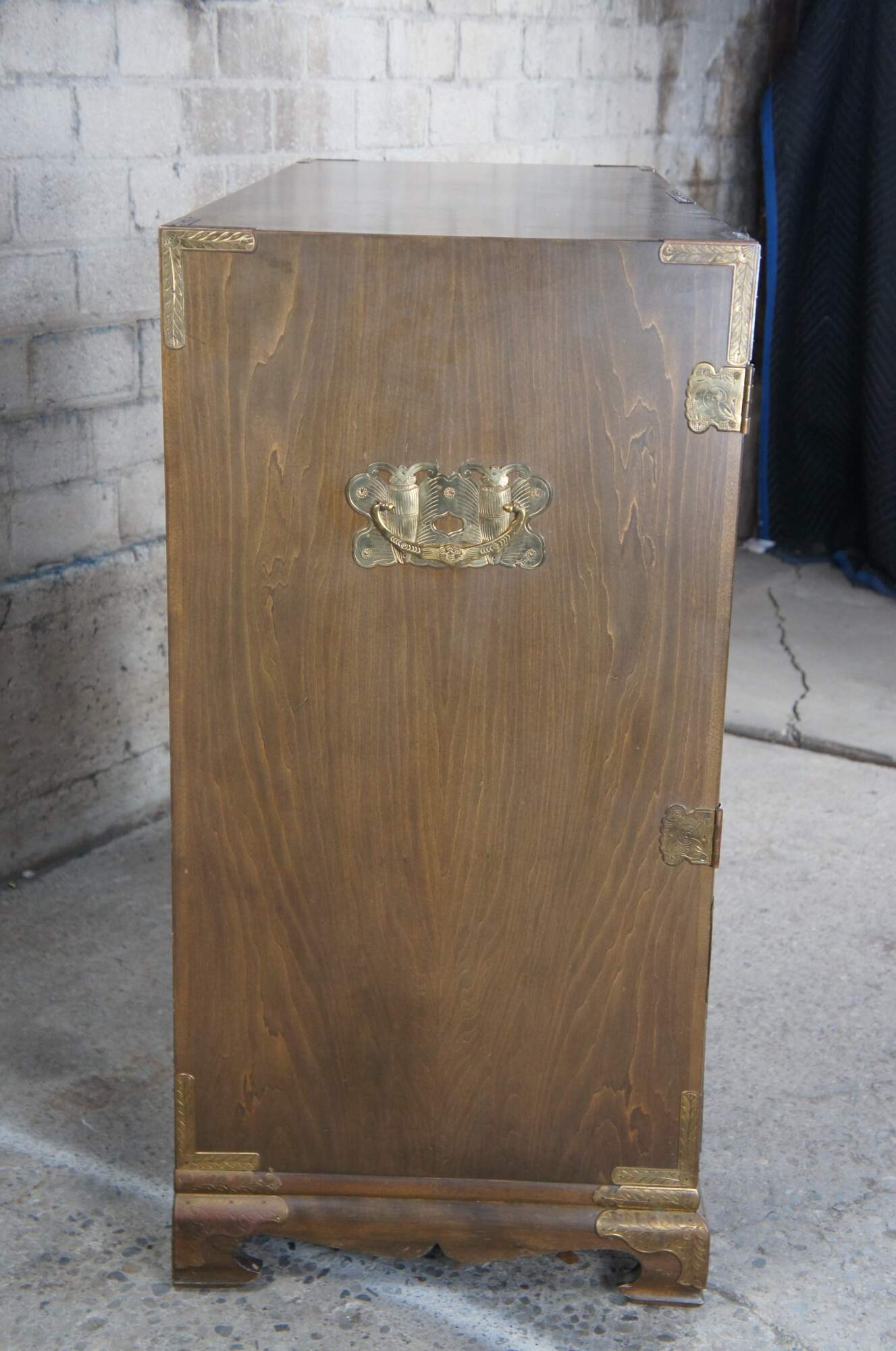 Mid-century Korean pine brass mounted silverware chest, sideboard / tansu. Featuring profuse engraved brass butterfly and medallion mounts, two blind doors revealing eight fitted interior upper drawers, and one lower long drawer. Includes ornate brass lock and key.