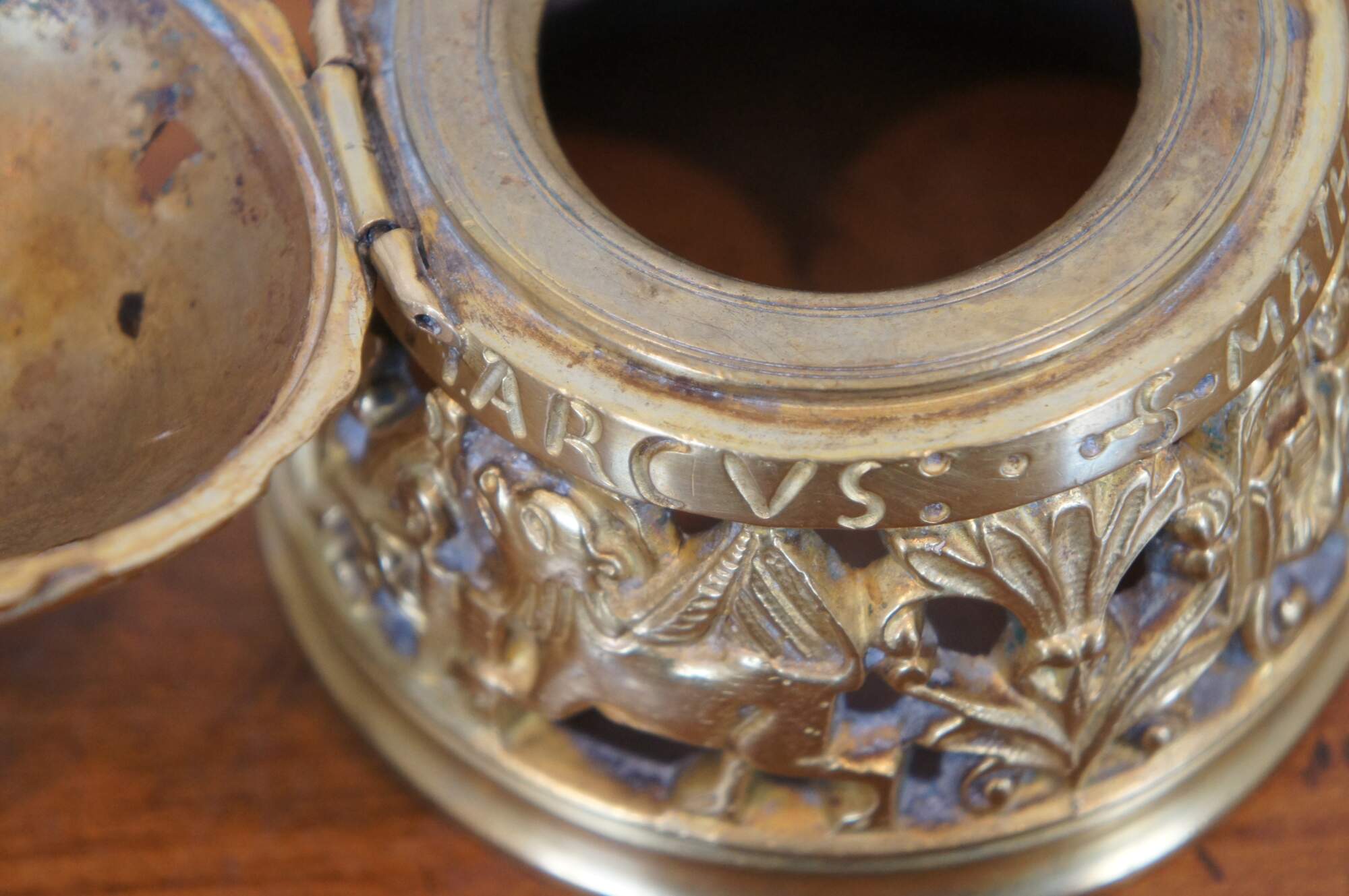 Vintage brass Christian sanctuary bell shaped inkwell with hinged lid and a pierced design showing the Latin names of the four Gospel writers and their animal symbols.