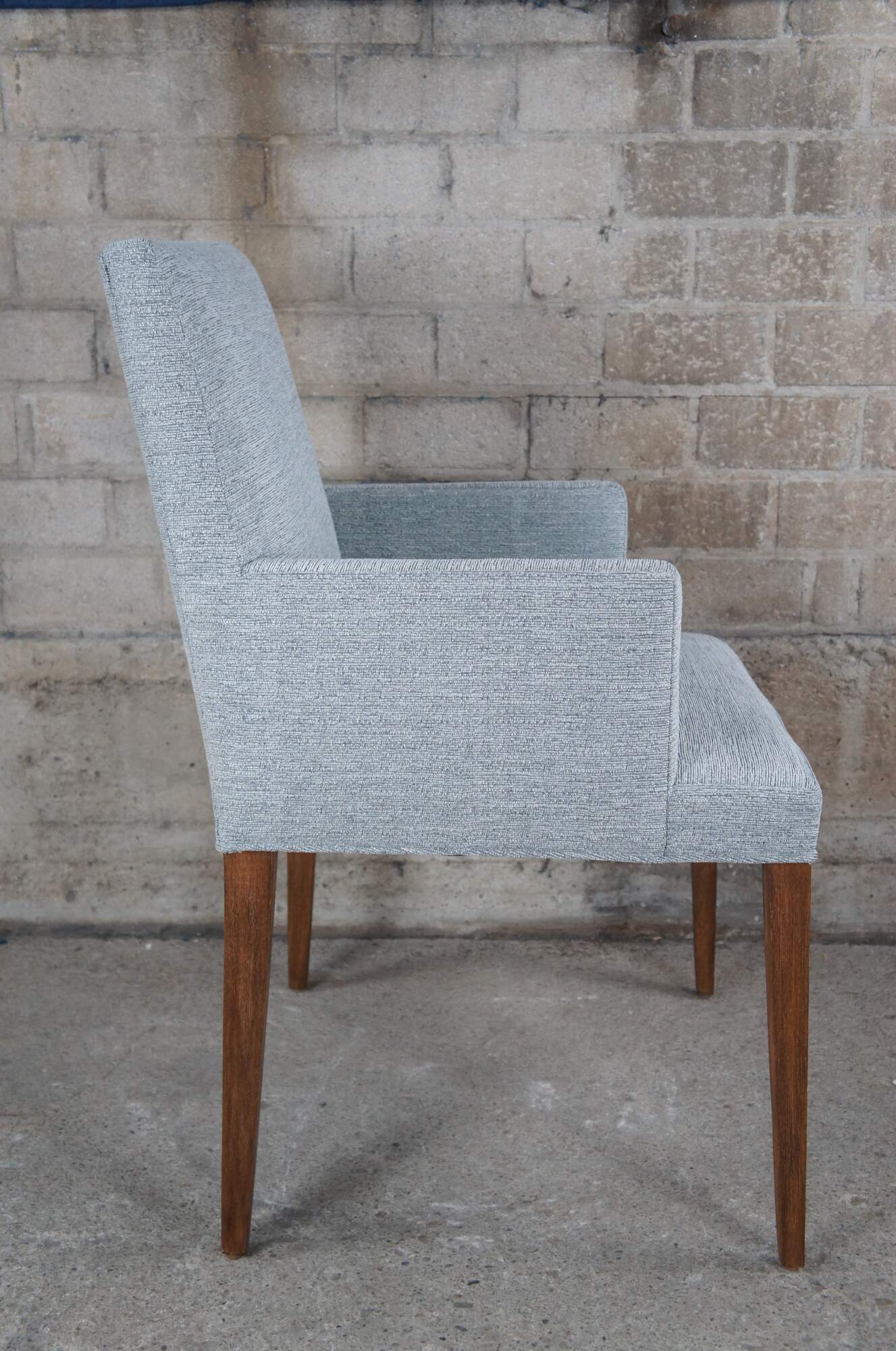 Six vintage dining armchairs featuring modern styling gray upholstery and tapered walnut finished legs