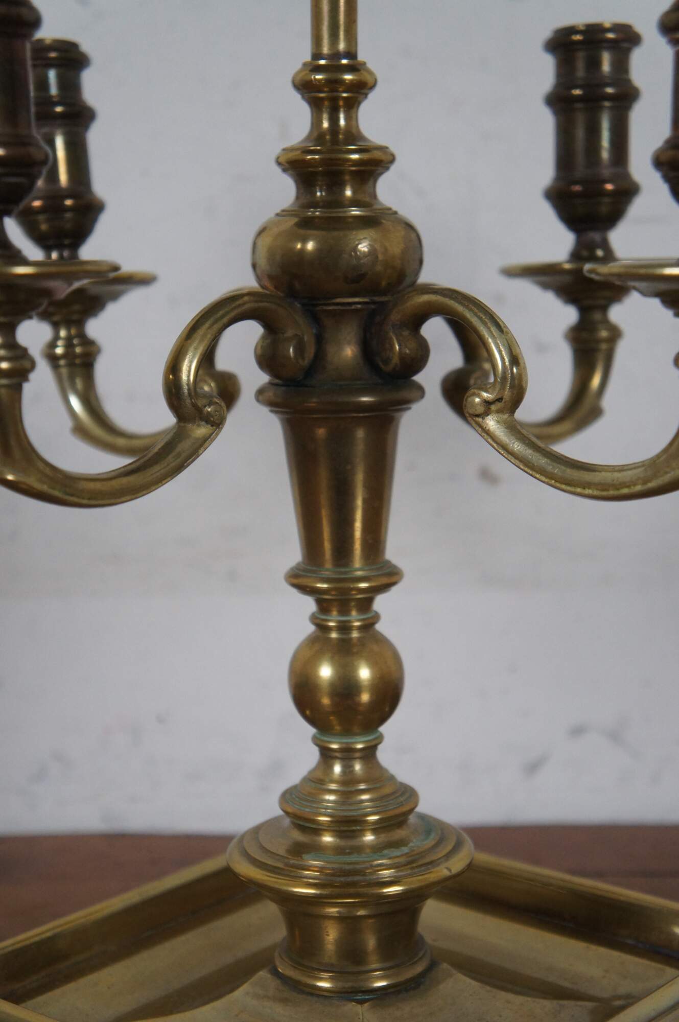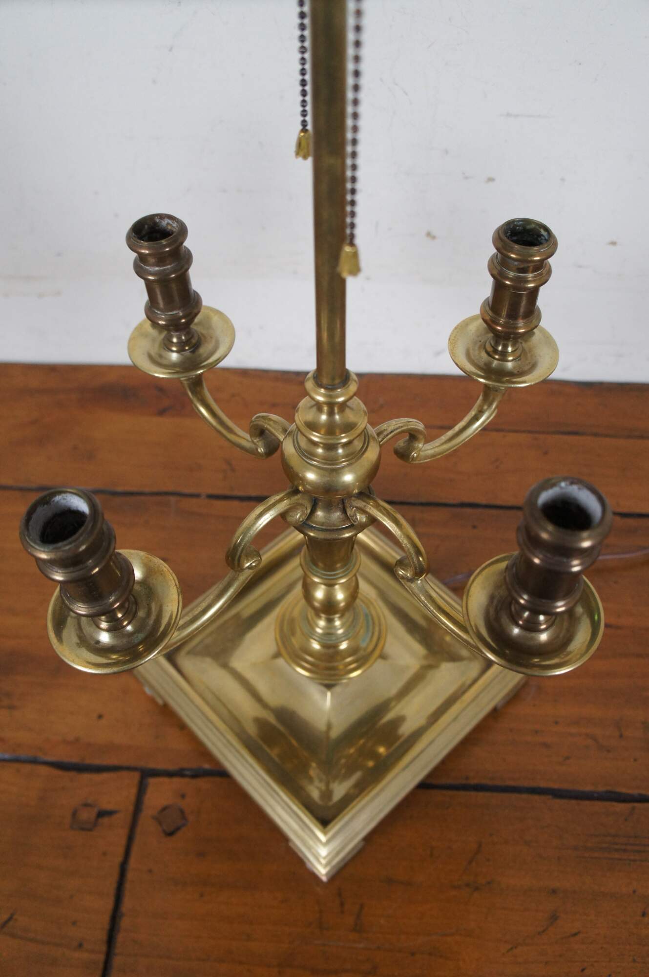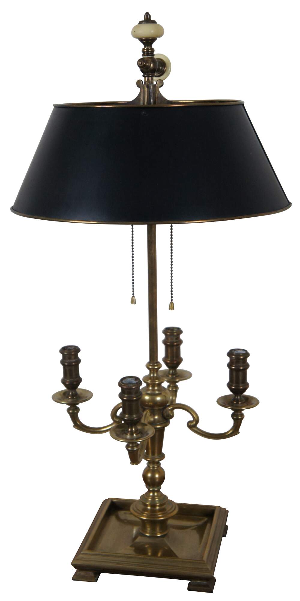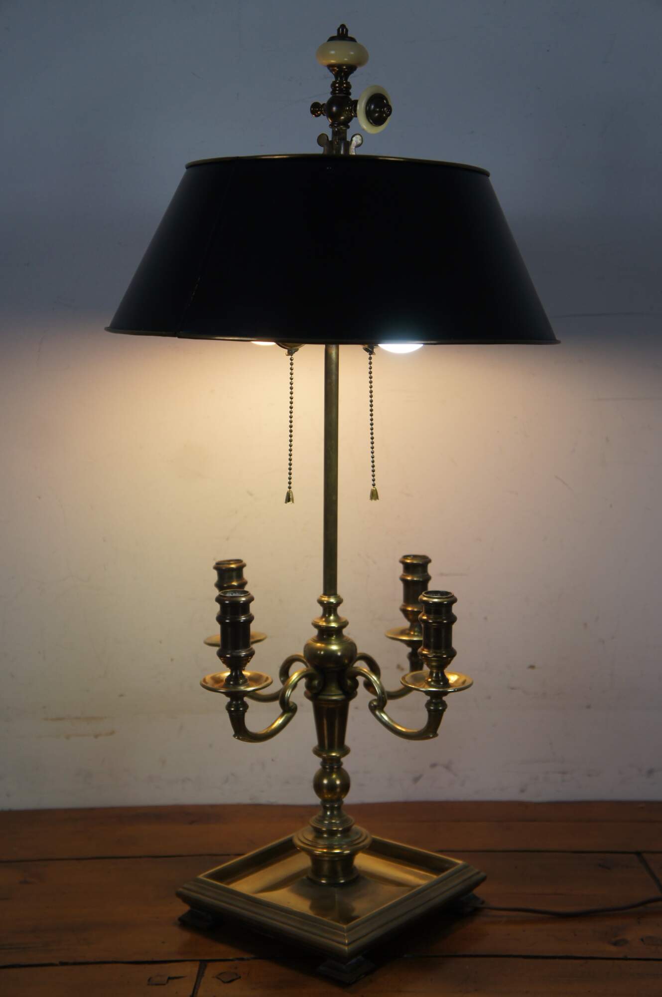 Vintage 1972 Chapman French bouillotte style table lamp with square base, four candlesticks, two lights and black tole metal shade.