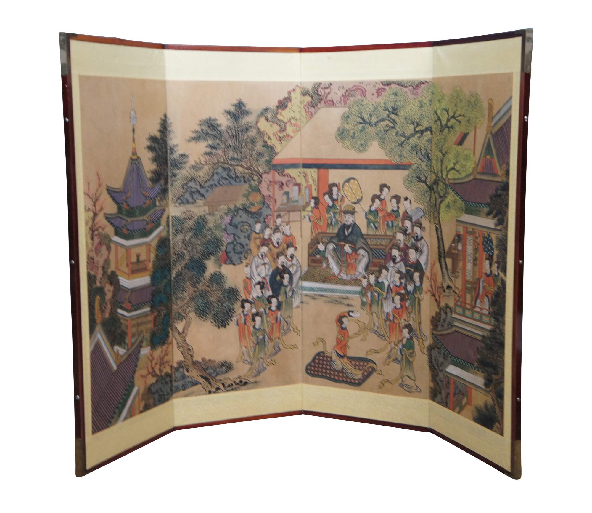Mid 20th century vintage four panel folding screen / room divider / wall art featuring a printed scene with hand painted color depicting a banquet honoring Guo Zi Yi (697–781), a famed general of China’s Tang dynasty (618–907). In addition to his individual achievements, he lived until he was 85 years old, and his children and family were also successful. Thus he became a paragon of Confucian loyalty and fortitude, and even deified in popular religion as a god of wealth and happiness. As such, images celebrating Guo Ziyi became popular in Joseon during the 19th century. He is depicted at a banquet in his honor, enjoying a dance performance surrounded by his large family, Geishas, musicians in a palatial residence with Pagodas, flowering trees, cranes, deer, and birds. Gwakbunyang-haengnakdo.