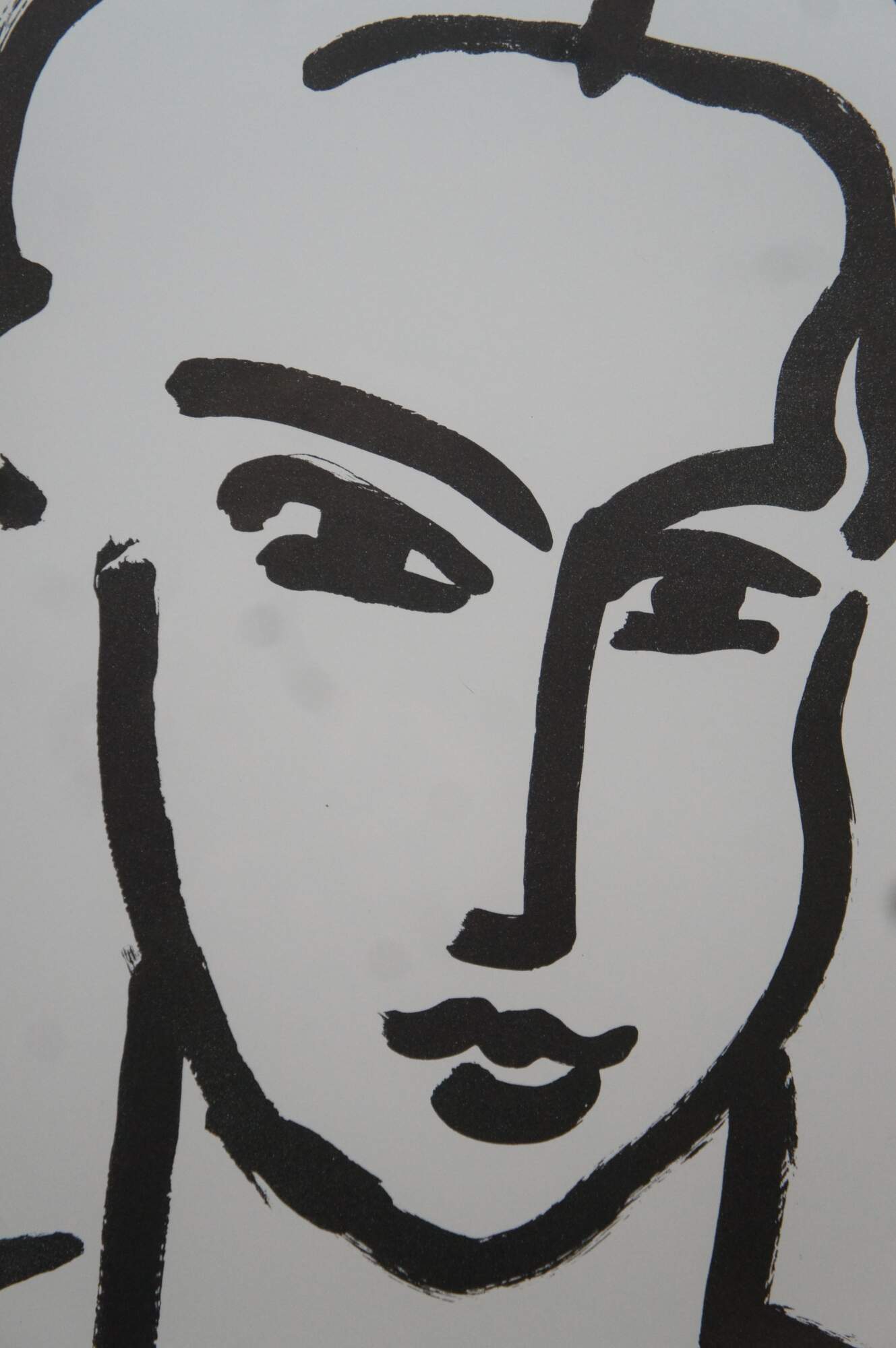 Framed poster print advertising the 1964 exhibition of Matisse – Lithographies – Eux Fortes at the Galerie Adrien Maeght, featuring Grande Tete de Katia. Framed in white with bright yellow mat.