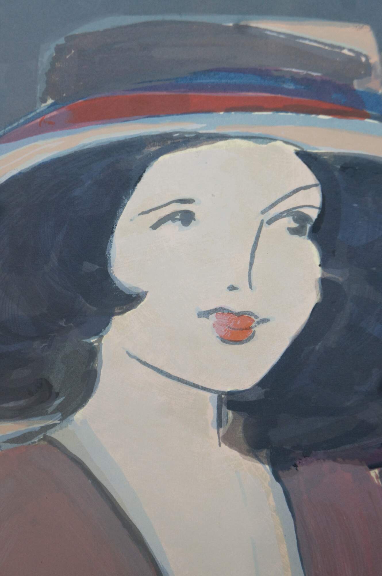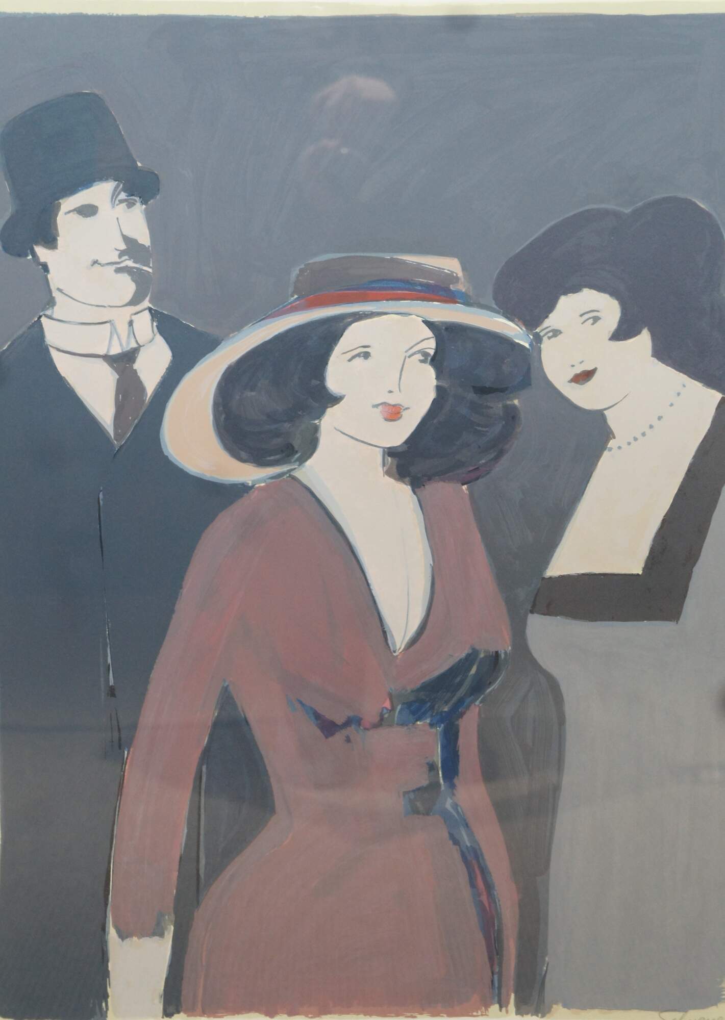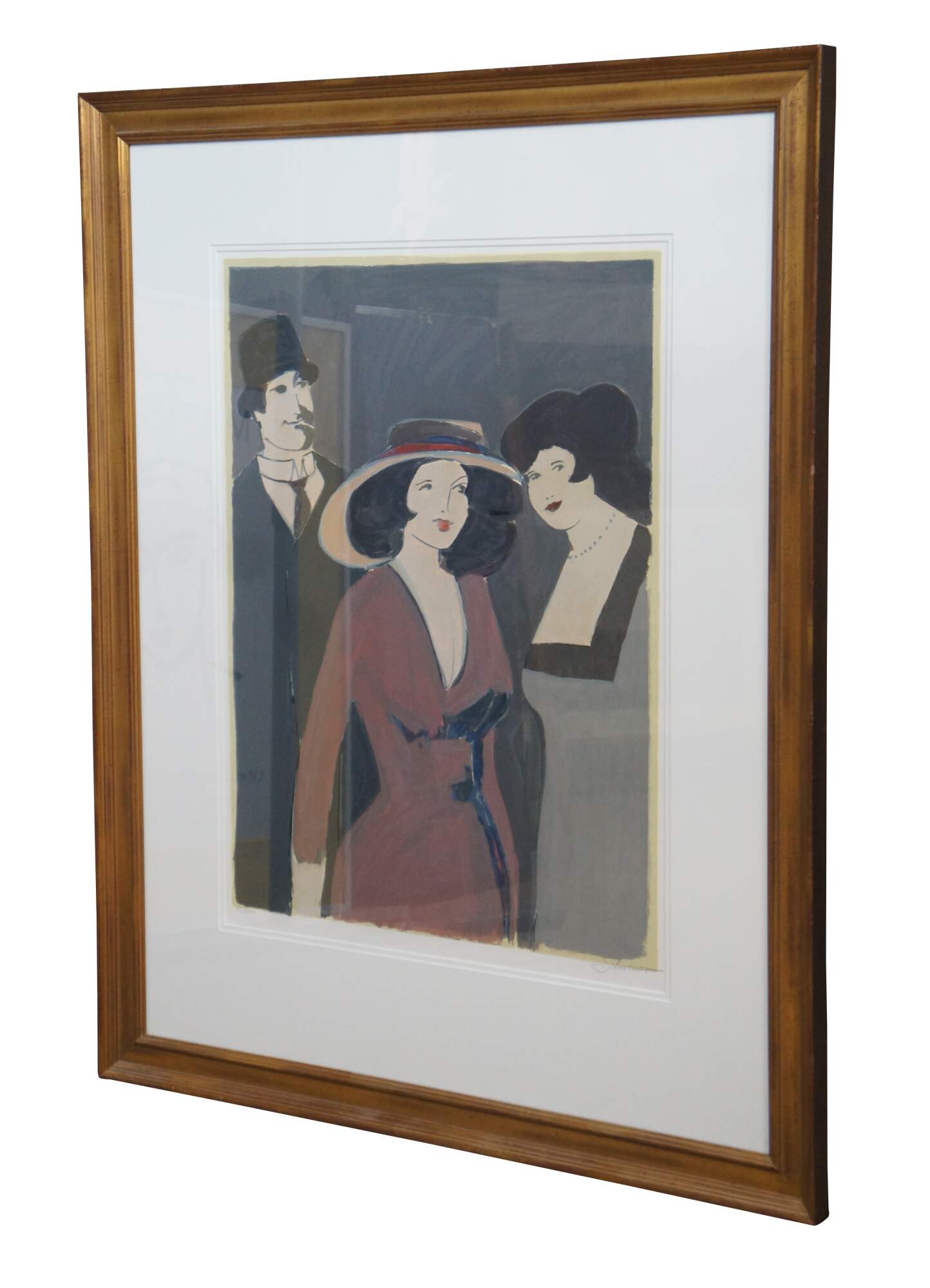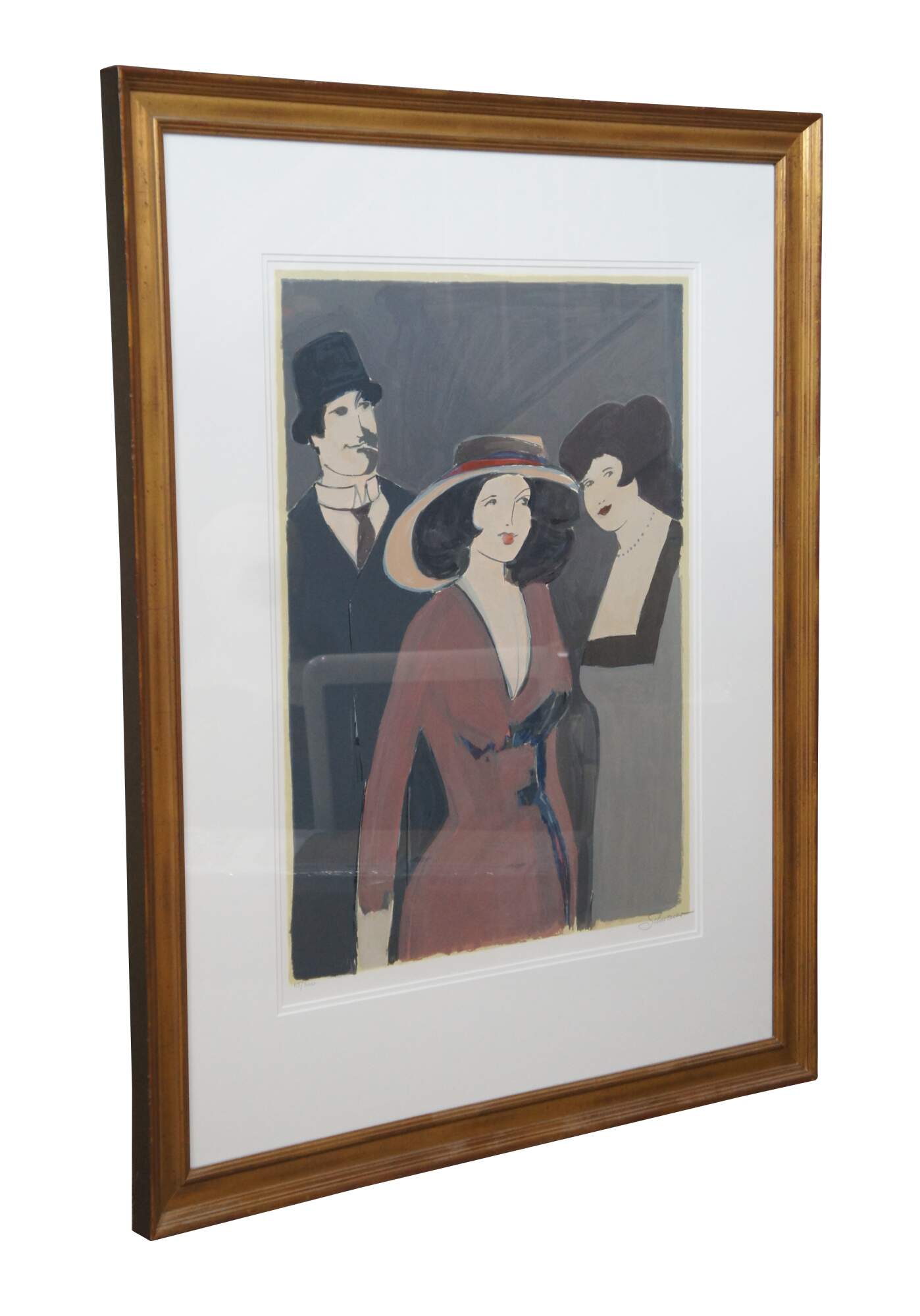 Vintage limited edition expressionist lithograph print by David Schneuer depicting a woman in a red dress and hat, flanked on either side by another woman in gray and a man in a suit; penciled signed and numbered 115/300. Titled La Belle / Madame in Red / Dame in Rot.